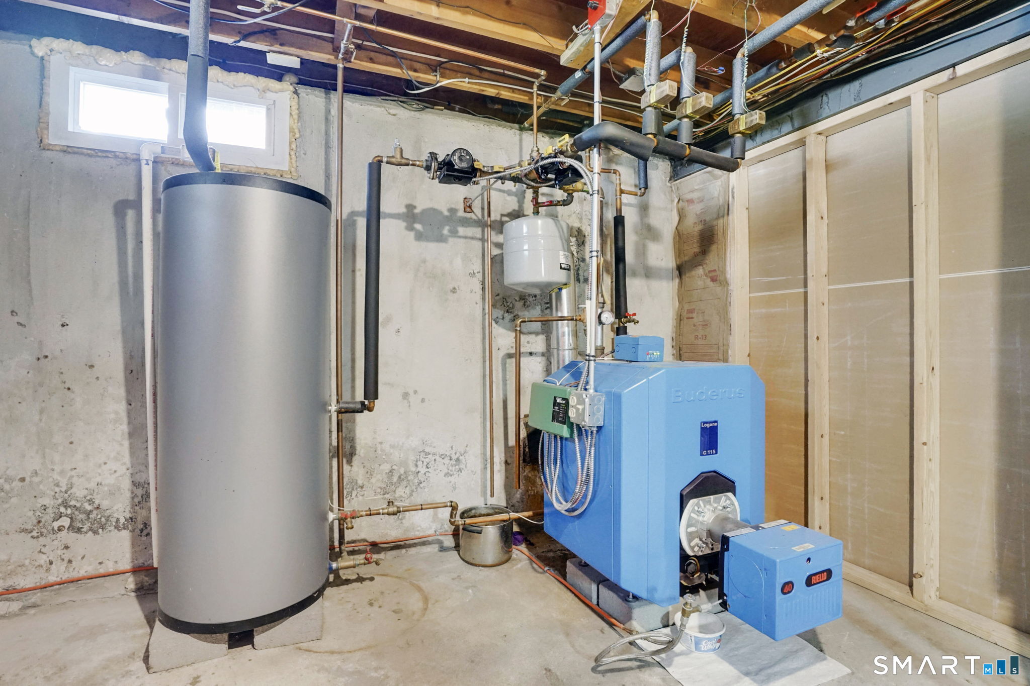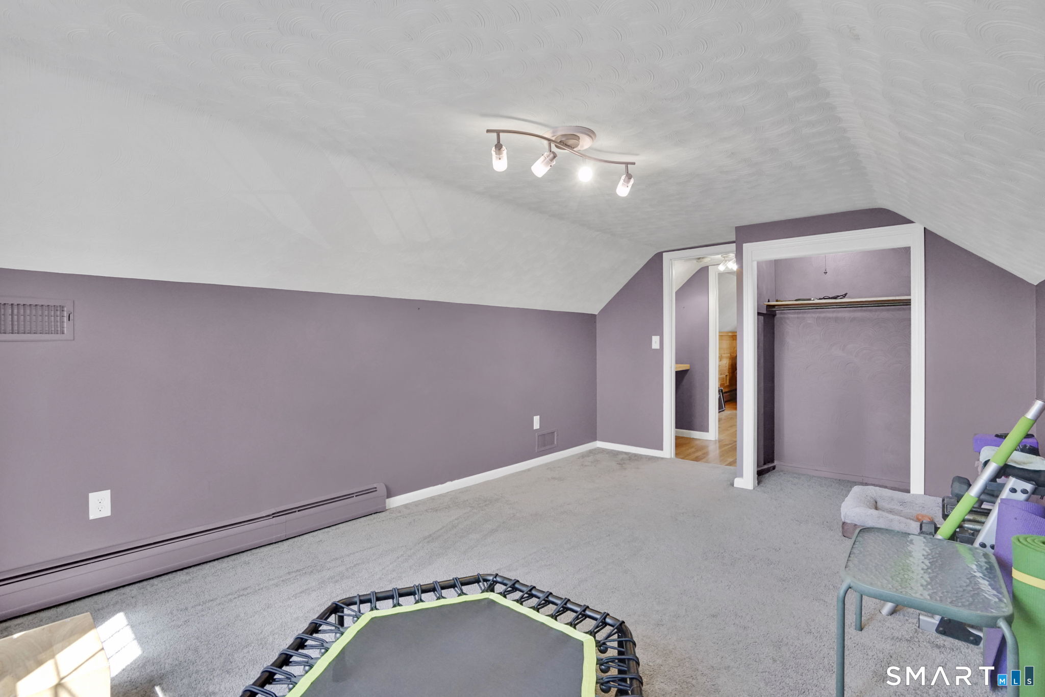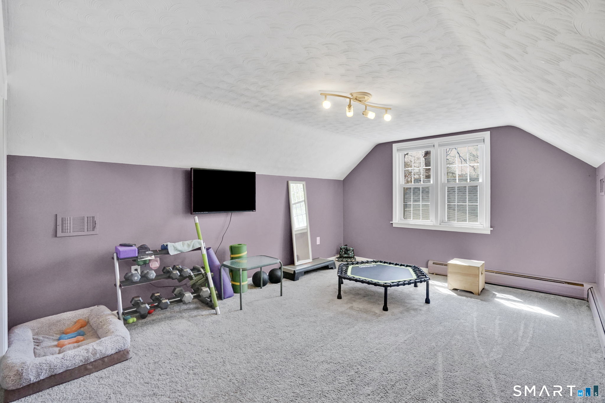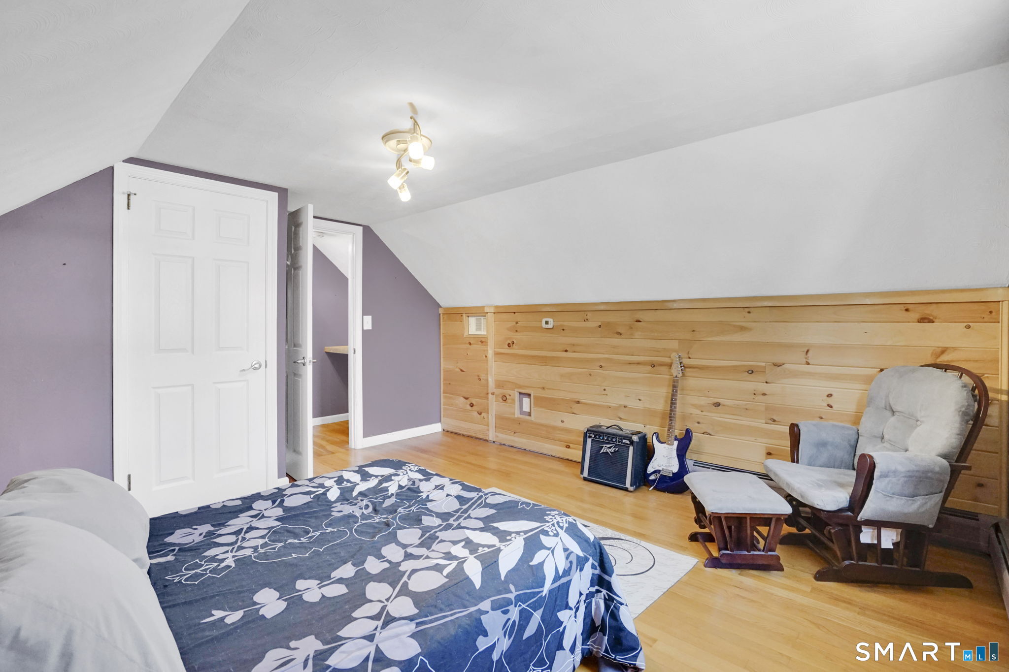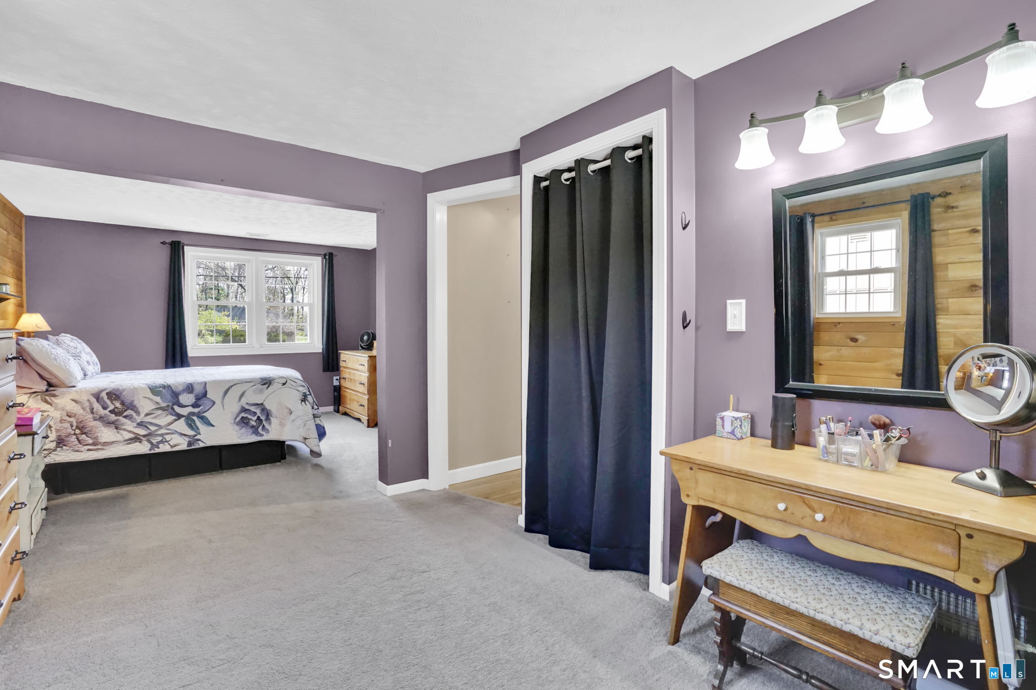 Welcome home to 34 Wagon Rd in Enfield, CT! This beautifully updated 3-4 bedroom Cape offers over 1,500 sq ft of versatile, move-in-ready living space-perfect for first-time buyers or those seeking convenient single-level living. Enter through the side driveway into a spacious family room featuring a vaulted ceiling, cozy pellet stove, and direct access to a stamped concrete patio and backyard retreat. The fully remodeled kitchen is truly the heart of the home, showcasing a stunning 9-foot granite island with seating for four, dark cabinetry, a light gray tiled backsplash, and newer stainless steel KitchenAid induction range, microwave hood, and Samsung refrigerator. The open-concept layout seamlessly connects the kitchen to both the living and family rooms, making it ideal for entertaining. Down the hall, you'll find a fully renovated bathroom with a sleek sliding frosted glass door, Corian-topped vanity, and beautifully tiled shower surround. The main level also features a spacious primary bedroom with stylish wood accent walls. Upstairs offers two additional well-sized bedrooms.Step outside through the double sliders to your private backyard oasis-thoughtfully designed with four distinct spaces, including a cabana hot tub ready, a fully equipped and covered grilling station, and two entertainment decks with arbor/shade. Surround sound indoors and outdoors enhances the experience, while white vinyl fencing and professional landscaping provide both privacy and charm.