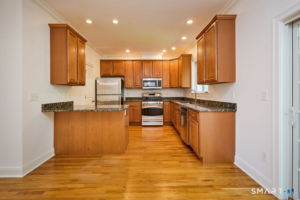 Welcome to Bradley Commons, a private gated enclave in the heart of Westport's vibrant Saugatuck neighborhood-just minutes to the train, Compo Beach, top-rated schools, and premier dining and shopping. This exceptional end-unit townhome features a bright open floor plan with hardwood floors, high ceilings, and abundant natural light. The chef's kitchen offers granite countertops, gas range, French door refrigerator, large pantry, and breakfast bar, flowing seamlessly into the dining area with sliders to a private deck-ideal for entertaining. The sun-filled living room with eastern exposure includes a gas fireplace, powder room, and generous closet space. Upstairs, the spacious primary suite boasts walk-in closets and a luxurious ensuite bath with double vanity and oversized shower. A second en-suite bedroom and upper-level laundry provide comfort and convenience. The versatile lower level is perfect for a guest suite, office, gym, or den, with direct access to a private patio and yard, plus ample storage and entry to the attached one-car garage. Beautifully maintained with professional landscaping and abundant guest parking, Bradley Commons offers turnkey living in an unbeatable location.