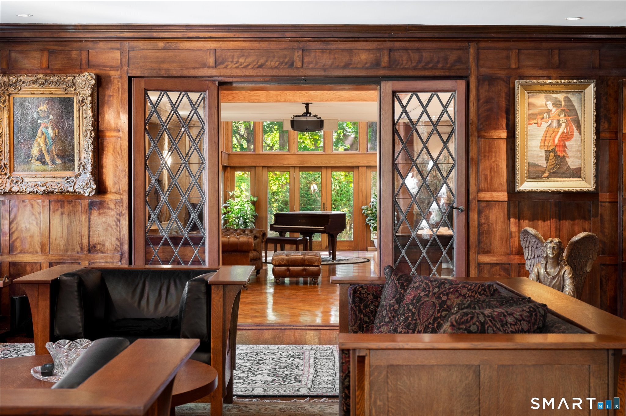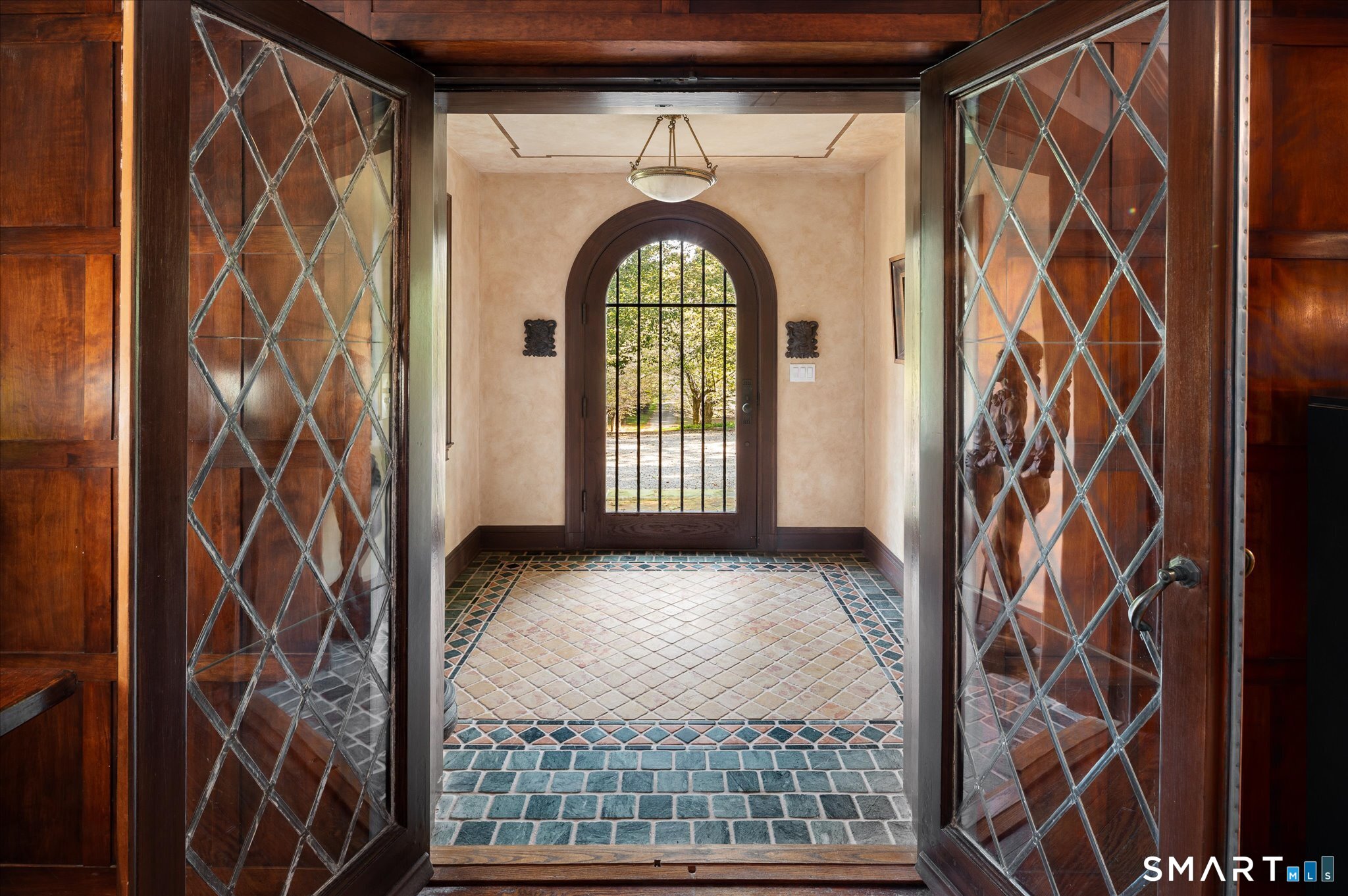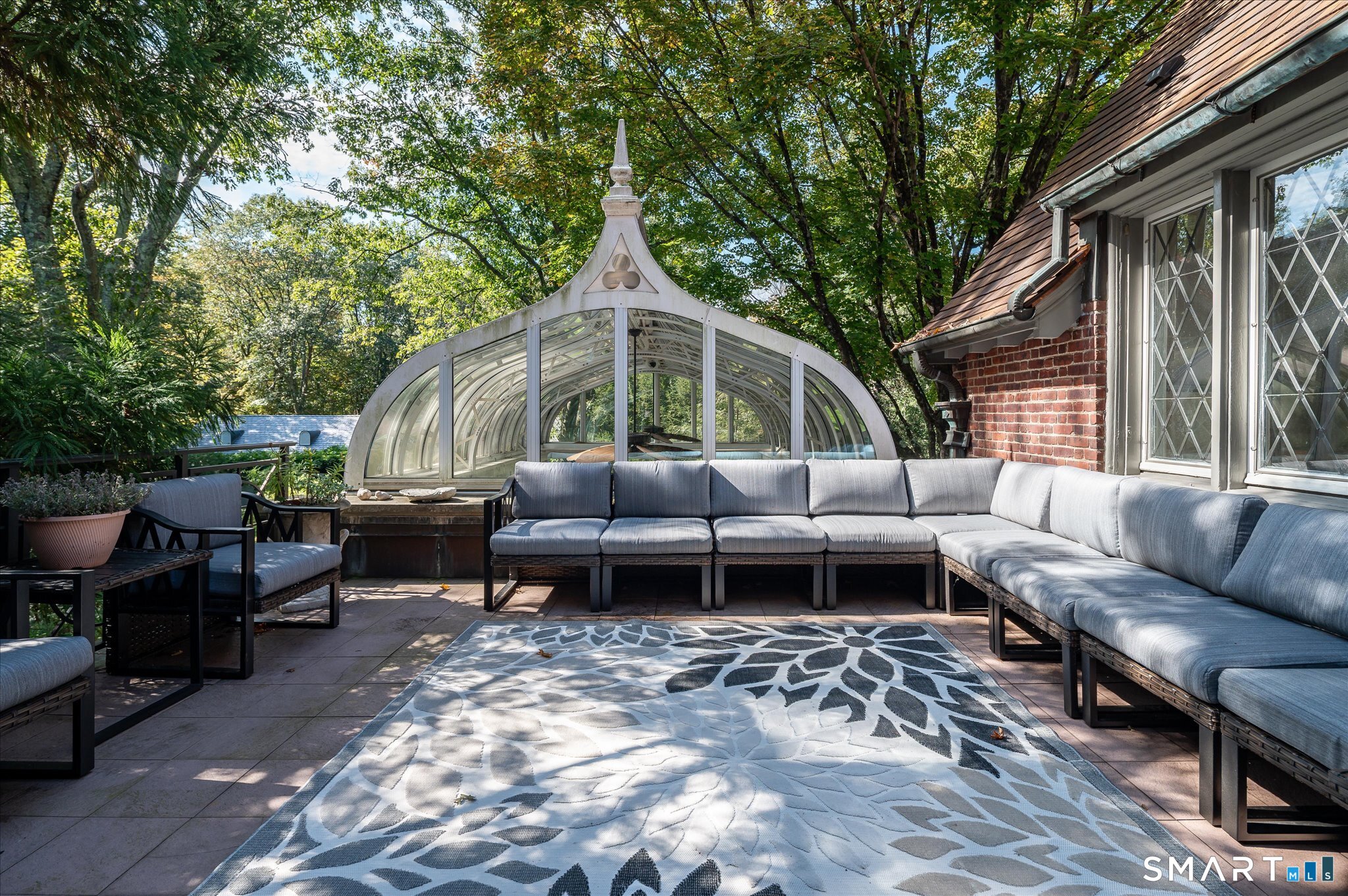 Rock Ledge, a private estate in Weston, is set on nearly five acres surrounded by protected land at the end of a cherry-tree-lined private drive. A reimagined Tudor Revival that blends historic character with modern living. Originally built in 1918, the property was once the residence of Godspell author John-Michael Tebelak. It has evolved into a compound of a brick mansion, pool house with apartment, and converted barn, largely by architect Jack Franzen. The main residence offers over 11,000 square feet with 7 bedrooms, 6 full and 2 half baths. The two-story media wing includes a home theater, library, office, and billiard room. The conservatory overlooks stone terraces, a waterfall and pond, and gardens. The primary suite and office have private balconies. The estate is further distinguished by multiple auxiliary structures: a carriage house with guest accommodations, a separate guest residence, and a heated party barn dating to circa 1850. A pool with spa, pergola, and outdoor kitchen complete the grounds. Original architectural details such as leaded glass windows, rich hardwood paneling and window seats and doors, five stone and brick fireplaces, and other features have been preserved. Modern additions introduce light-filled living spaces. New appliances and updated mechanicals service the buildings. Rock Ledge offers luxury and privacy rare in this area, and promises a lifetime of enjoyment for a buyer who appreciates its beauty.