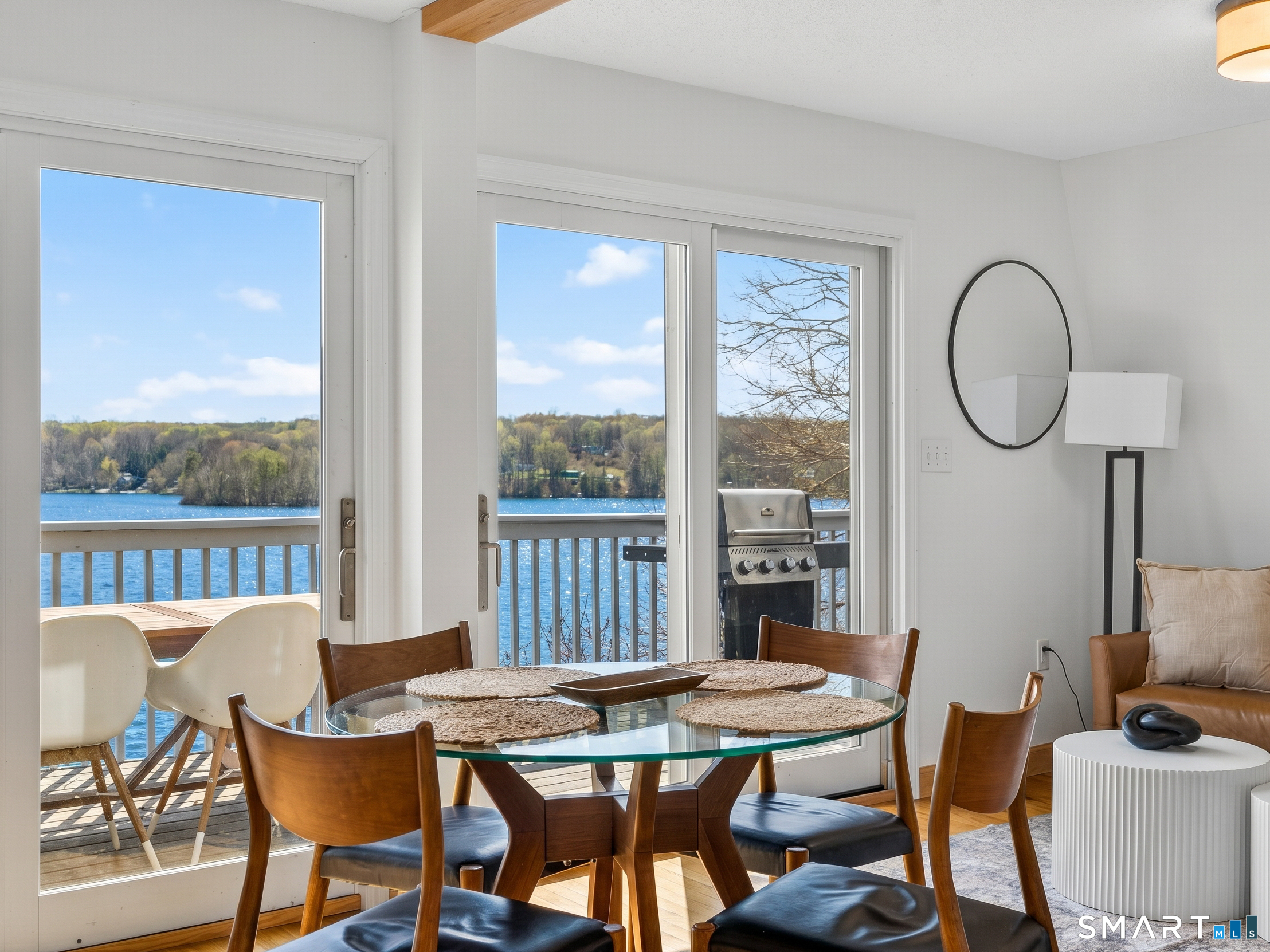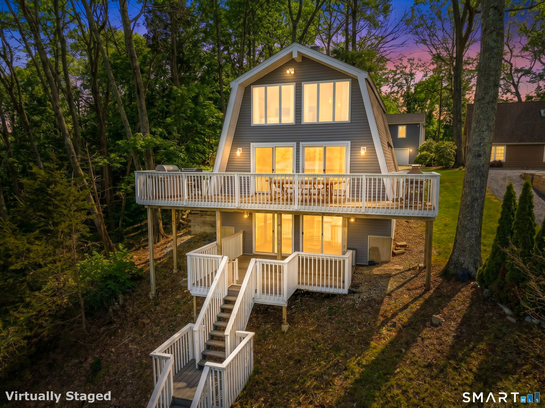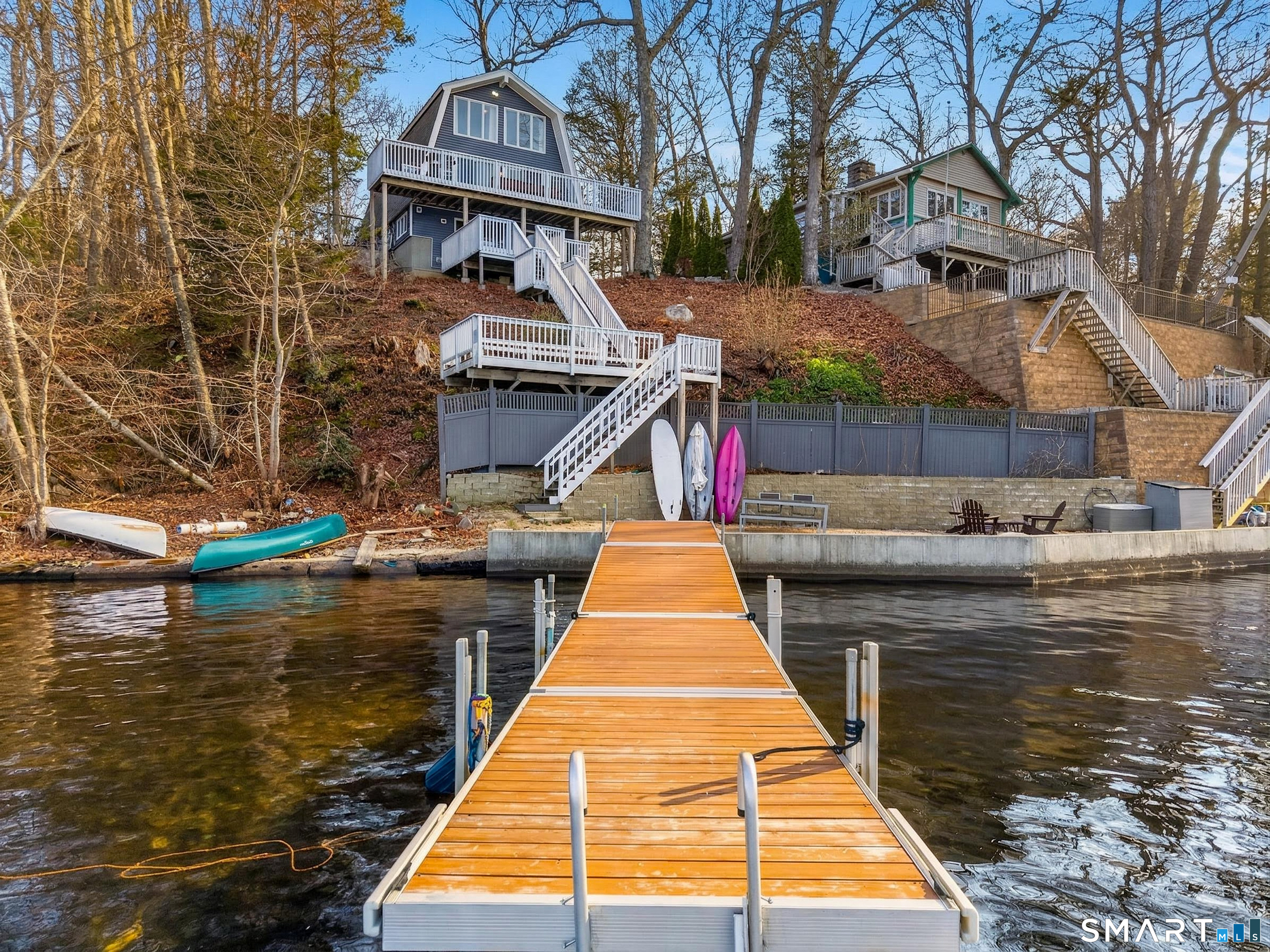 Set along the shores of Gardner Lake, this exceptional lakefront property offers a rare opportunity to experience true waterfront living from all three levels of the home, four levels if you count your private beach and dock! Whether you're searching for a year-round residence, a private lakefront escape, or a property with income-generating potential, this offering adapts to a variety of lifestyles. The 2,379 square foot property that features 3 bedrooms and 2.5 bathrooms currently operates as a highly successful Airbnb with 5-star reviews offering strong income potential. The primary residence is thoughtfully designed with a treehouse-style layout that captures sweeping, panoramic lake views on each floor. The primary suite is a true standout, perched high above the lake with a full wall of floor-to-ceiling windows, offering breathtaking views. Skylights throughout the upper level further enhance the bright, airy feel of the home. The main living area offers an open and inviting layout with an eat-in kitchen, dining and living room, equipped with a wi-fi refrigerator and state-of-the-art Wolf induction stove. Owner has replaced air conditioning and water heaters for both buildings. Step outside to your private waterfront retreat, complete with a beautifully crafted teak dock, perfect for launching kayaks and canoes, fishing, or simply enjoying the peaceful surroundings. Swim, boat, and unwind just outside your door.