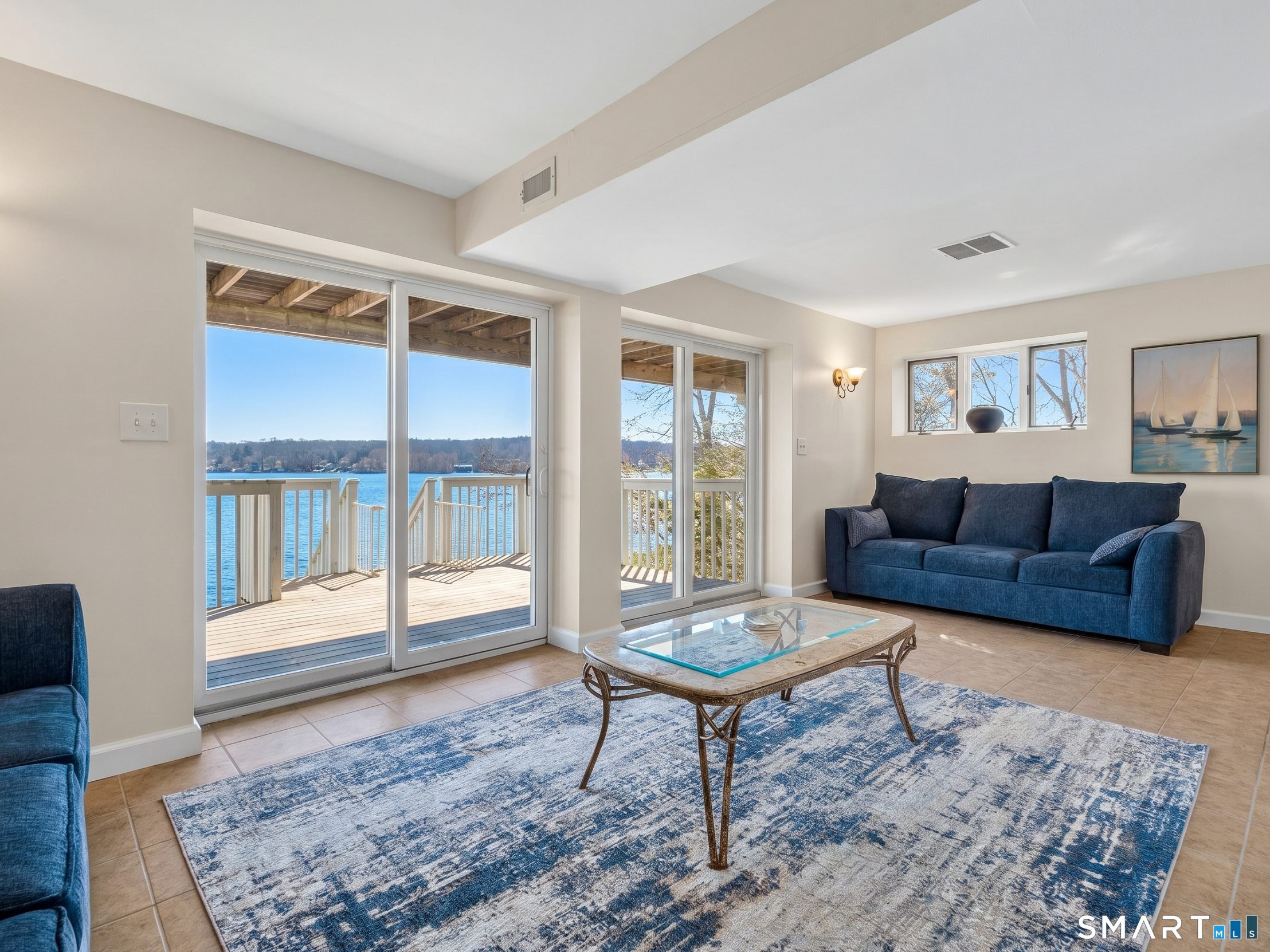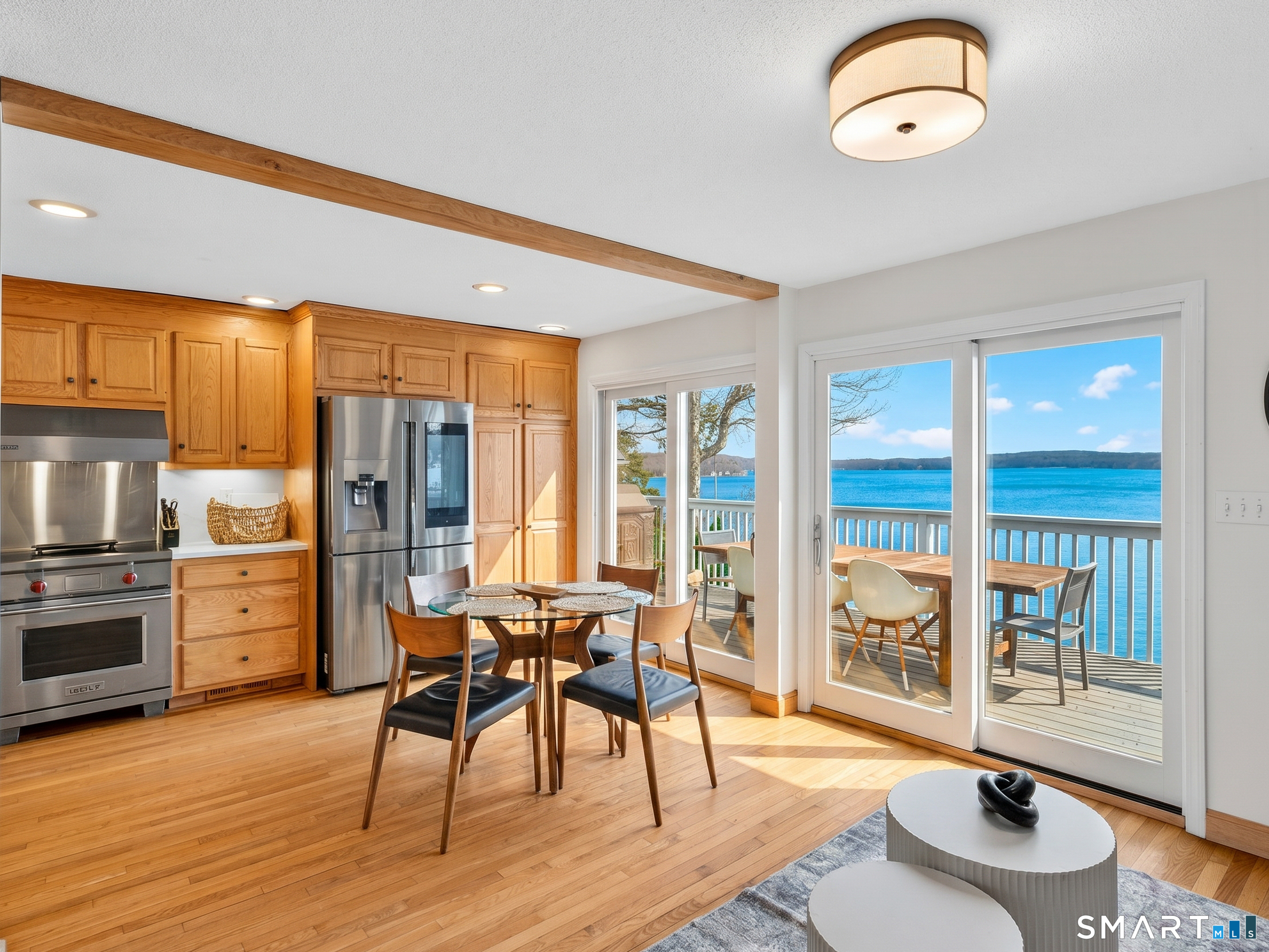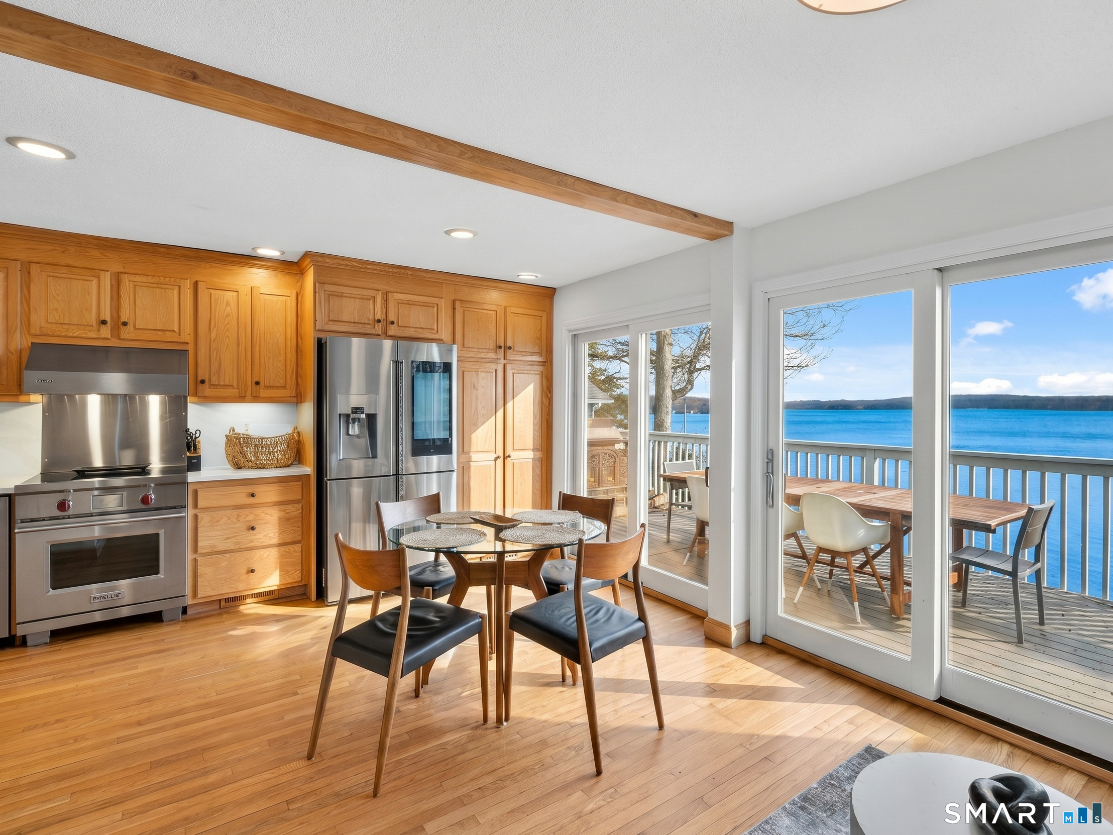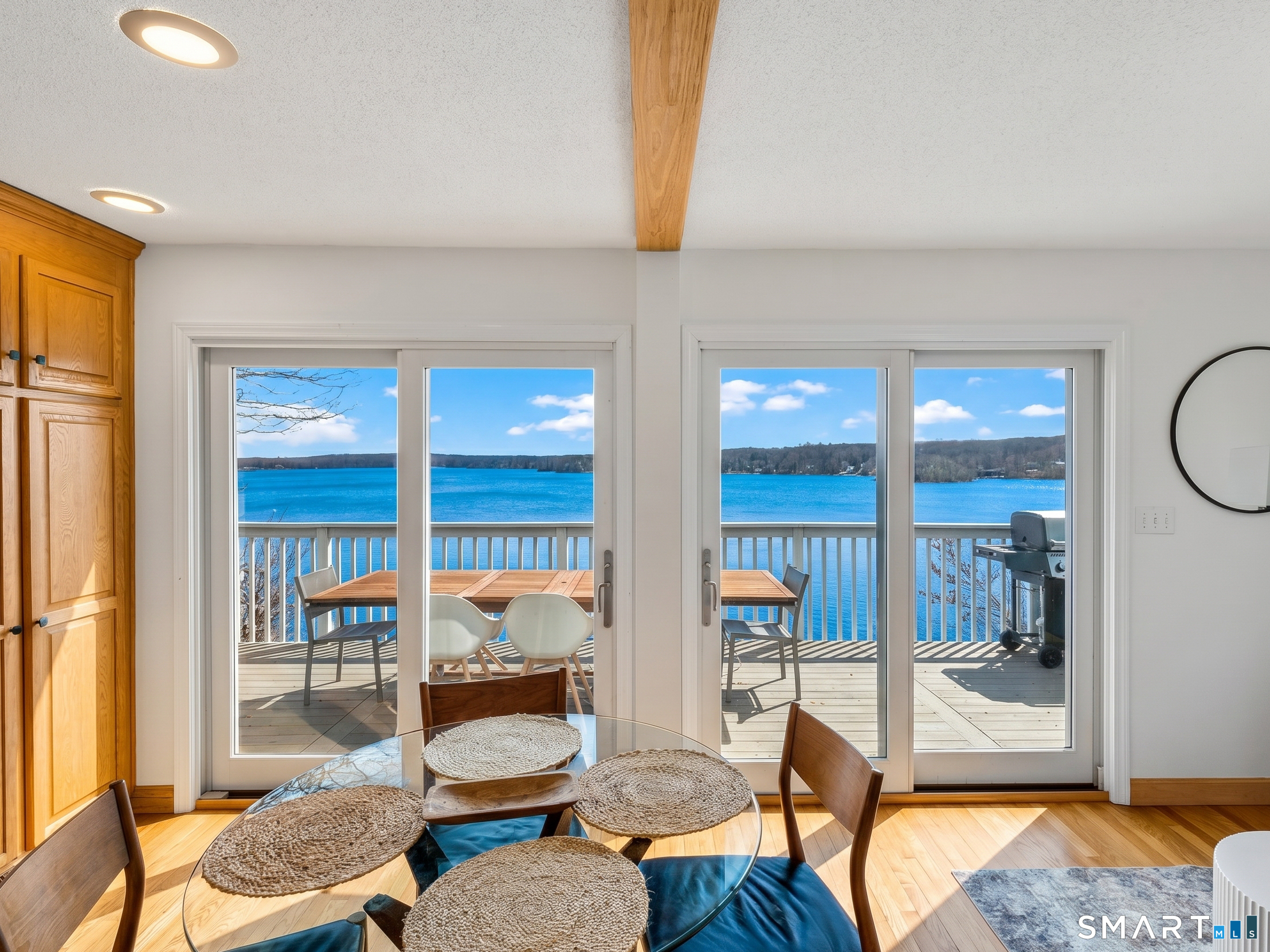 Set along the shores of Gardner Lake, this exceptional lakefront property offers a rare opportunity to experience true waterfront living from all three levels of the home, four levels if you count your private beach and dock! Whether you're searching for a year-round residence, a private lakefront escape, or a property with income-generating potential, this offering adapts to a variety of lifestyles. The 2,379 square foot property that features 3 bedrooms and 2.5 bathrooms currently operates as a highly successful Airbnb with 5-star reviews offering strong income potential. The primary residence is thoughtfully designed with a treehouse-style layout that captures sweeping, panoramic lake views on each floor. The primary suite is a true standout, perched high above the lake with a full wall of floor-to-ceiling windows, offering breathtaking views. Skylights throughout the upper level further enhance the bright, airy feel of the home. The main living area offers an open and inviting layout with an eat-in kitchen, dining and living room, equipped with a wi-fi refrigerator and state-of-the-art Wolf induction stove. Owner has replaced air conditioning and water heaters for both buildings. Step outside to your private waterfront retreat, complete with a beautifully crafted teak dock, perfect for launching kayaks and canoes, fishing, or simply enjoying the peaceful surroundings. Swim, boat, and unwind just outside your door.