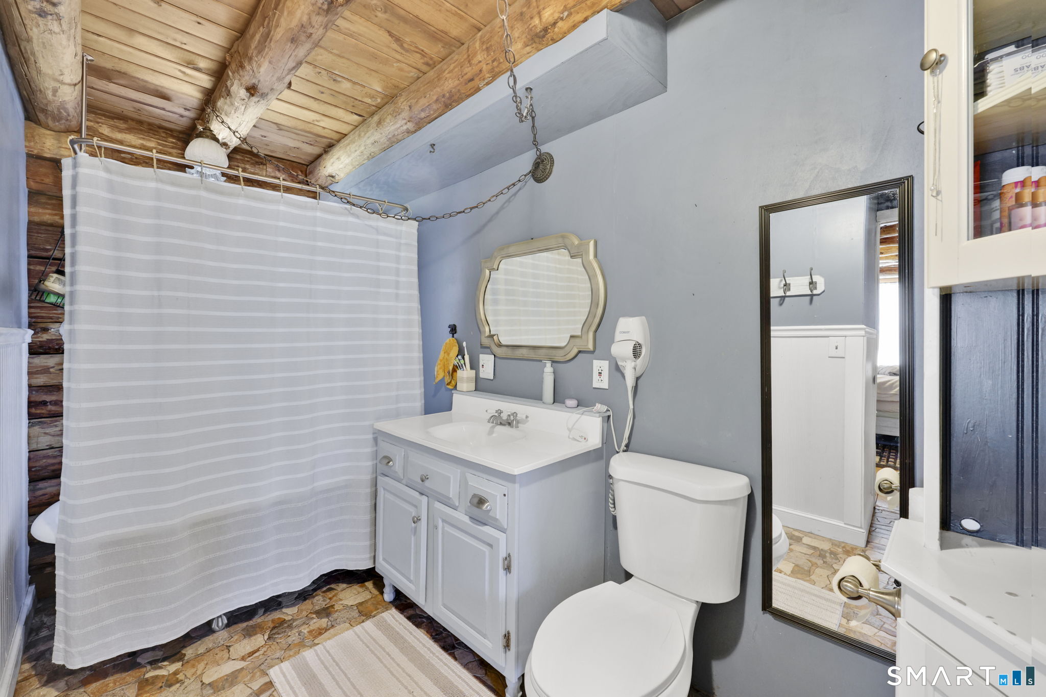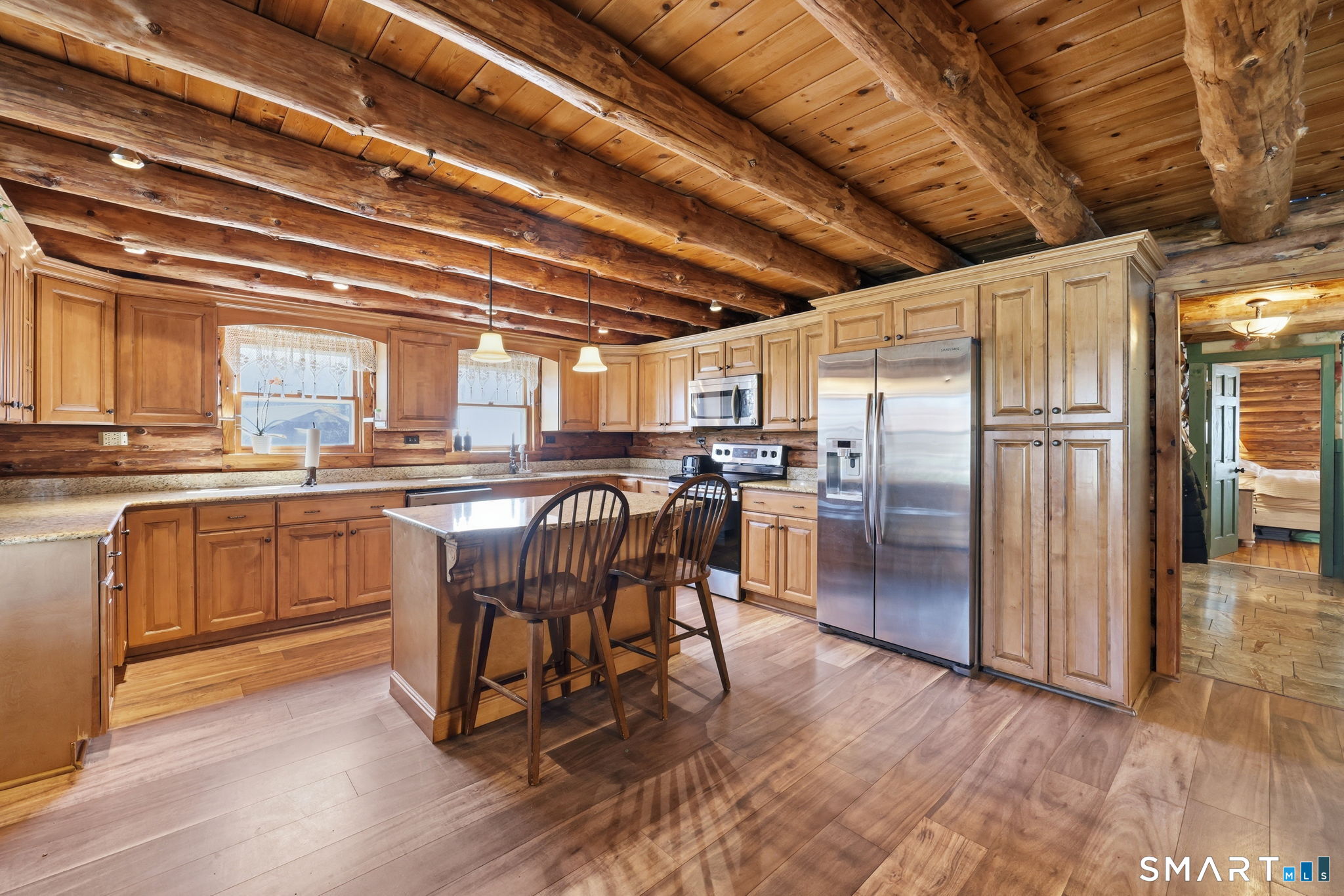Welcome to 800 Gaylord Mountain Rd. This charming 3-bedroom, 2-bath log cabin Cape is set on 2.83 scenic acres, offering a true Vermont-style retreat right here in Ct. This inviting home is filled with warmth and character, featuring exposed beams and rustic woodwork throughout. The open-concept main level includes an eat-in kitchen with granite countertops that flows seamlessly into a spacious living room centered around a cozy pellet stove perfect for relaxing and entertaining. The first-floor primary bedroom provides convenience and privacy, complete with a full bath. Upstairs, you'll find 2 generously sized bedrooms with plenty of natural light. The finished lower level adds valuable living space with a walkout design ideal for a recreation room, guest area, or potential fourth bedroom. Outside, the property continues to impress with a 3-car detached garage, offering ample space for vehicles, tools, or hobbies. Animal lovers and hobby farmers will appreciate the existing chicken coops and goat stable, which can also serve as additional storage if preferred. With its peaceful setting, flexible living spaces, and unique rustic appeal, this property is a rare find that blends country charm with everyday comfort. Only 20 minutes or less from Yale University, Quinnipiac University, Southern CT State University Albertus Magnus College & downtown New Haven. State parks, including Sleeping Giant, along with the Farmington Trail, museums and golf courses are close by.
