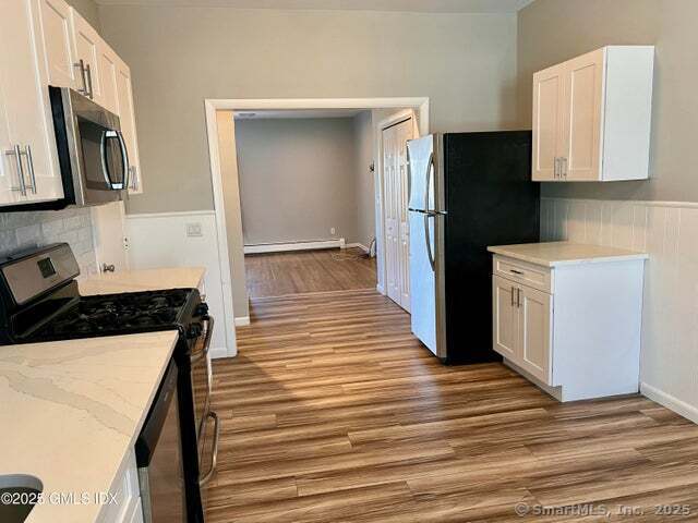 Nicely renovated 2 bedroom, 1.5 bath apartment in a stunning stone like ''castle'' atop Tunis Hill. Enjoy lovely views from the living room's oversized picture window, hardwood floos, titled bathrooms and two decorative fireplaces. The full bath includes a marble-top vanity, tub/shower combo and an additional half bath. The kitchen offers ample space for a dining table, a pantry, and a washer/dryer. Central A/C, 2 reserved parking spaces, trash, snow removal and storage included.