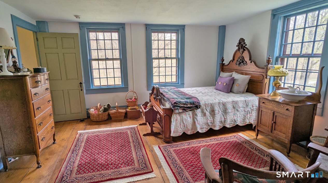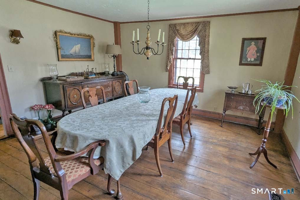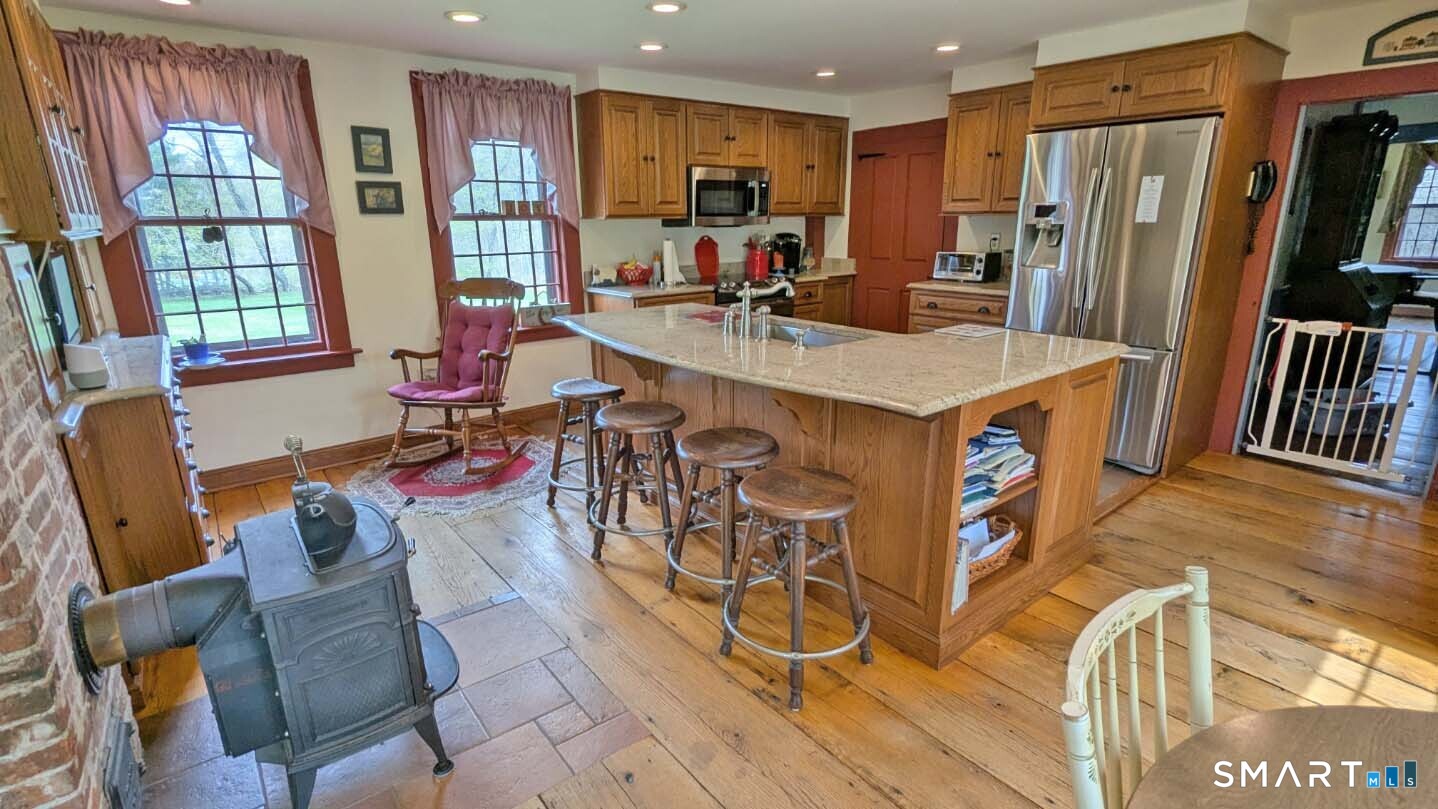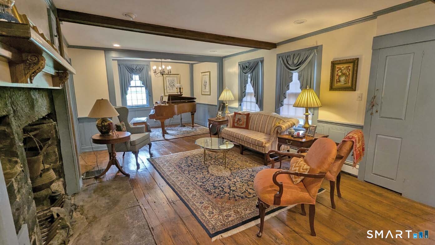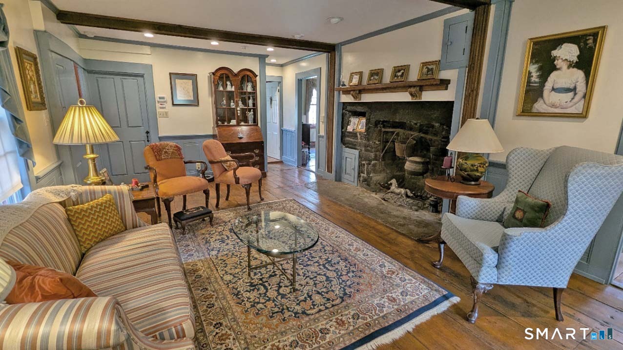 Built in 1750, this beautifully updated and meticulously maintained historic home blends timeless character with modern comfort. Rich wide-board floors and classic 12-over-12 windows highlight its heritage, complemented by four fireplaces throughout the home. The inviting kitchen features granite countertops, custom cabinetry, a wood stove, and abundant natural light from multiple windows and a sliding door leading to the patio-perfect for everyday living and entertaining. A charming library with custom built-ins sits just off the kitchen, offering a cozy and functional retreat. Both the living and dining rooms showcase impressive fireplaces with updated liners, enhancing both style and efficiency. Two staircases provide convenient access to the second floor, where you'll find two spacious bedrooms, a beautifully remodeled full bath, and an additional room ideal for a nursery. An open landing area between the bedrooms offers flexible space for a home office or playroom. Set on 3.8 acres of rolling, usable land, the property also features a new driveway, an expansive three-car garage with a loft workshop-perfect for hobbies, storage, or creative pursuits, a barn and a well house. A rare opportunity to own a thoughtfully preserved historic home with modern updates in a serene setting. Country living at its best.