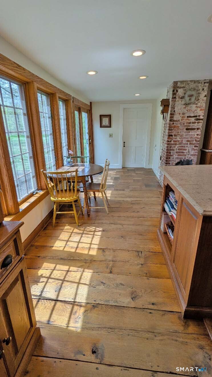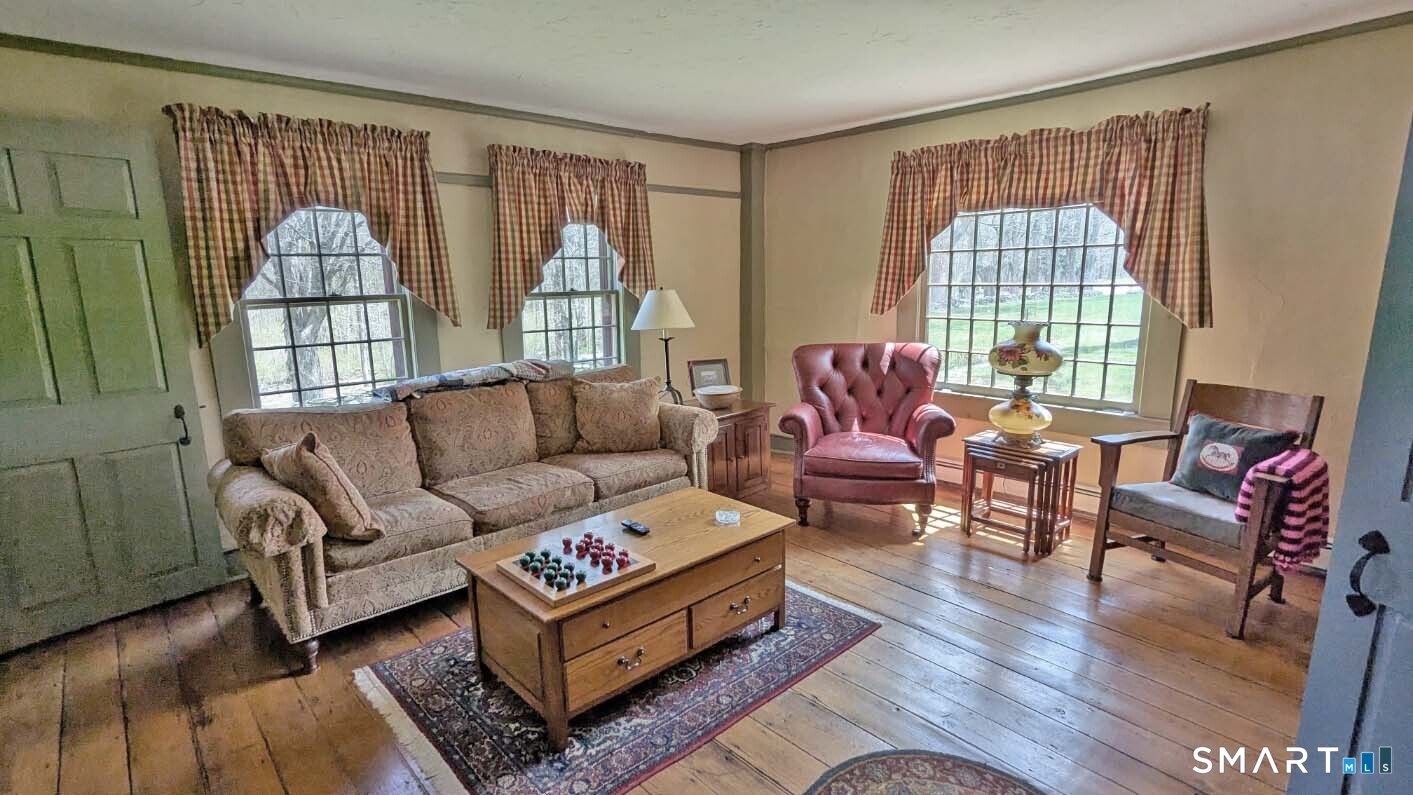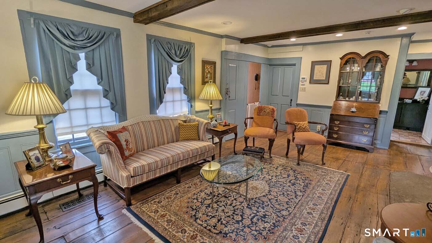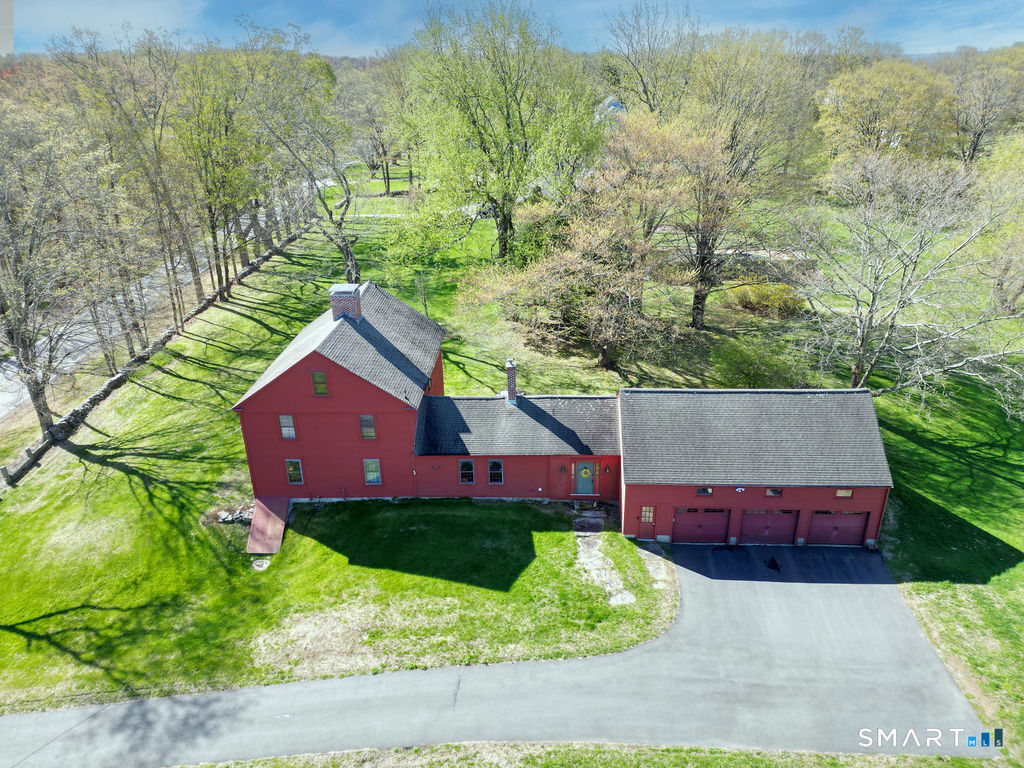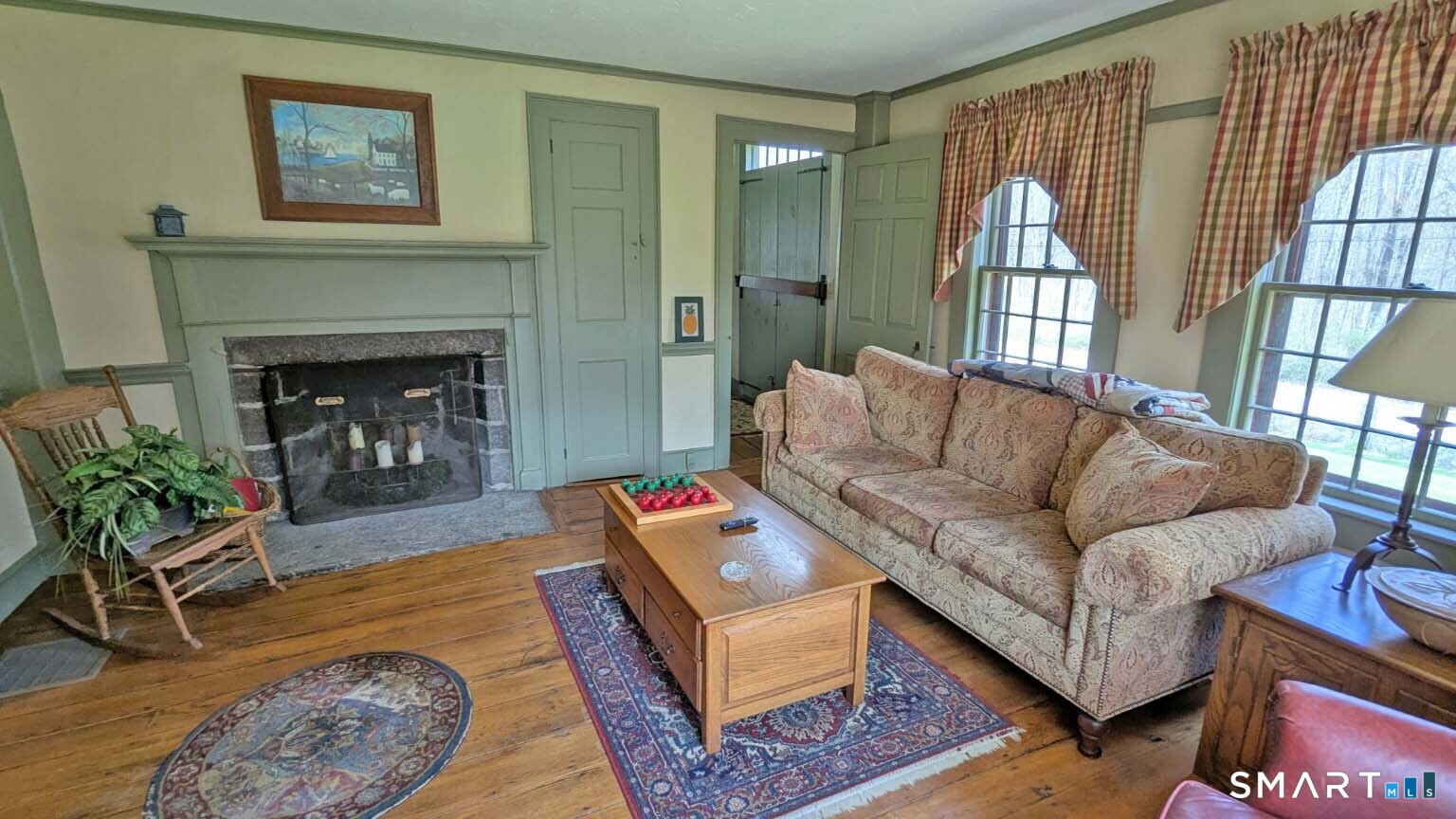 Built in 1750, this beautifully updated and meticulously maintained historic home blends timeless character with modern comfort. Rich wide-board floors and classic 12-over-12 windows highlight its heritage, complemented by four fireplaces throughout the home. The inviting kitchen features granite countertops, custom cabinetry, a wood stove, and abundant natural light from multiple windows and a sliding door leading to the patio-perfect for everyday living and entertaining. A charming library with custom built-ins sits just off the kitchen, offering a cozy and functional retreat. Both the living and dining rooms showcase impressive fireplaces with updated liners, enhancing both style and efficiency. Two staircases provide convenient access to the second floor, where you'll find two spacious bedrooms, a beautifully remodeled full bath, and an additional room ideal for a nursery. An open landing area between the bedrooms offers flexible space for a home office or playroom. Set on 3.8 acres of rolling, usable land, the property also features a new driveway, an expansive three-car garage with a loft workshop-perfect for hobbies, storage, or creative pursuits, a barn and a well house. A rare opportunity to own a thoughtfully preserved historic home with modern updates in a serene setting. Country living at its best.