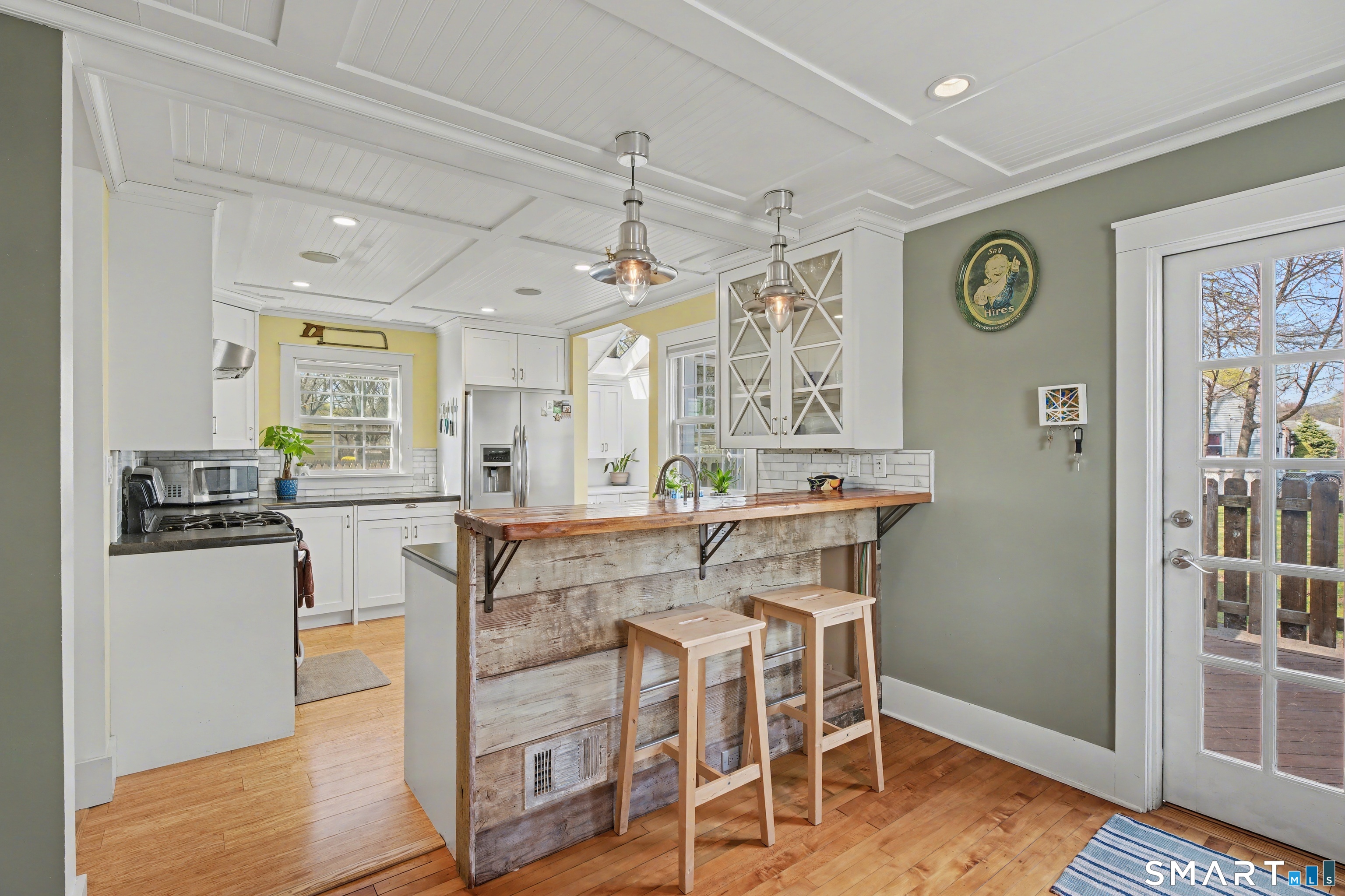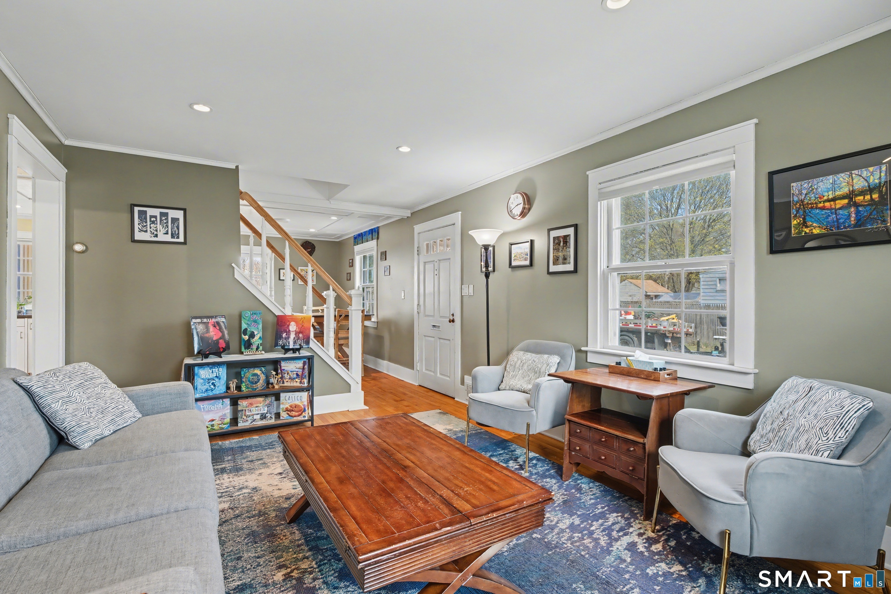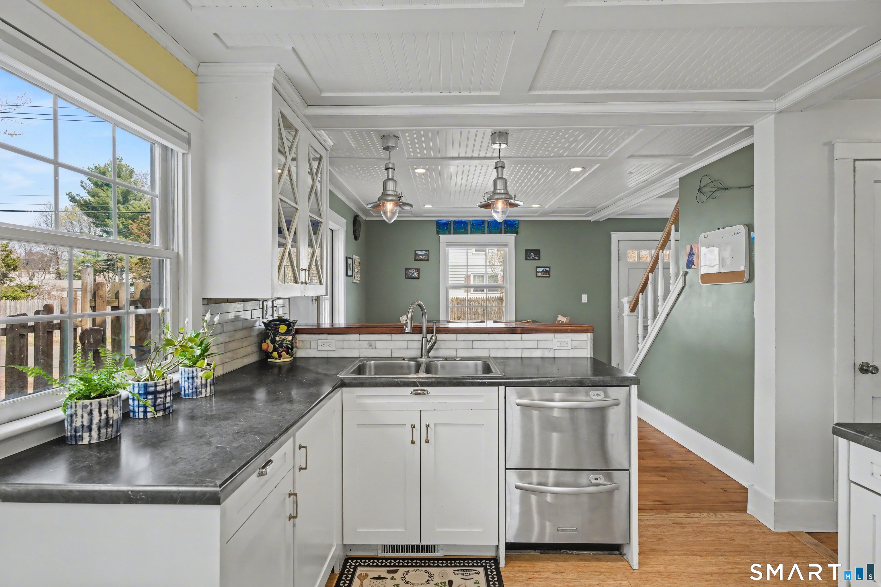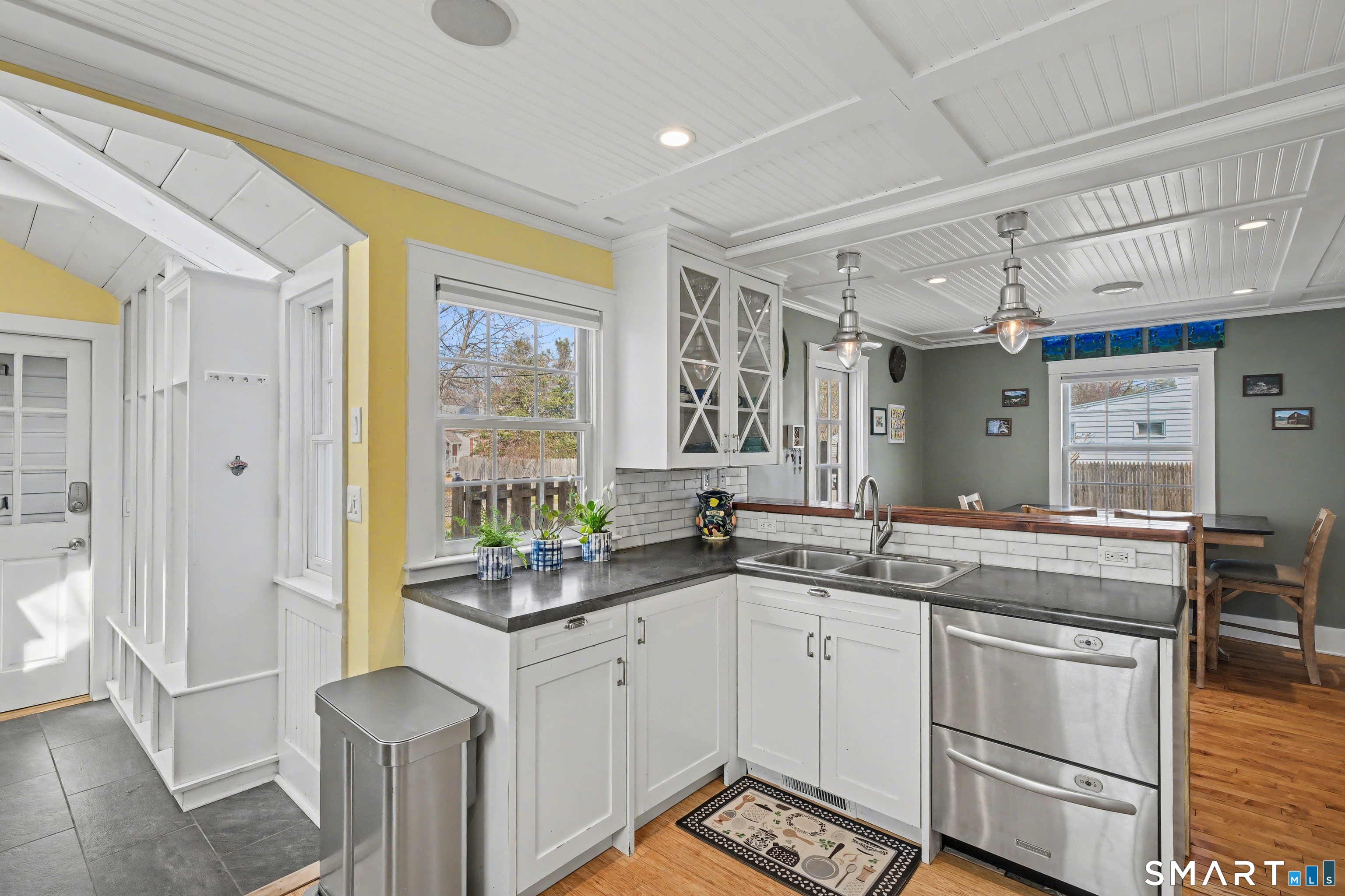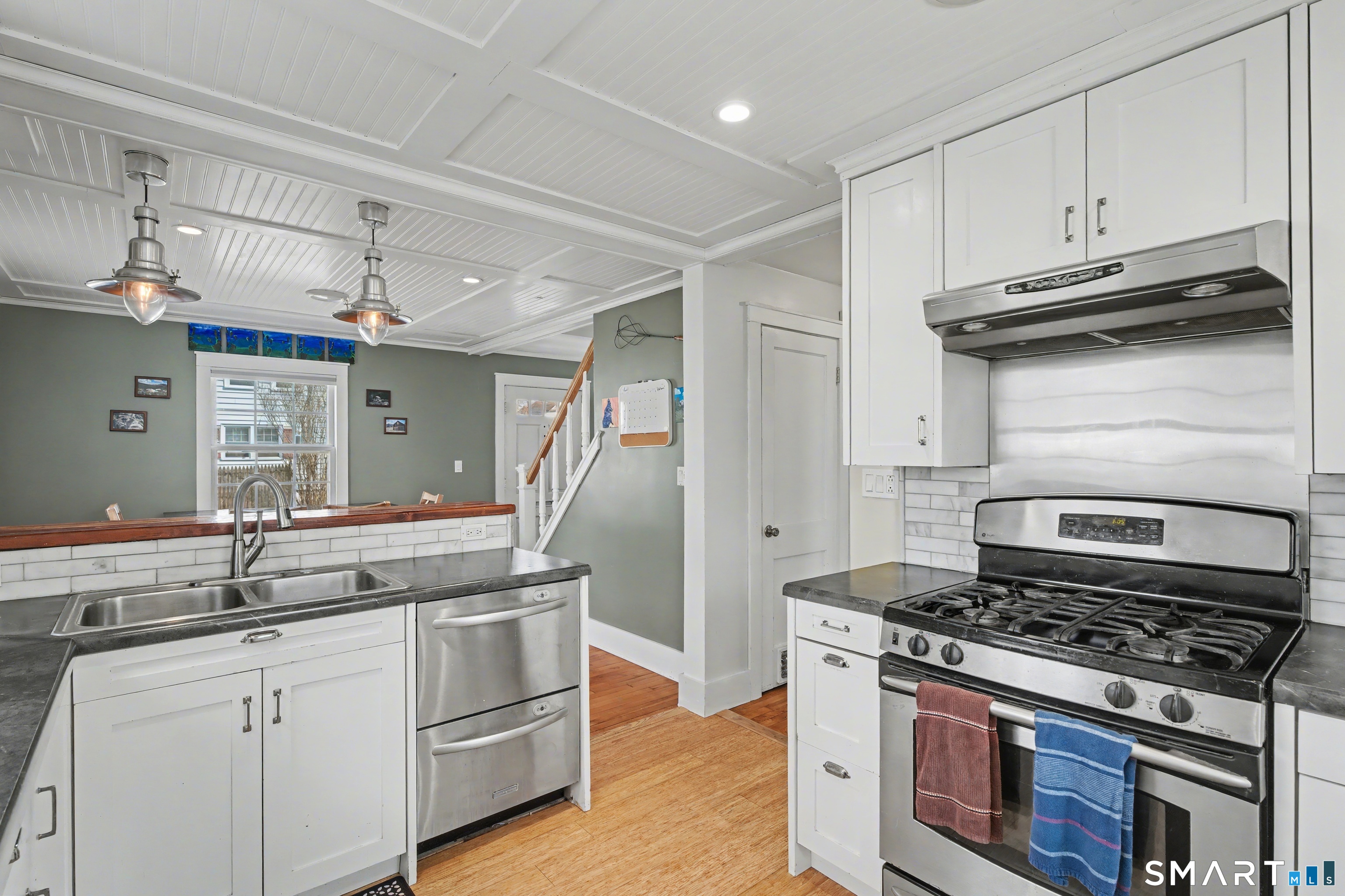 Cute as a button 3-bedroom, 2-bath Cape, move-in ready! At 1265 sq. ft., this fully renovated home offers serious bang for your buck. The living room has custom built-ins, recessed lighting & elegant crown molding. An open concept dining room & kitchen has a wood beadboard, and great flow - an ideal space for gathering. The stylish kitchen has soapstone counters, stainless appliances, and a breakfast bar, and connects to a large pantry and the mudroom. A deck is located off the mudroom - great for dining al fresco. A first floor bedroom has a custom built-in desk & bookcase-perfect for anyone looking for one floor living or an office. A fully updated tile bathroom with a shower/tub combination completes the 1st floor. The second floor offers two spacious bedrooms with incredible natural light, bamboo floors and large closets. Huge basement with finishing potential and tons of storage. The house has vinyl replacement windows, aluminum siding, oil furnace, and a newer oil tank (2023) & hot water heater (2022). Large side yard with room for gardening, and a one car garage. This house is truly in turnkey condition!