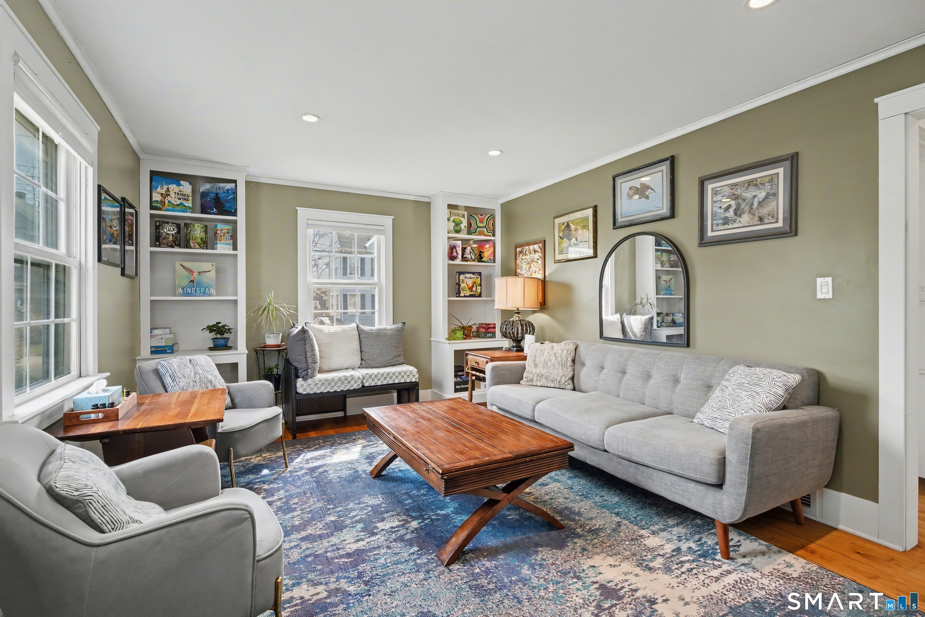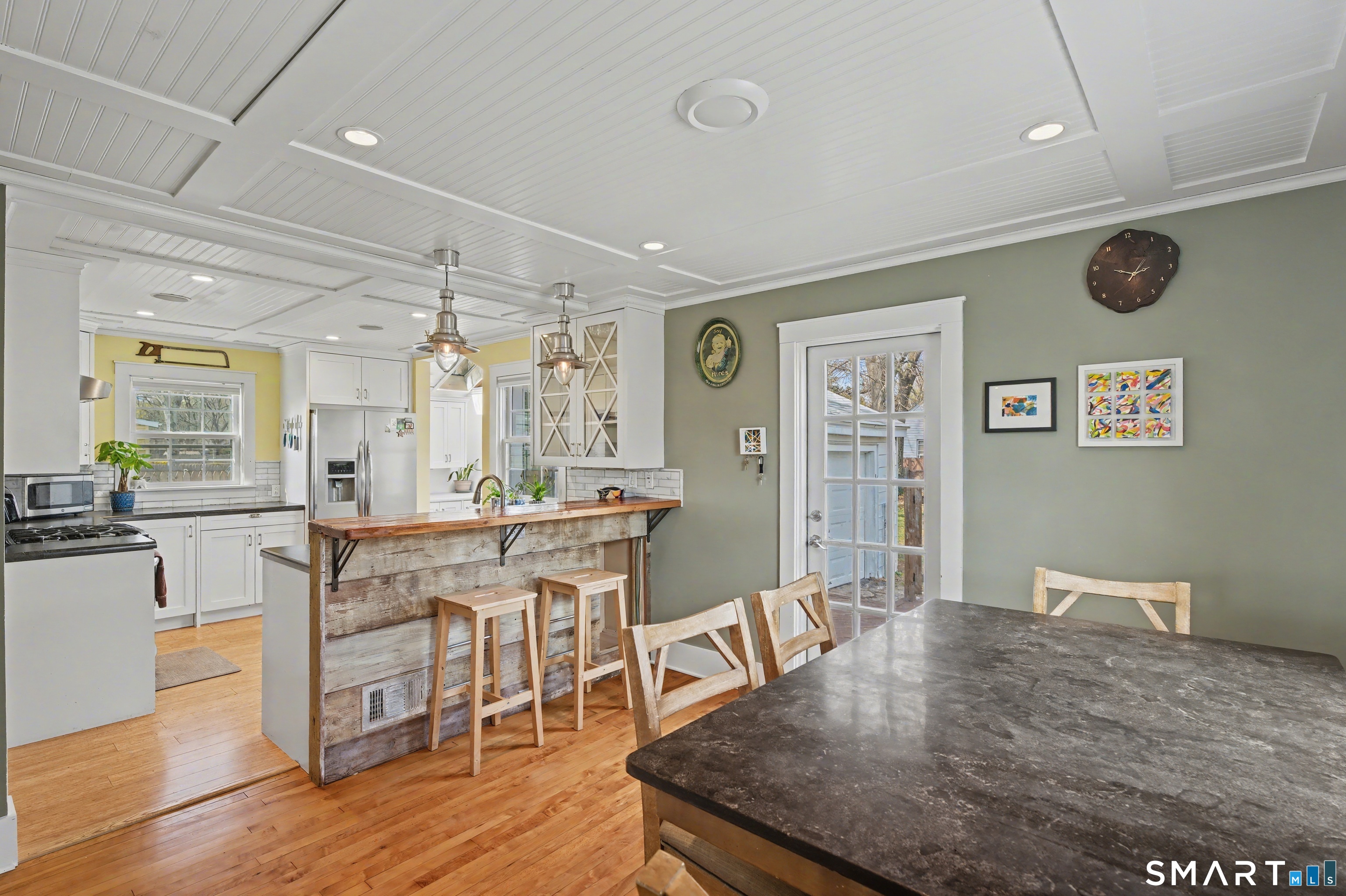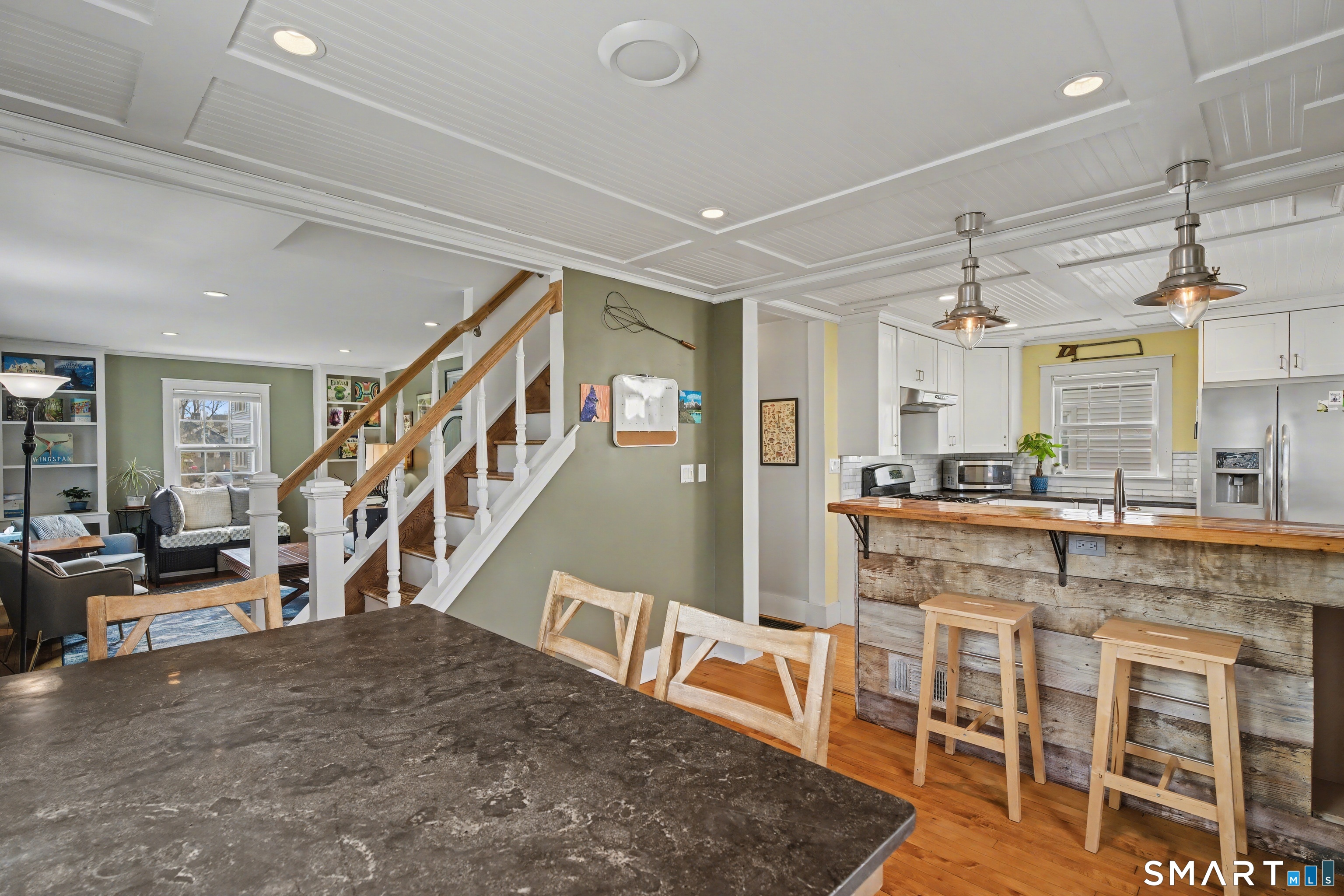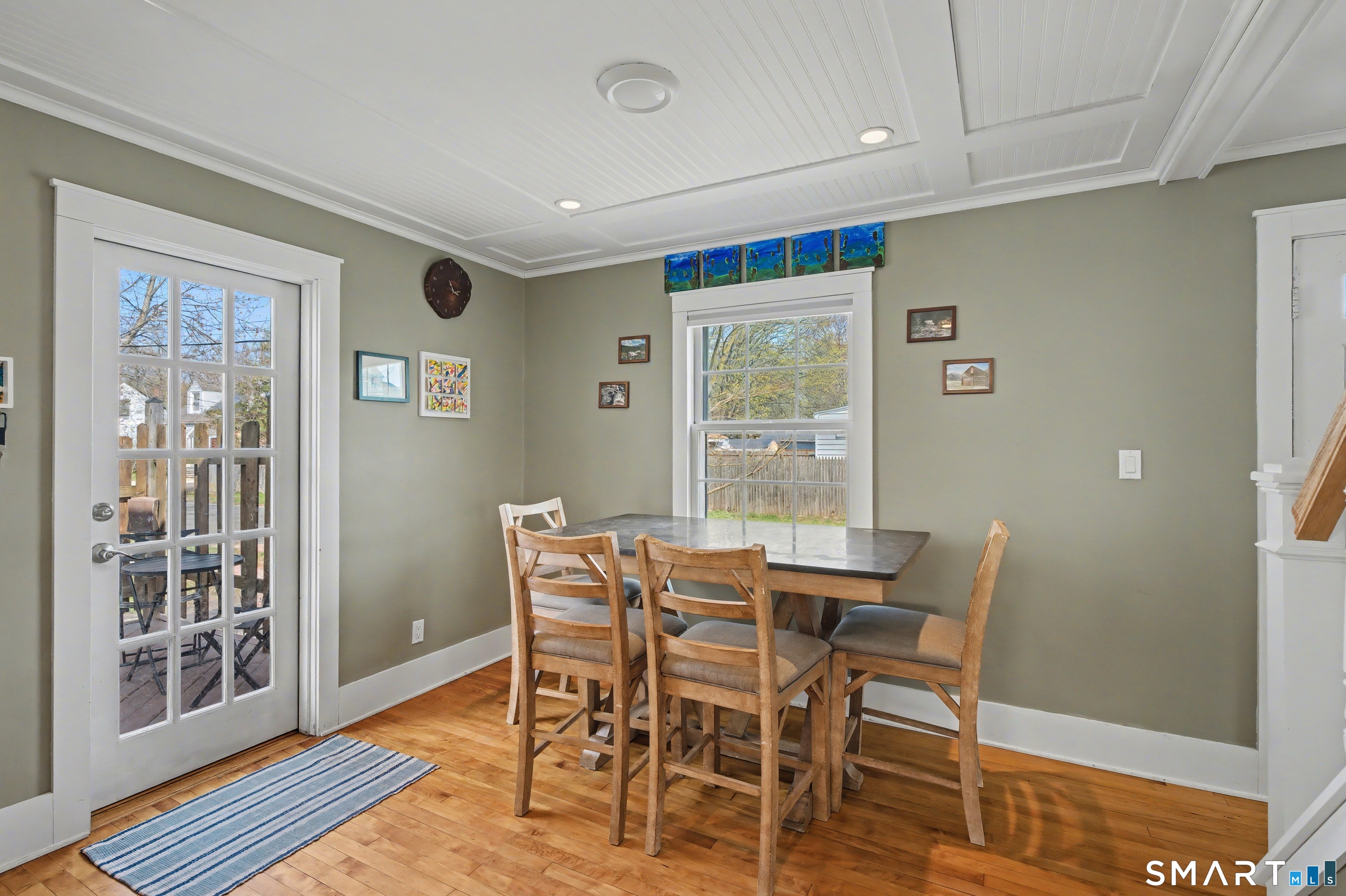 Cute as a button 3-bedroom, 2-bath Cape, move-in ready! At 1265 sq. ft., this fully renovated home offers serious bang for your buck. The living room has custom built-ins, recessed lighting & elegant crown molding. An open concept dining room & kitchen has a wood beadboard, and great flow - an ideal space for gathering. The stylish kitchen has soapstone counters, stainless appliances, and a breakfast bar, and connects to a large pantry and the mudroom. A deck is located off the mudroom - great for dining al fresco. A first floor bedroom has a custom built-in desk & bookcase-perfect for anyone looking for one floor living or an office. A fully updated tile bathroom with a shower/tub combination completes the 1st floor. The second floor offers two spacious bedrooms with incredible natural light, bamboo floors and large closets. Huge basement with finishing potential and tons of storage. The house has vinyl replacement windows, aluminum siding, oil furnace, and a newer oil tank (2023) & hot water heater (2022). Large side yard with room for gardening, and a one car garage. This house is truly in turnkey condition!