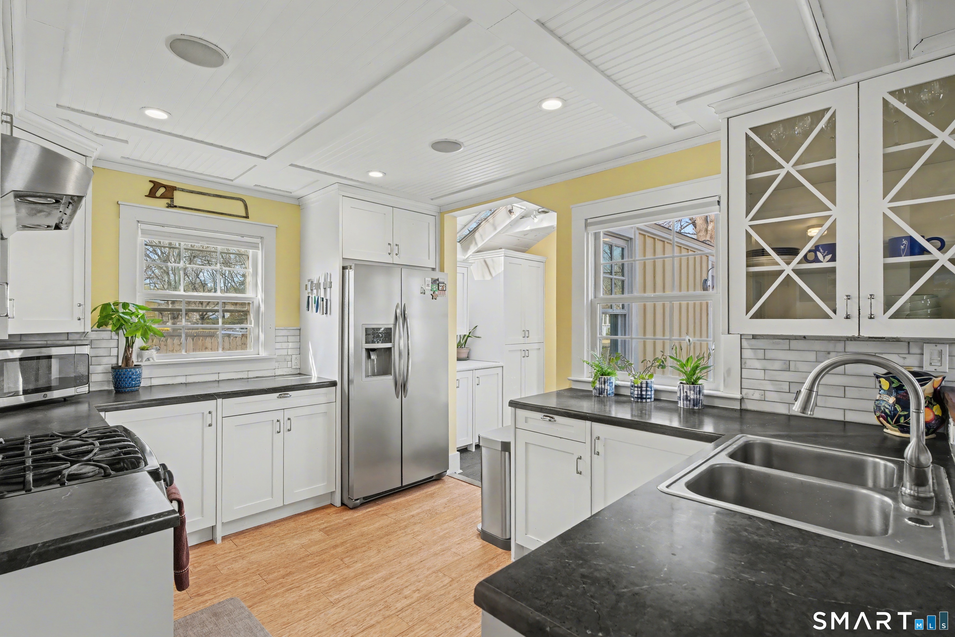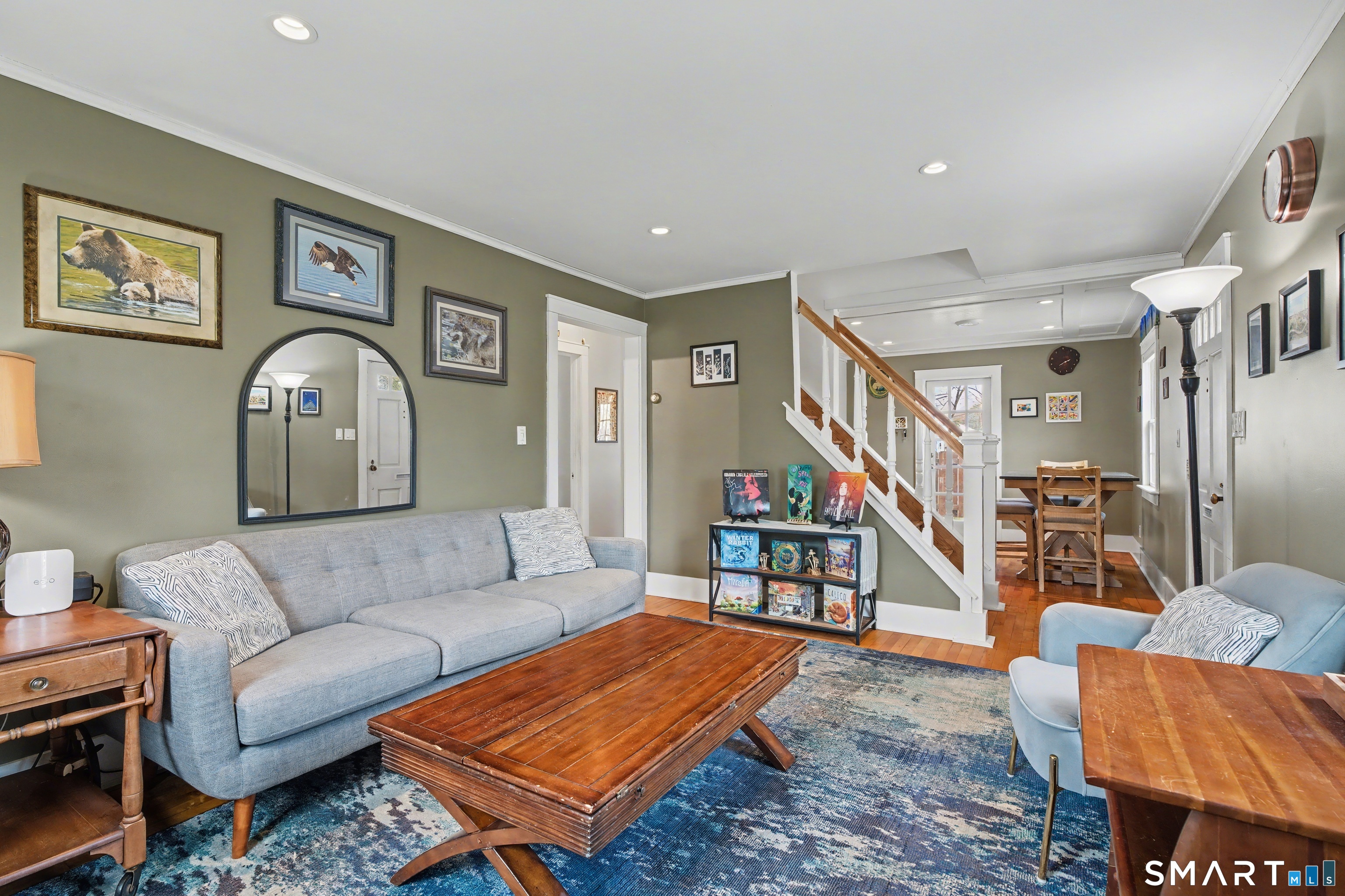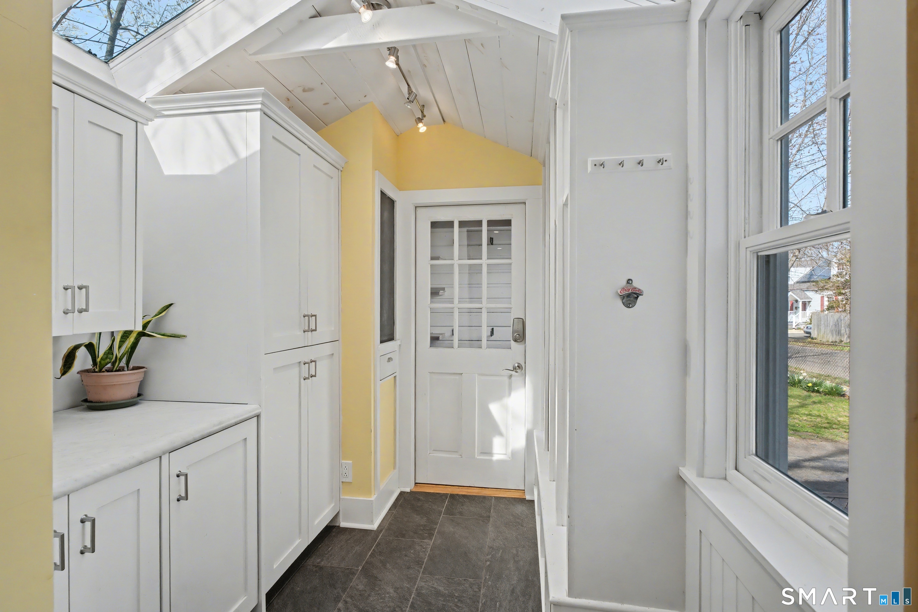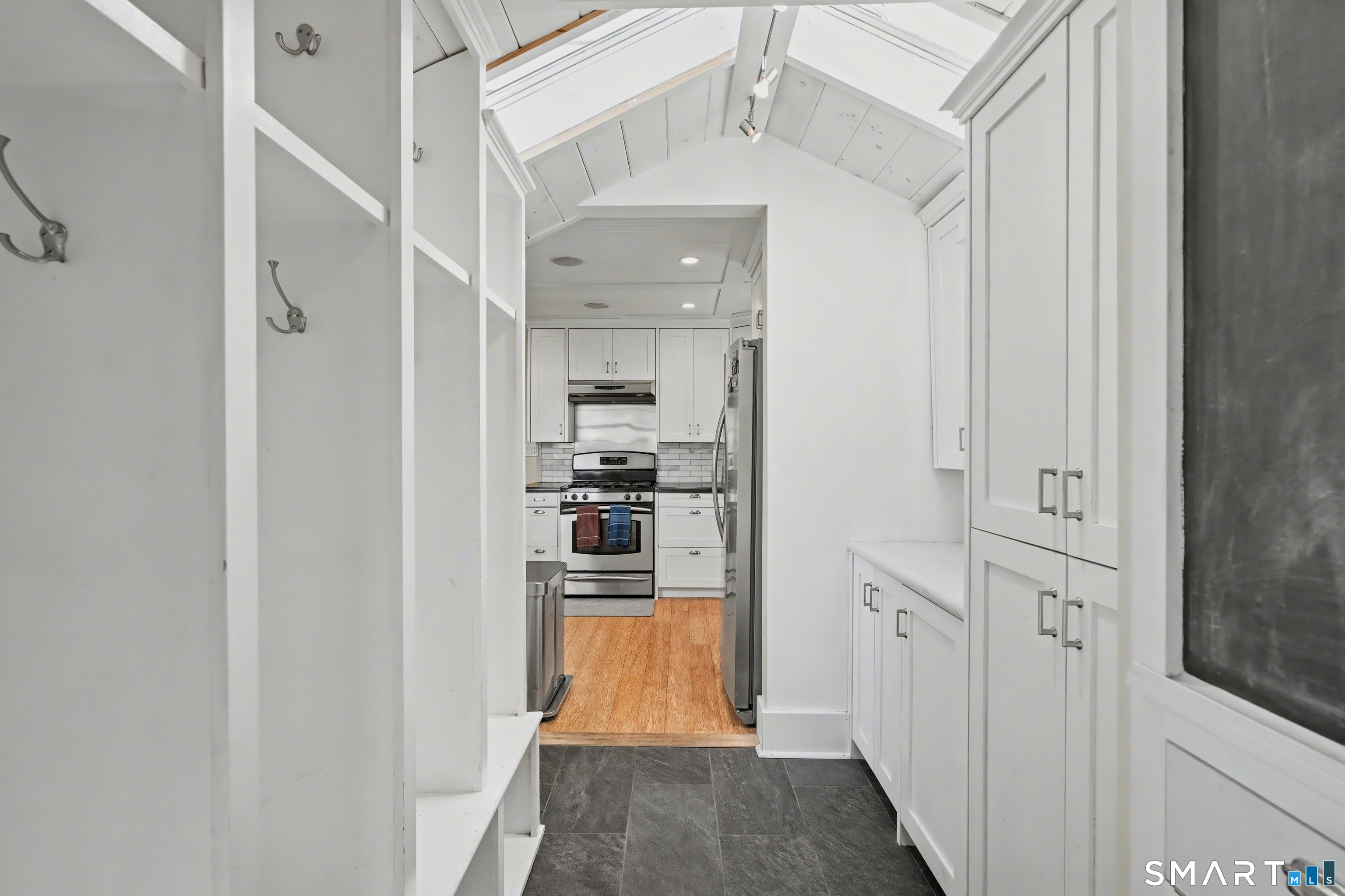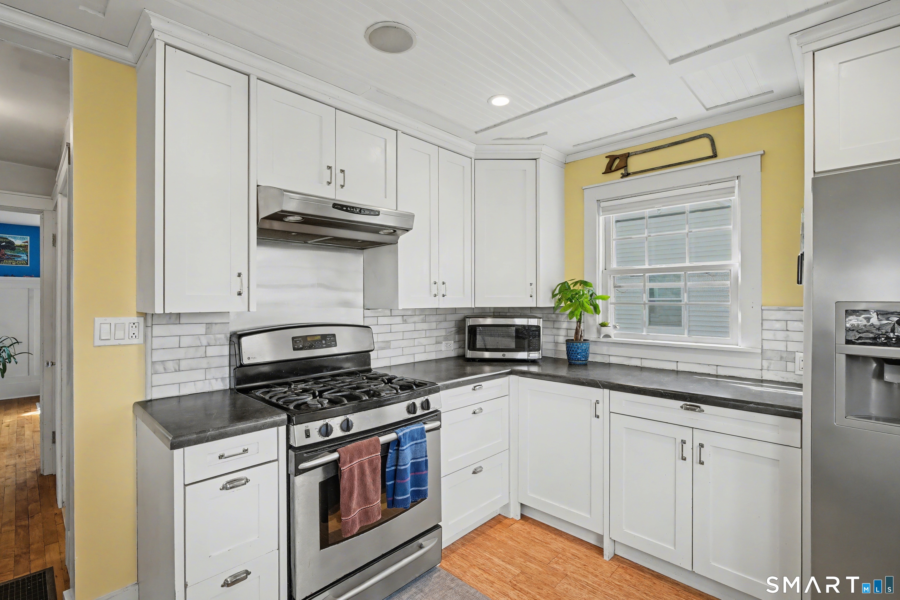 Cute as a button 3-bedroom, 2-bath Cape, move-in ready! At 1265 sq. ft., this fully renovated home offers serious bang for your buck. The living room has custom built-ins, recessed lighting & elegant crown molding. An open concept dining room & kitchen has a wood beadboard, and great flow - an ideal space for gathering. The stylish kitchen has soapstone counters, stainless appliances, and a breakfast bar, and connects to a large pantry and the mudroom. A deck is located off the mudroom - great for dining al fresco. A first floor bedroom has a custom built-in desk & bookcase-perfect for anyone looking for one floor living or an office. A fully updated tile bathroom with a shower/tub combination completes the 1st floor. The second floor offers two spacious bedrooms with incredible natural light, bamboo floors and large closets. Huge basement with finishing potential and tons of storage. The house has vinyl replacement windows, aluminum siding, oil furnace, and a newer oil tank (2023) & hot water heater (2022). Large side yard with room for gardening, and a one car garage. This house is truly in turnkey condition!