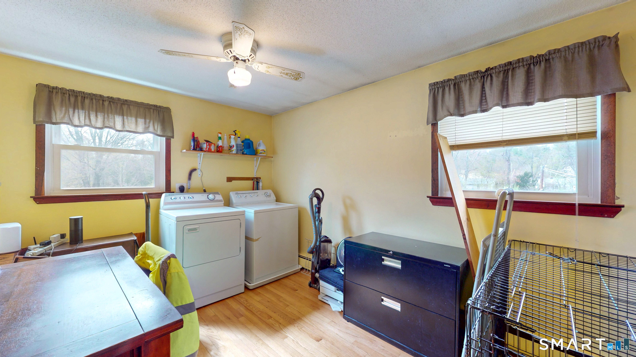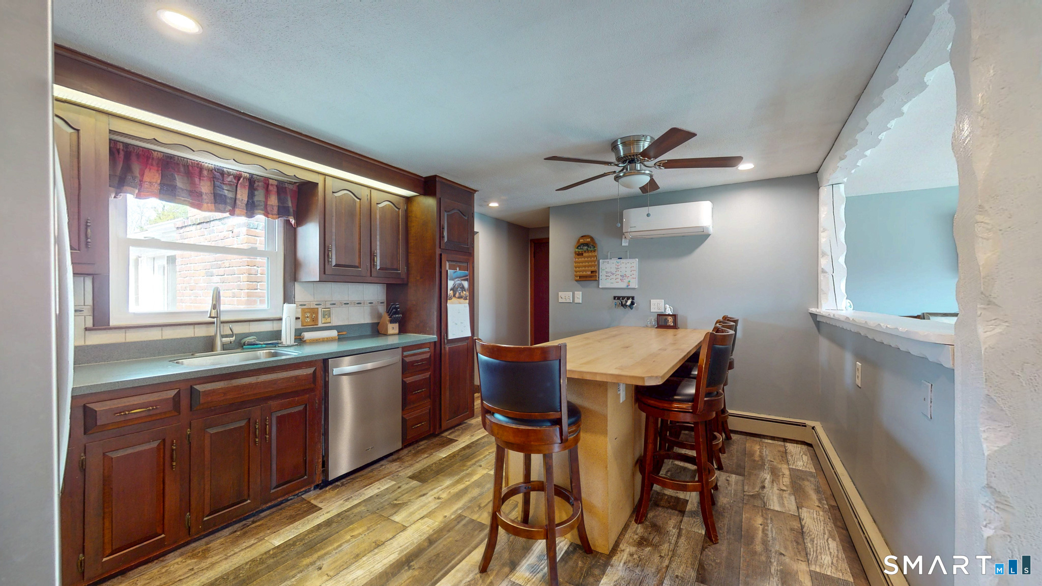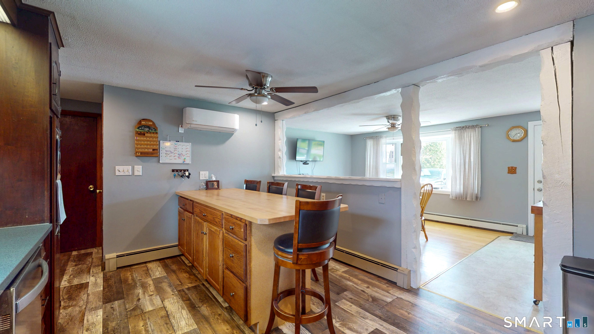 Move right into this meticulously maintained 3-bedroom ranch, ideally situated in a town known for its peaceful, country-style atmosphere. This home offers a versatile floor plan, quality updates, and valuable extras. The main level features hardwood flooring in all three bedrooms, including a flexible third bedroom with a current washer/dryer setup (easily removable; additional units remain in the lower level). Wide-board laminate flooring flows through the kitchen, family room, and den, creating a warm, cohesive living space. The updated kitchen (approx. 6 years old) is a standout, showcasing cherry cabinetry, stainless steel appliances, quartz countertops, ceramic tile backsplash, and a center island with butcher-block style top-perfect for everyday living and entertaining. Enjoy multiple living space options with a flexible main floor layout-current dining room can easily convert back to a formal living room, while the family room/den offers additional space for entertaining, work, or relaxation.