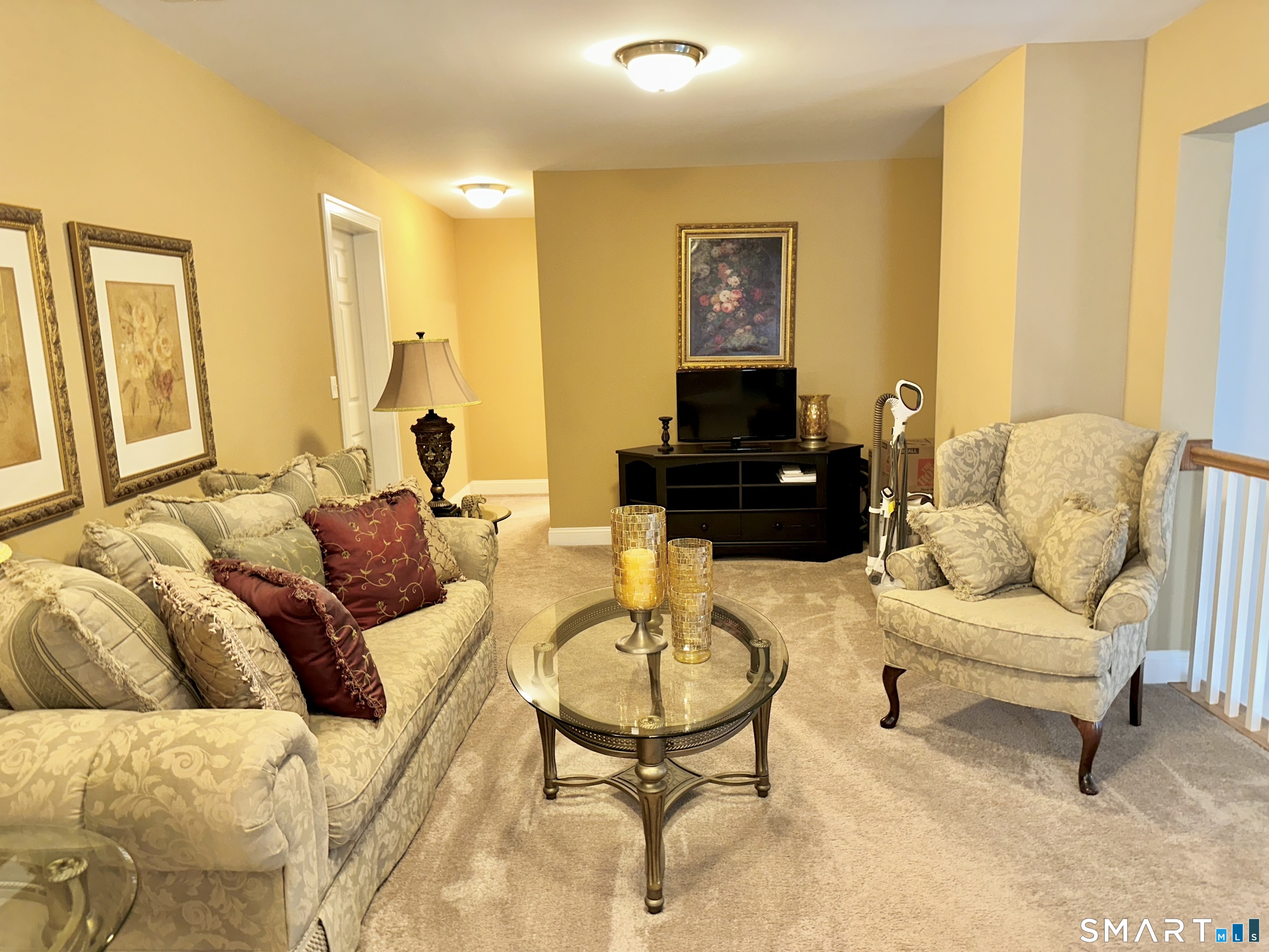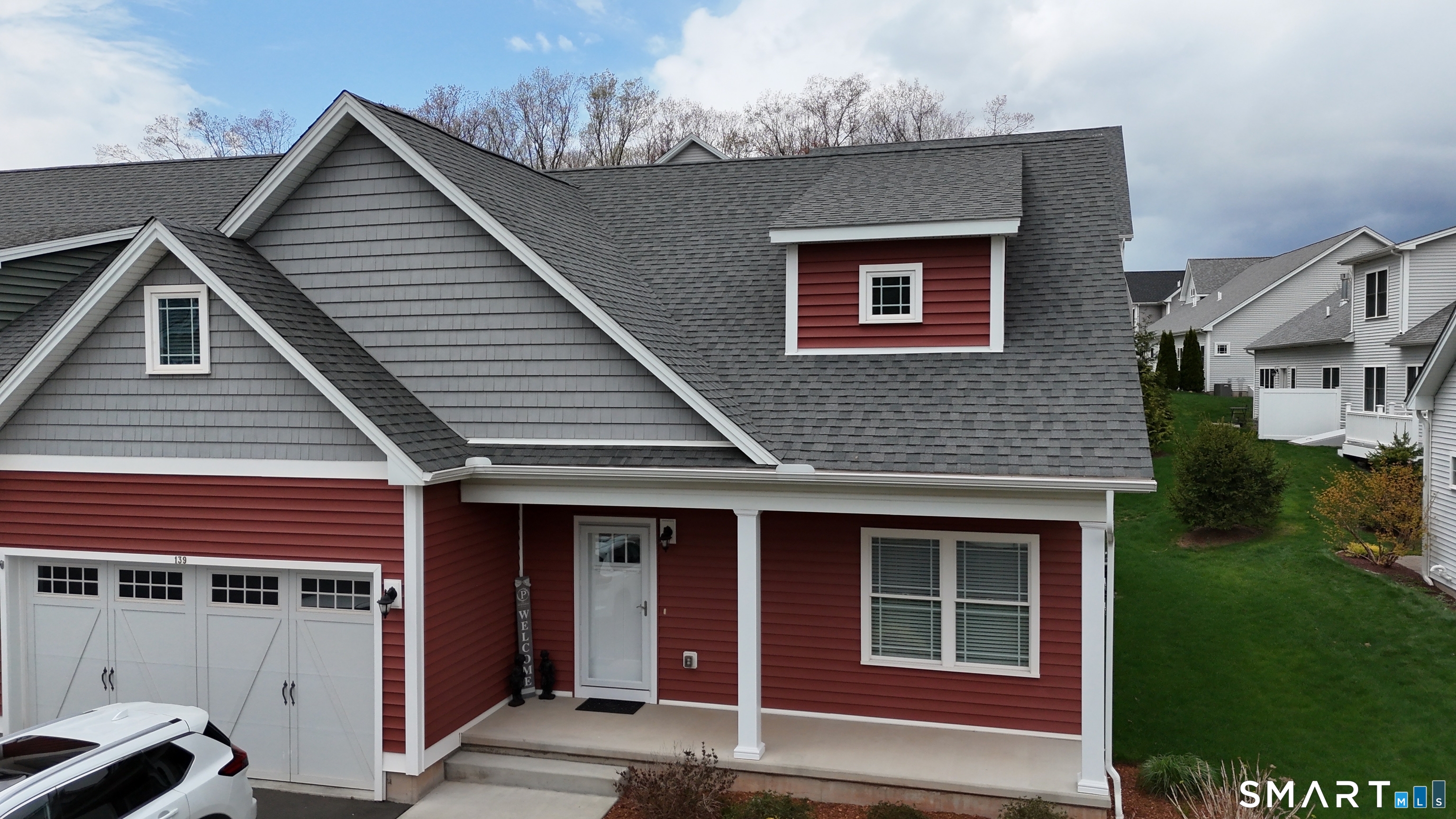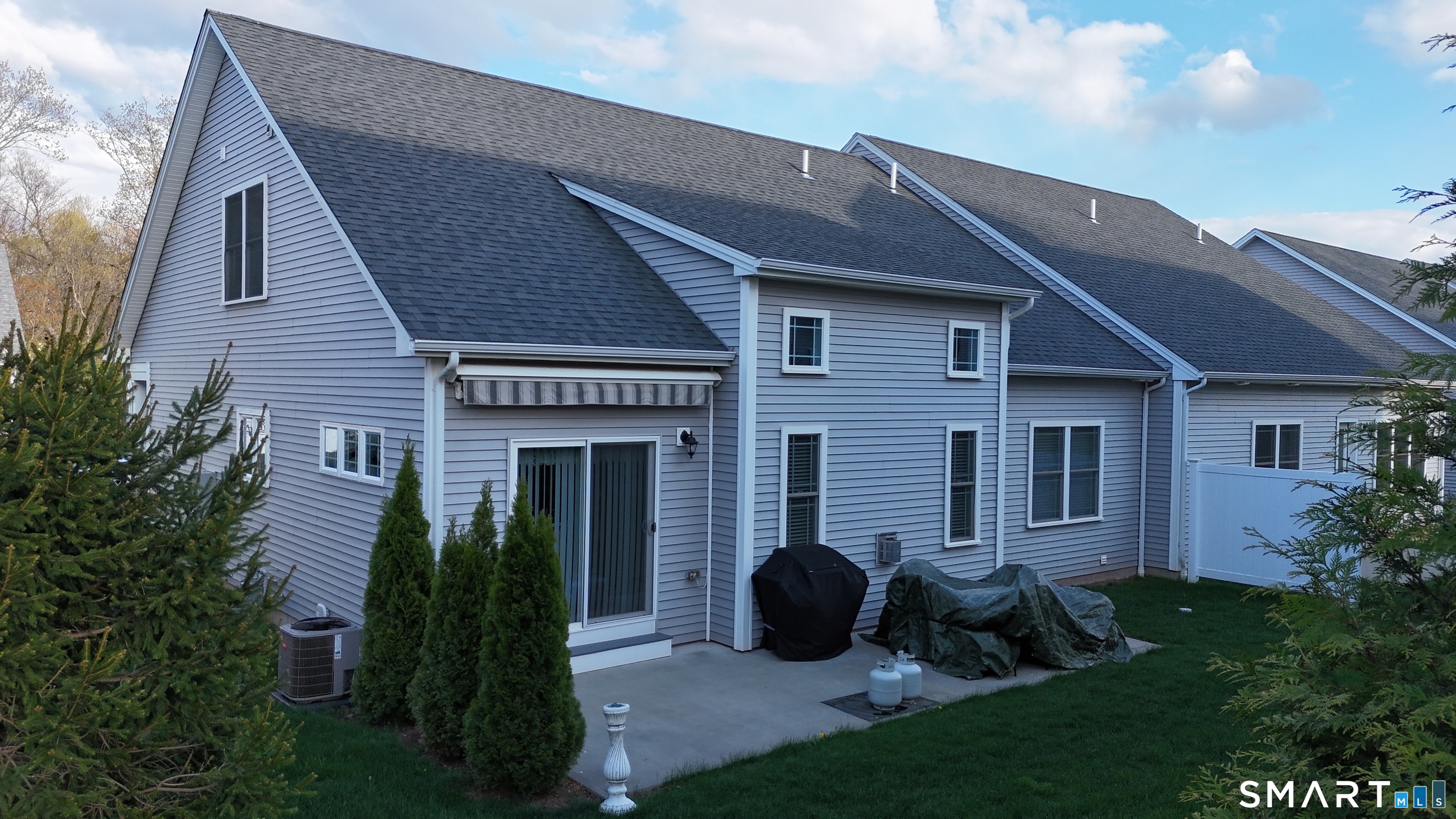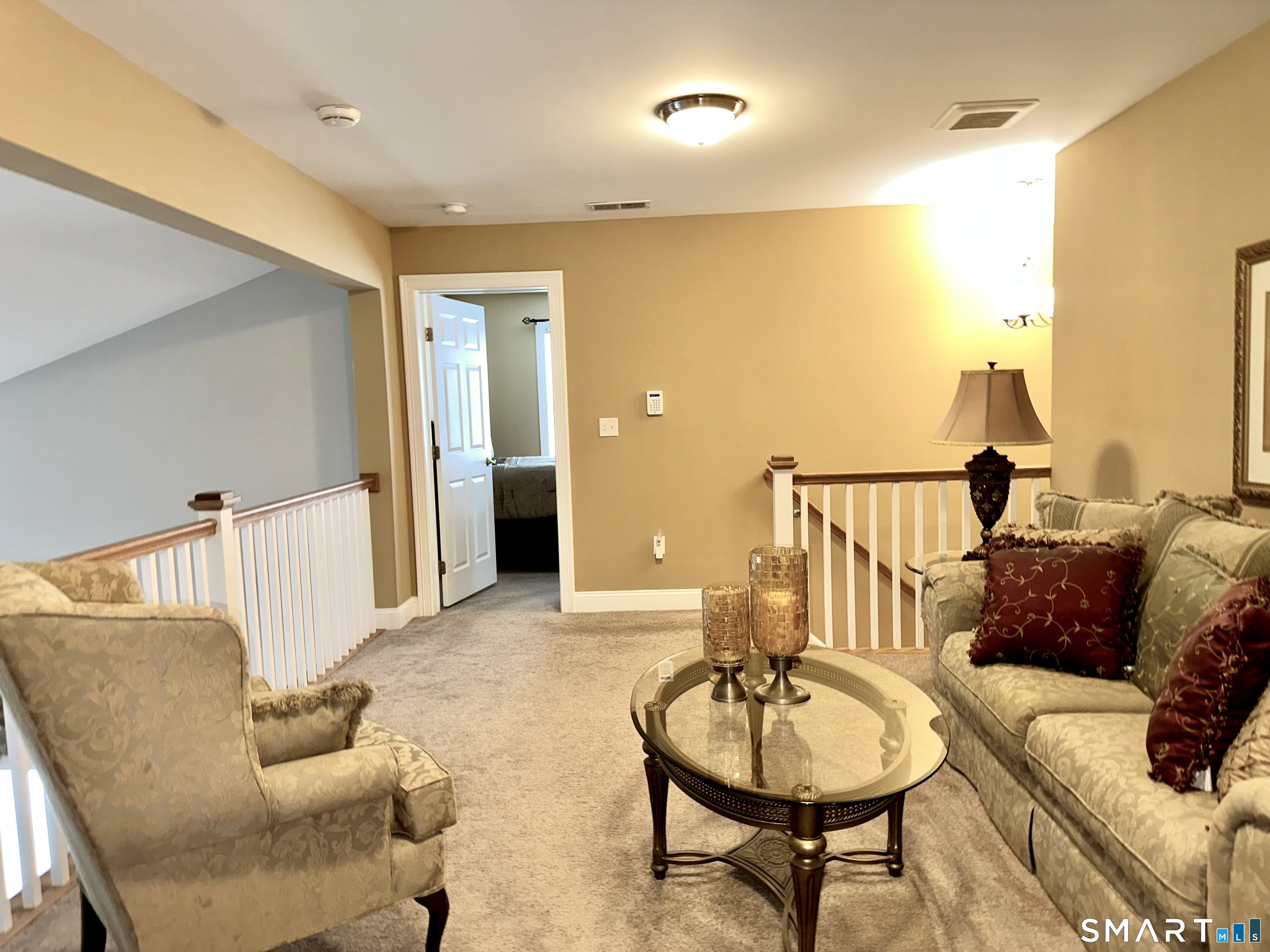 A rare opportunity to own a truly upgraded Brigham model. Designed for effortless main level living, the floor plan offers two main floor bedrooms (one currently used as an office), an open flow living area, and direct access from the attached garage. A gas fireplace with direct vent anchors the two story great room, complemented by hardwood flooring throughout the main level including the primary bedroom, wainscoting in the kitchen, rain finished glass shower doors in both full baths, three ceiling fans, and surround sound wiring in five locations with receiver included. The upper level features a third bedroom, a full bath, and an oversized loft well suited as a second living area, media room, or home office, plus a generous finishable storage area ready to expand the living footprint. A full basement adds storage and features additional electrical outlets installed beyond code. Enjoy natural gas heat, a new gas hot water heater installed February 2026, public water, and public sewer. Step outside to the largest patio in the complex, an 8x16 space paired with a retractable awning for shade on demand. Tucked into a wooded setting, the home is minutes to Interstate 91, the Wilbur Cross Parkway, Yale New Haven Hospital, Quinnipiac University, downtown New Haven, and ample shopping and dining.