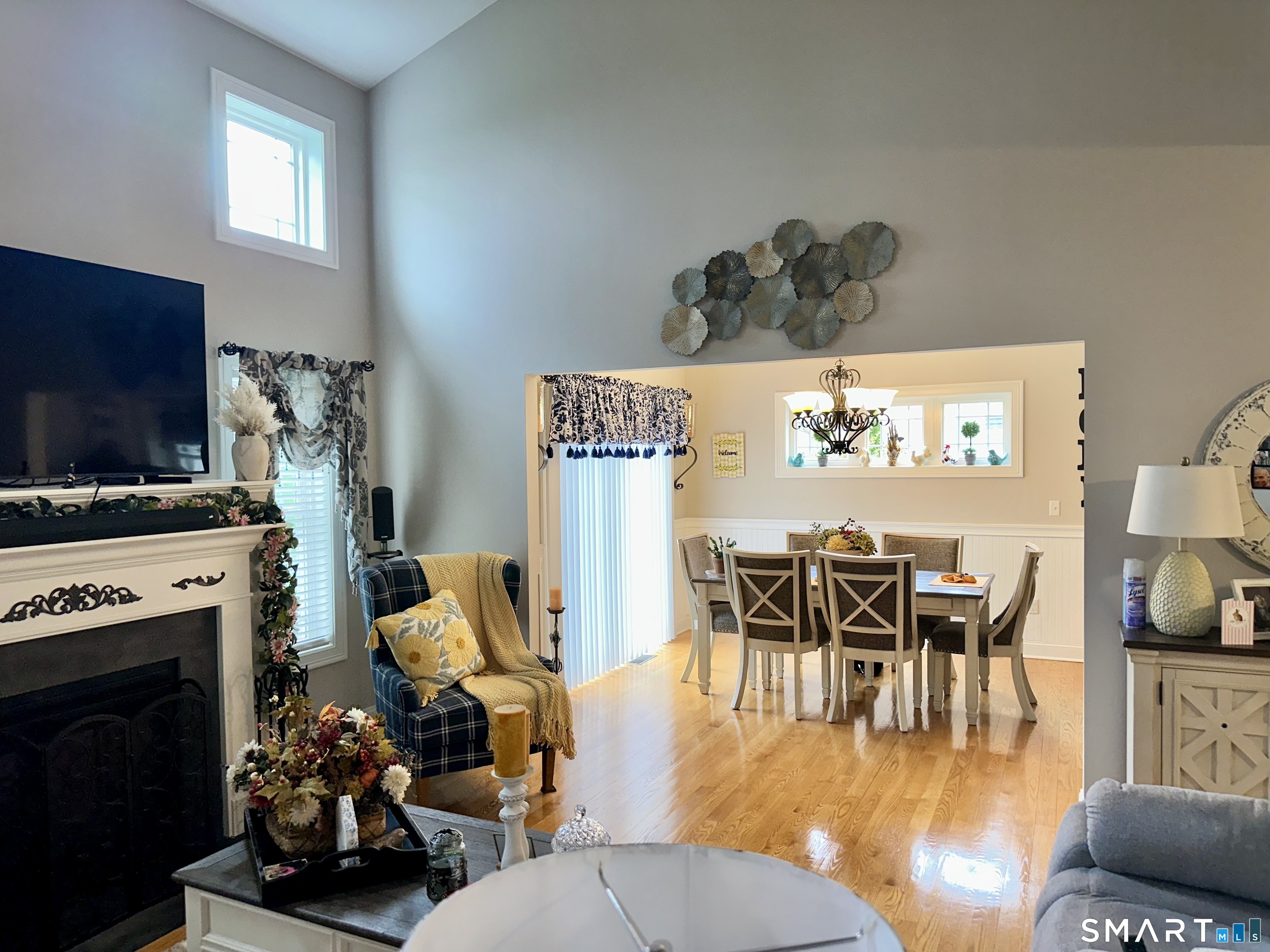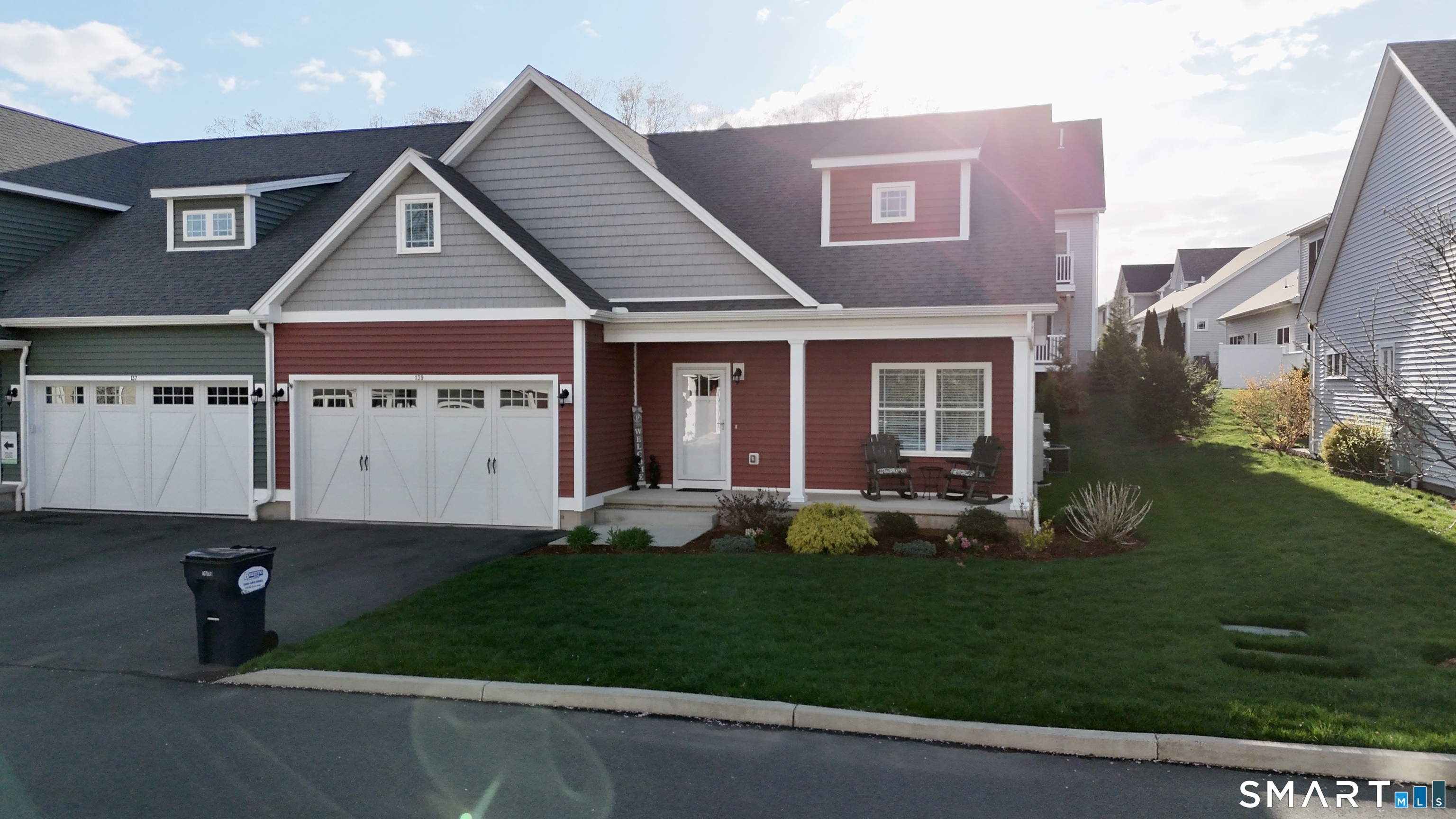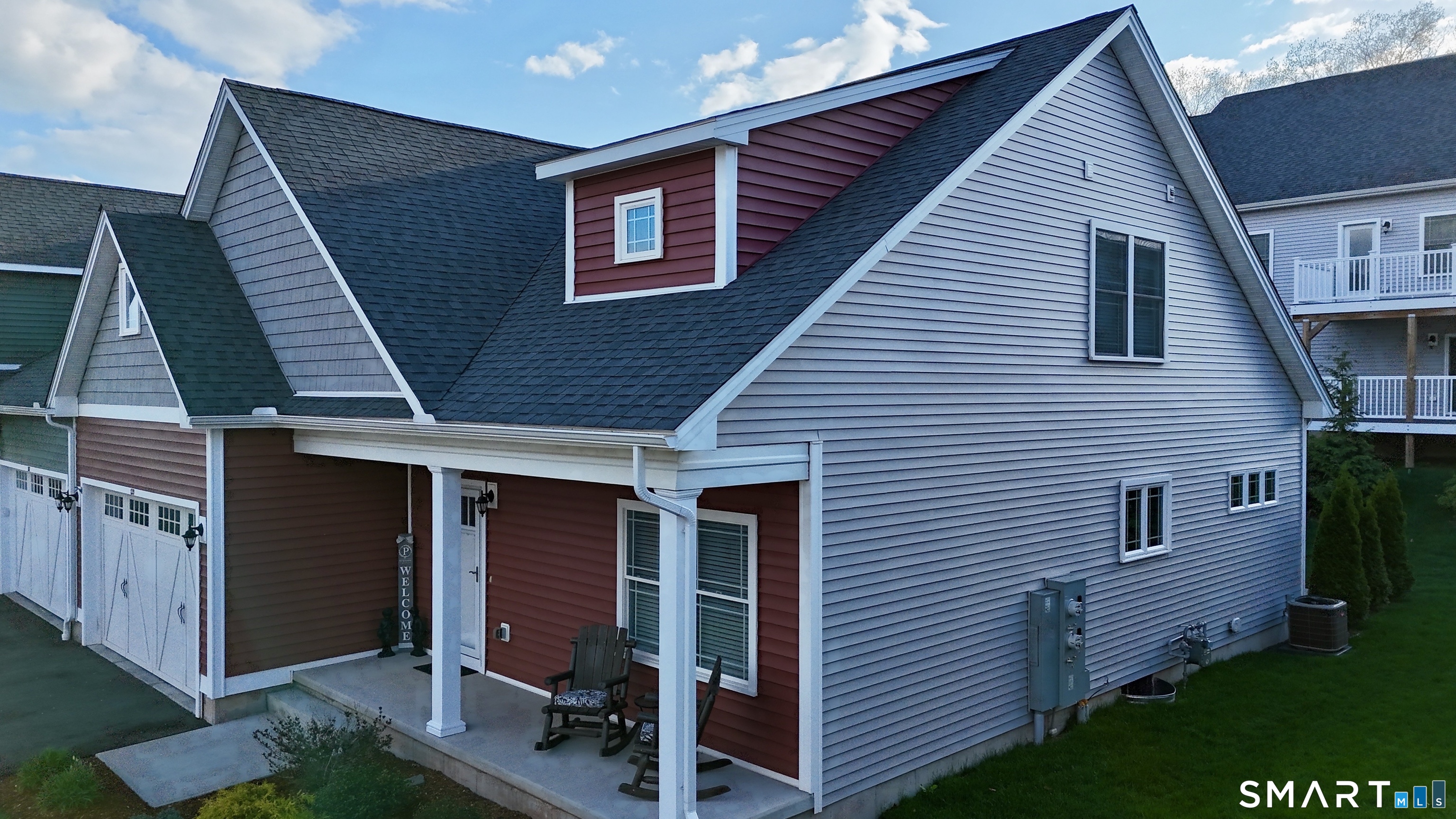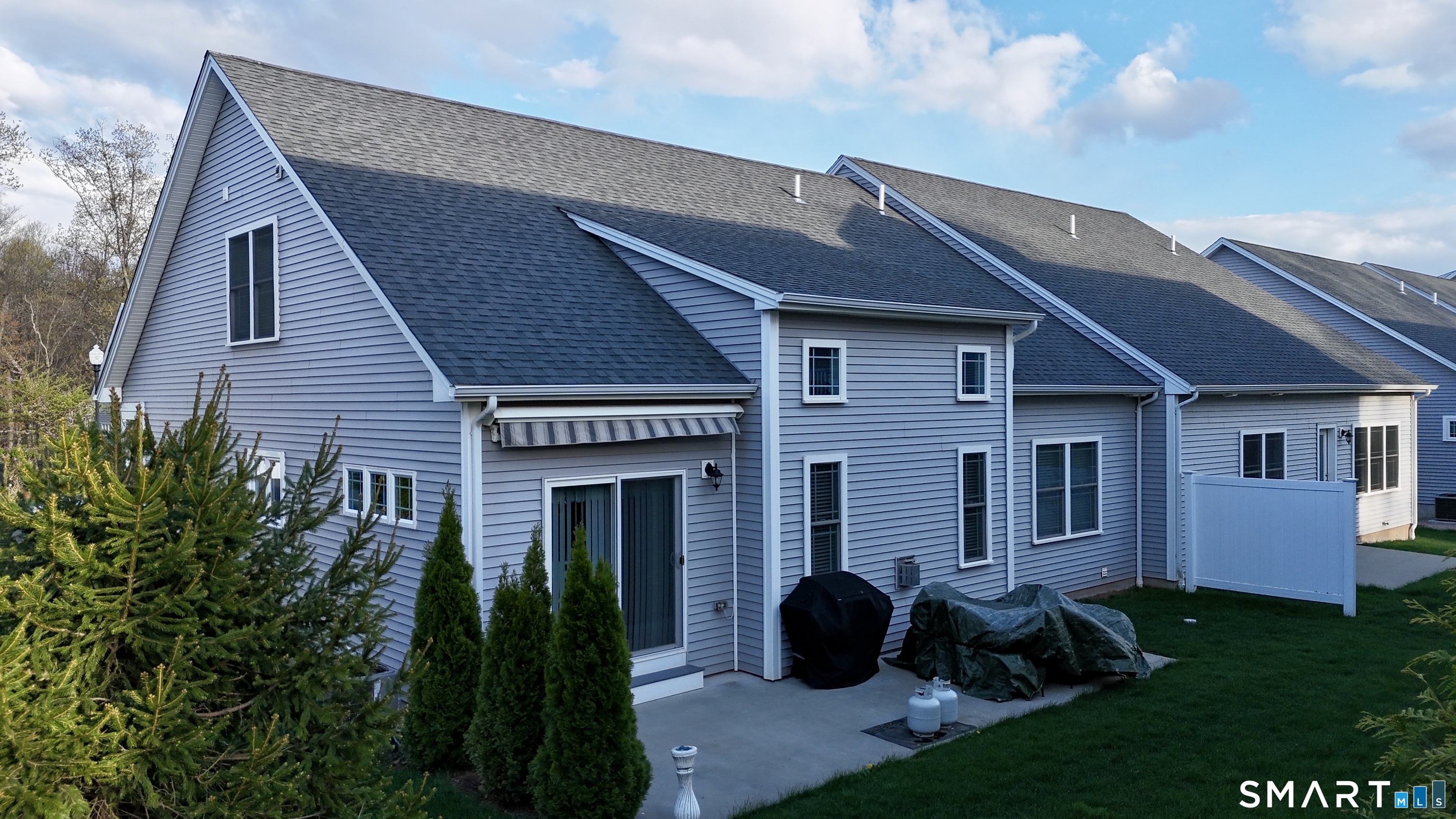 A rare opportunity to own a truly upgraded Brigham model. Designed for effortless main level living, the floor plan offers two main floor bedrooms (one currently used as an office), an open flow living area, and direct access from the attached garage. A gas fireplace with direct vent anchors the two story great room, complemented by hardwood flooring throughout the main level including the primary bedroom, wainscoting in the kitchen, rain finished glass shower doors in both full baths, three ceiling fans, and surround sound wiring in five locations with receiver included. The upper level features a third bedroom, a full bath, and an oversized loft well suited as a second living area, media room, or home office, plus a generous finishable storage area ready to expand the living footprint. A full basement adds storage and features additional electrical outlets installed beyond code. Enjoy natural gas heat, a new gas hot water heater installed February 2026, public water, and public sewer. Step outside to the largest patio in the complex, an 8x16 space paired with a retractable awning for shade on demand. Tucked into a wooded setting, the home is minutes to Interstate 91, the Wilbur Cross Parkway, Yale New Haven Hospital, Quinnipiac University, downtown New Haven, and ample shopping and dining.
