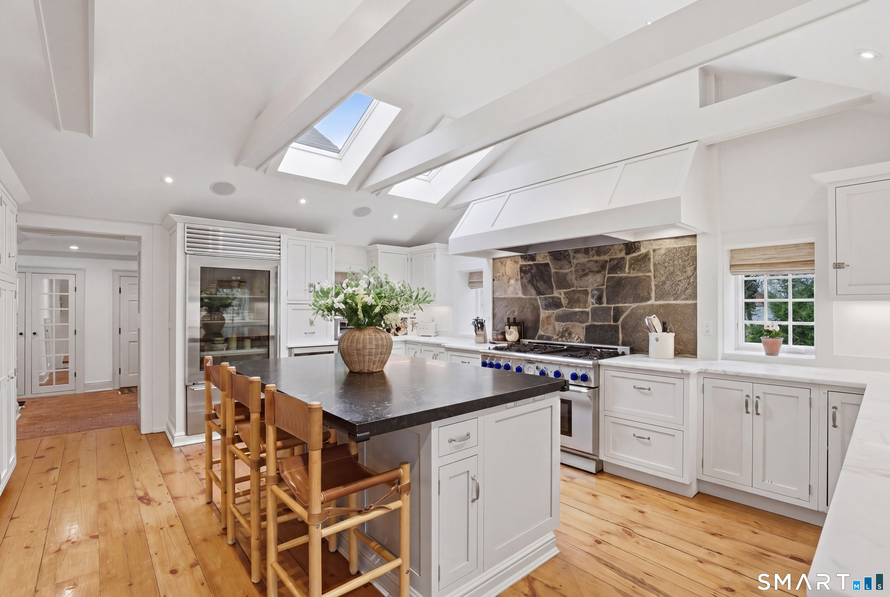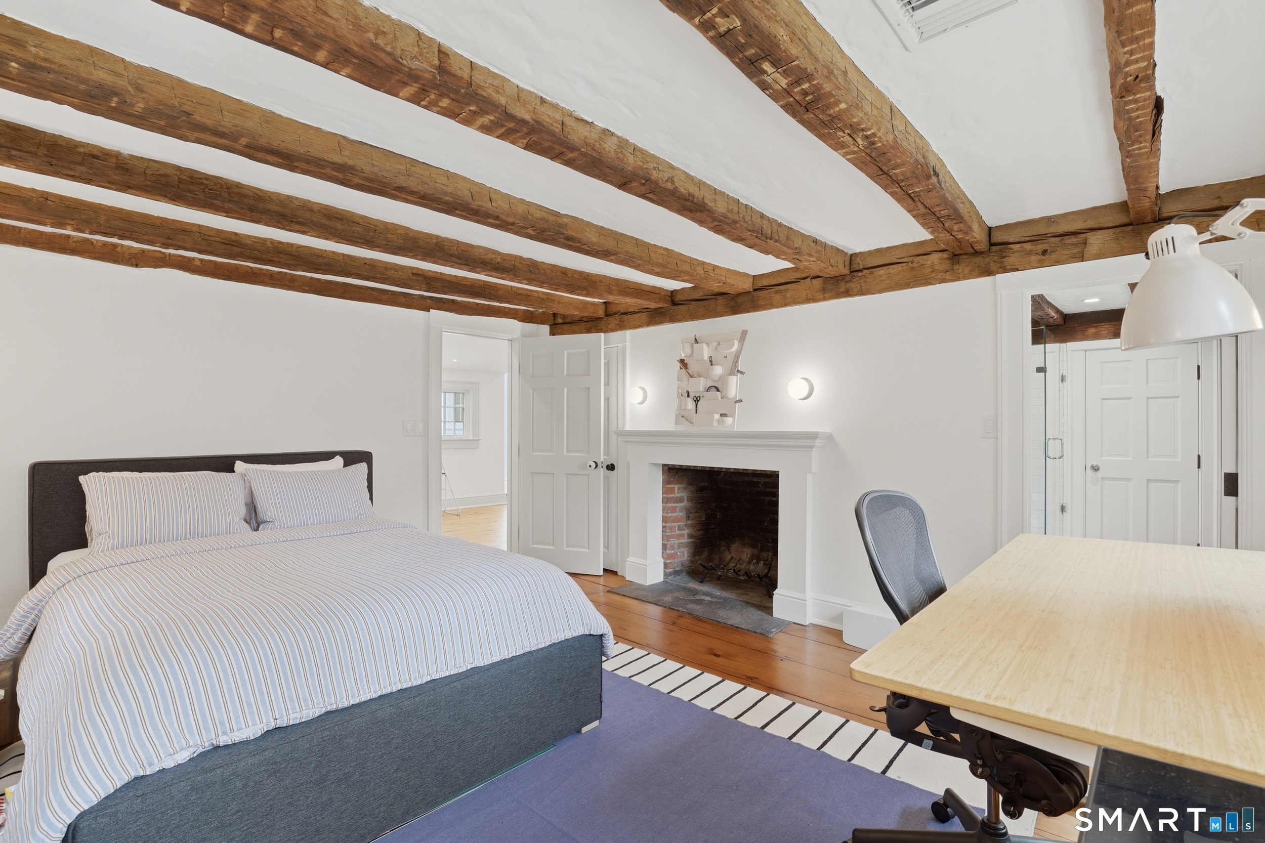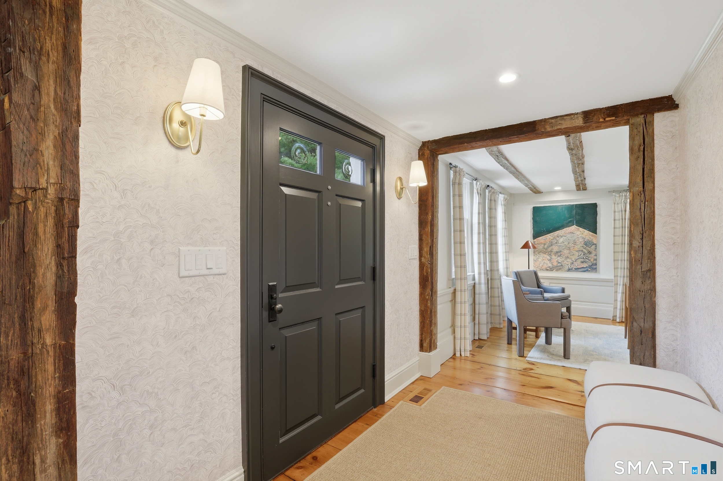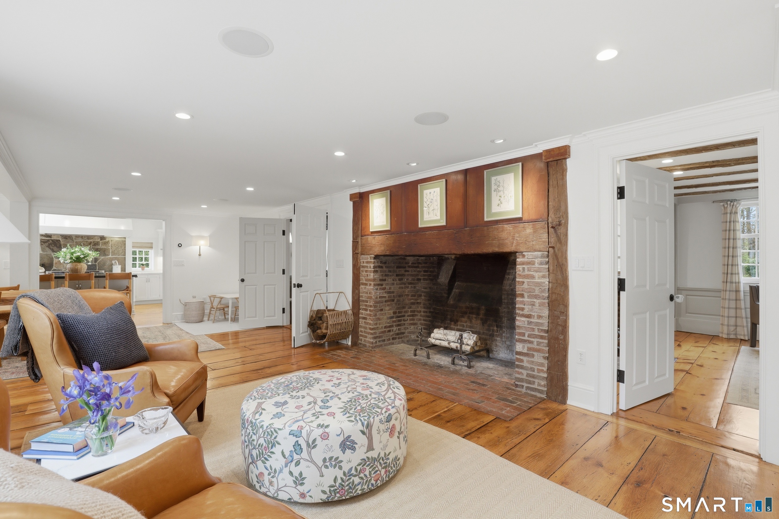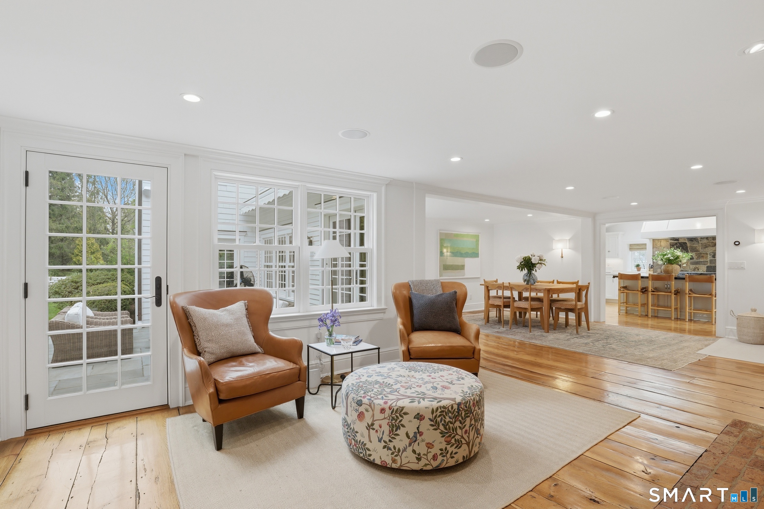 Thoughtfully renovated and expanded, this remarkable five-bedroom, four-and-a-half bath Colonial offers a refined blend of historic character and modern sophistication. Reimagined by acclaimed architect Bo Malpass, the home showcases original details like exposed antique beams, wide plank wood floors, stone fireplaces, and brick accents, all complemented by a refined, cohesive design with timeless finishes throughout. Light-filled interiors flow effortlessly, anchored by a stunning marble kitchen and tastefully updated baths, creating an inviting setting for both everyday living and elevated entertaining. French doors enhance the connection to the outdoors while filling the home with natural light. The spacious primary suite is paired with beautifully appointed secondary bedrooms, offering both comfort and easy livability. Set on private, professionally landscaped grounds with a pool, the property enjoys a prime location close to town, train, beaches, Great Island, and Darien's highly regarded schools. A truly special offering, this turnkey home effortlessly blends historic character with modern refinement.