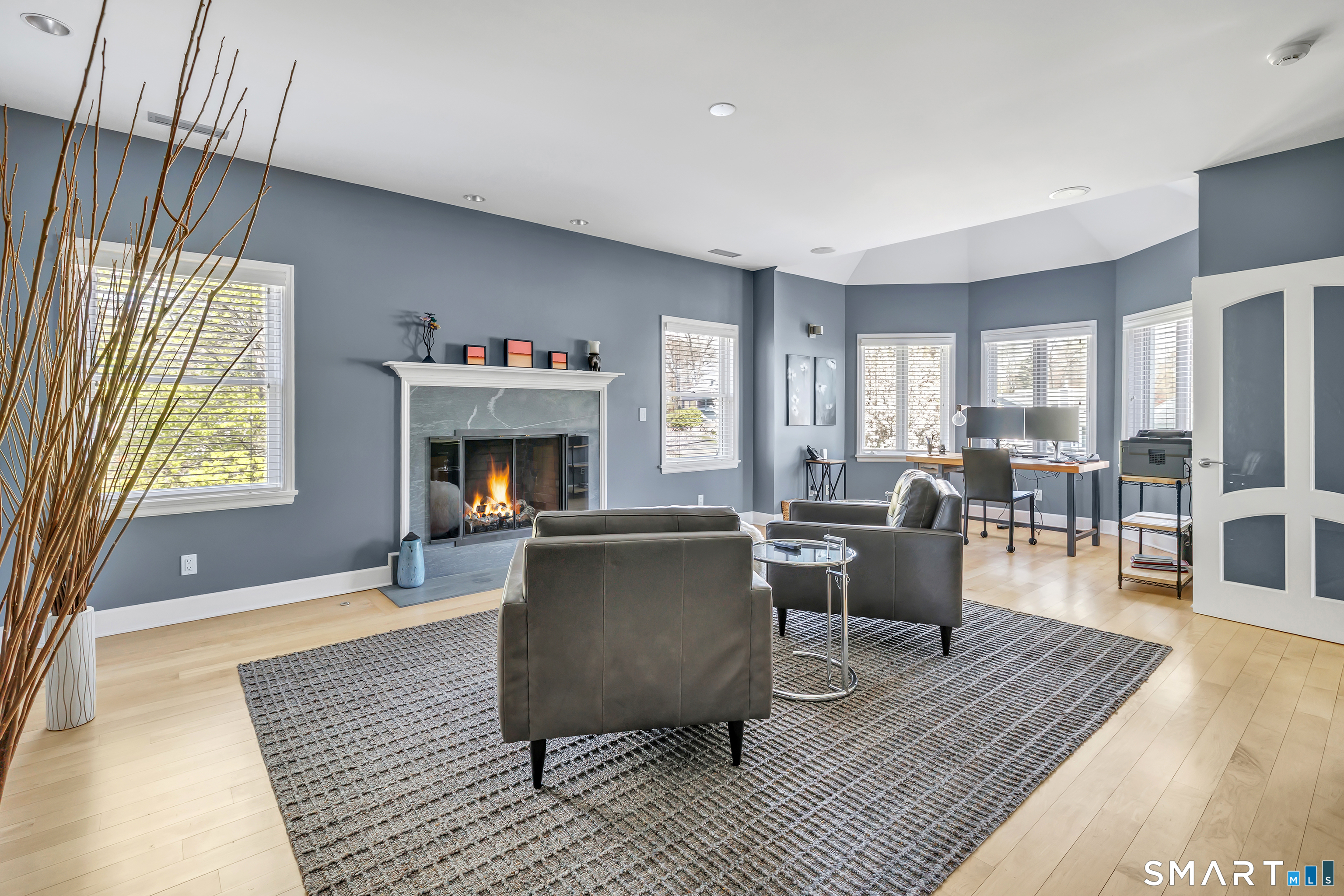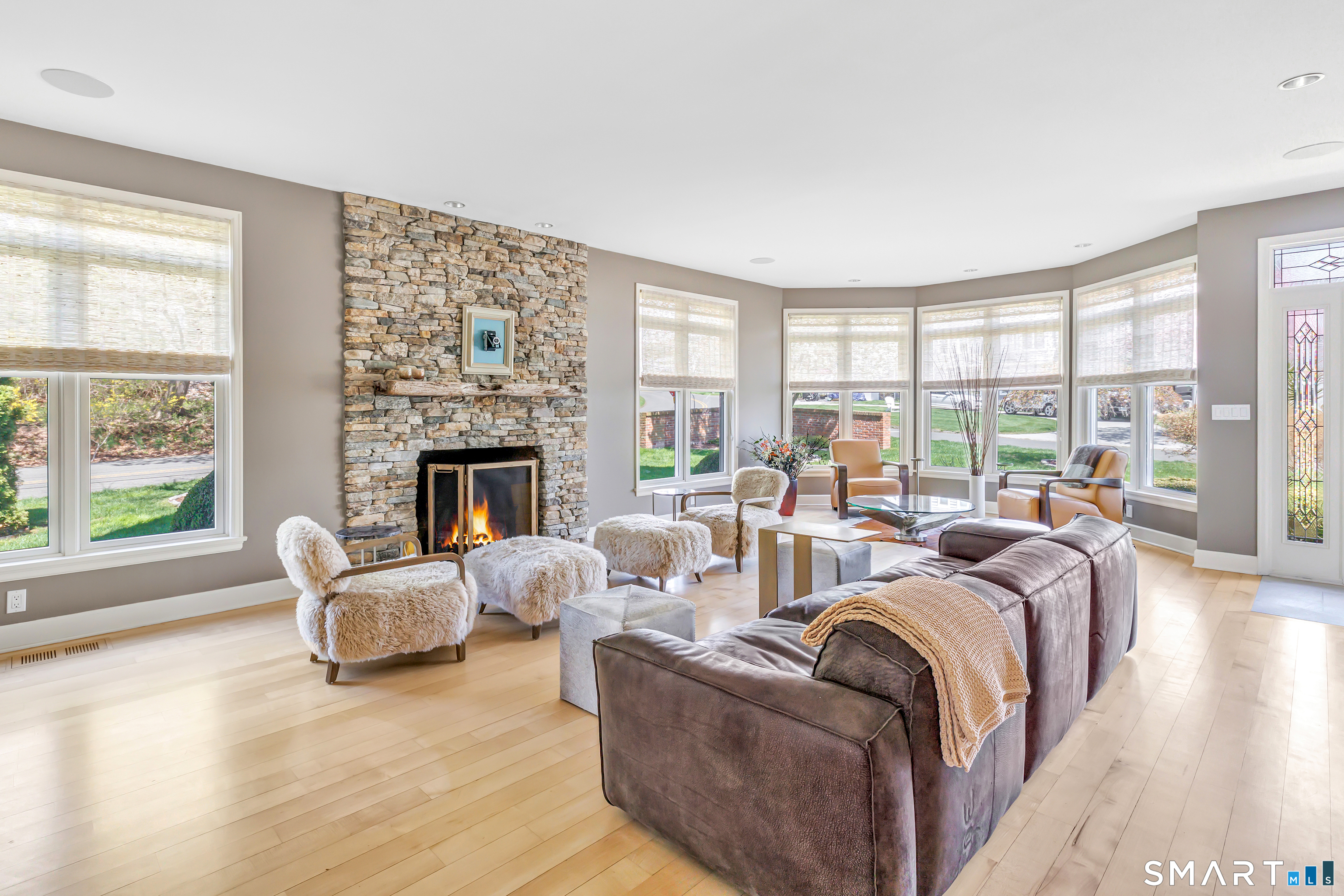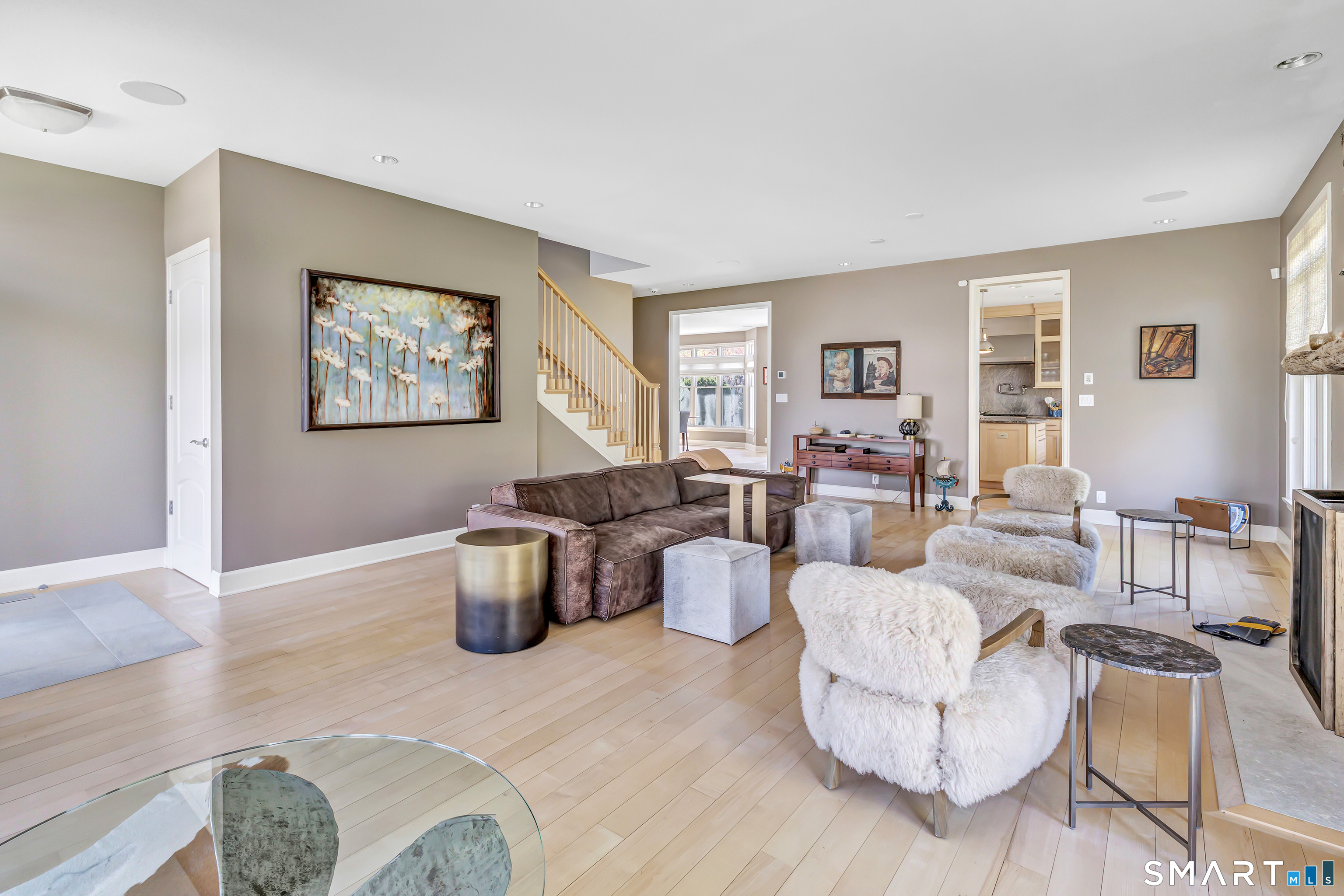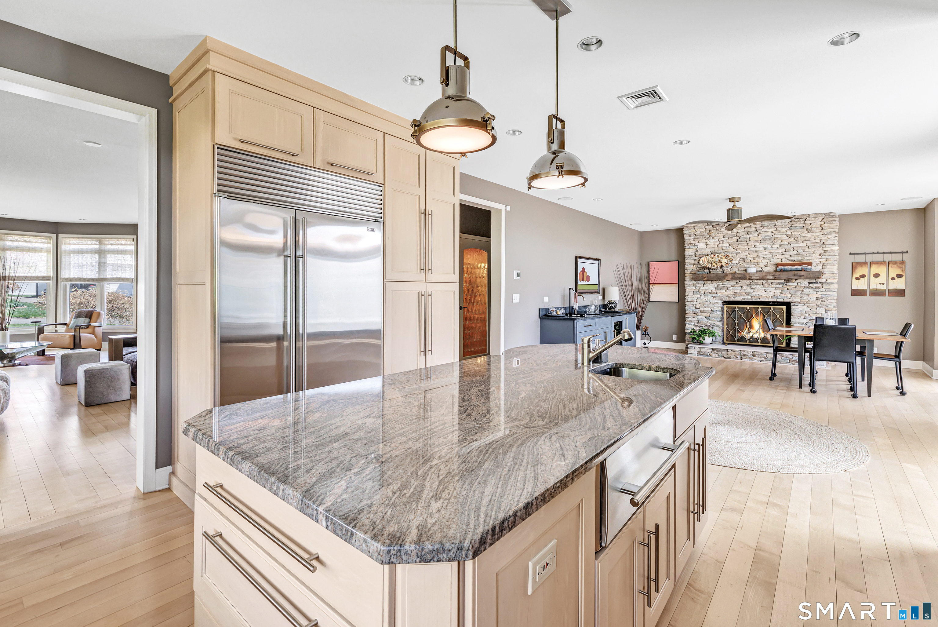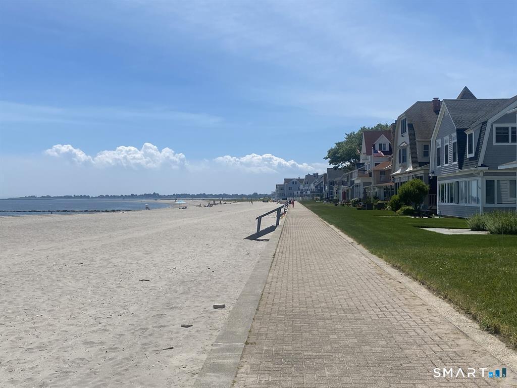 Set within the private Laurel Beach community, this exceptional coastal home offers a refined blend of luxury and lifestyle just steps from the beach. Thoughtfully designed across four finished levels, all serviced by an elevator, the home features stunning high ceilings and light filled spaces throughout. The main level includes a spacious living room with a stone fireplace, flowing into a gourmet kitchen with Wolf cooktop and double ovens, and a center island. A versatile living and dining area with a second fireplace and wet bar opens to a private stone patio with a built-in outdoor kitchen. A mudroom and powder room complete the main level. The second level offers a living area, a full ensuite bedroom with water views, two additional bedrooms, a full bath with jet tub, and a laundry room. The third level is dedicated to the primary suite with water views, built-ins, a walk-in closet and a spa bath with heated floors, towel warmer, second laundry area, soaking jet tub, walk-in steam shower, and dual private bath areas, plus a sitting room with fireplace, wet bar, and office space. The finished lower level includes a wine cellar, yoga studio, recreation space, and mechanical room with workbench. New since 2023 are three AC units along with a whole house generator. A rare opportunity in one of Milford's most desirable beach communities, just steps to the private beach, clubhouse, and newly renovated tennis and pickleball courts.