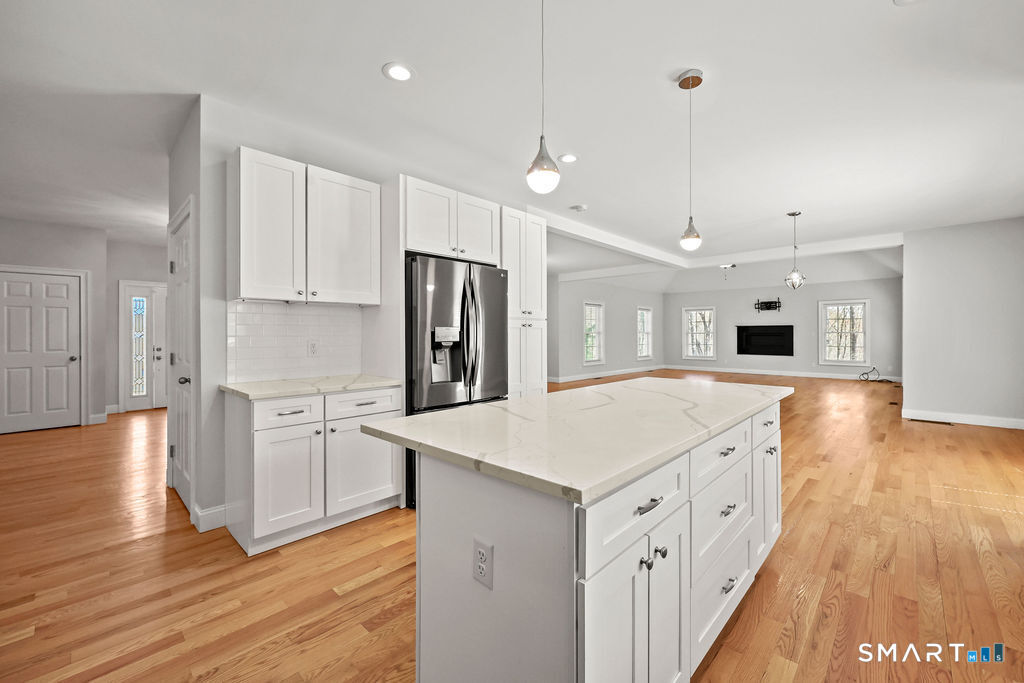 This is the one you've been waiting for! Step into this stunning 4,000+ square foot Colonial built in 2021, filled with abundant natural light and gleaming hardwood floors. The expansive main floor features an open floorplan with soaring ceilings, a generous dining area and a living area anchored by a gas fireplace. The gorgeous kitchen has a bright breakfast nook that opens to the backyard and patio through elegant French doors. There is a formal sitting room off the front foyer that could be utilized as a quiet study or home office. There is also a main-floor bedroom and full bath that add flexibility for guests or multigenerational living. Upstairs you'll find four additional bedrooms, including a luxurious primary suite with a spa-like bath-large tile shower, freestanding tub, double sink vanity, and a spacious walk-in closet. An additional full bathroom and a dedicated laundry room complete the second level for everyday ease. The lower level delivers over 1,000 square feet of finished space with its own full bathroom, extra storage, and direct access to the oversized three-car garage. Thoughtful storage and practical layout make this basement ideal for recreation, a home gym, or media room. Located just minutes from shopping, parks, walking trails, and with easy highway access, this turn-key home is move-in ready and waiting for you. Schedule your showing today and experience modern Colonial living at its best.