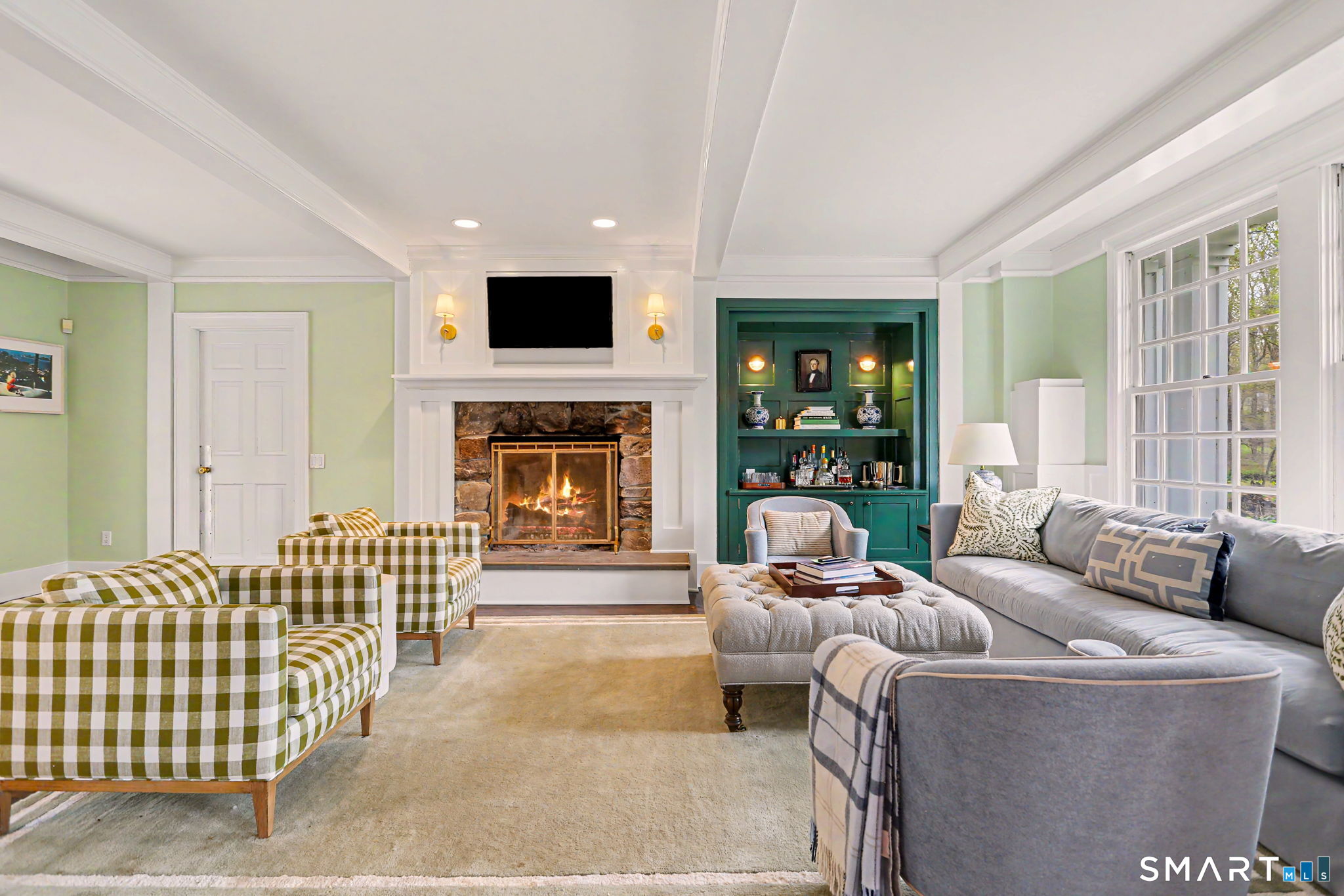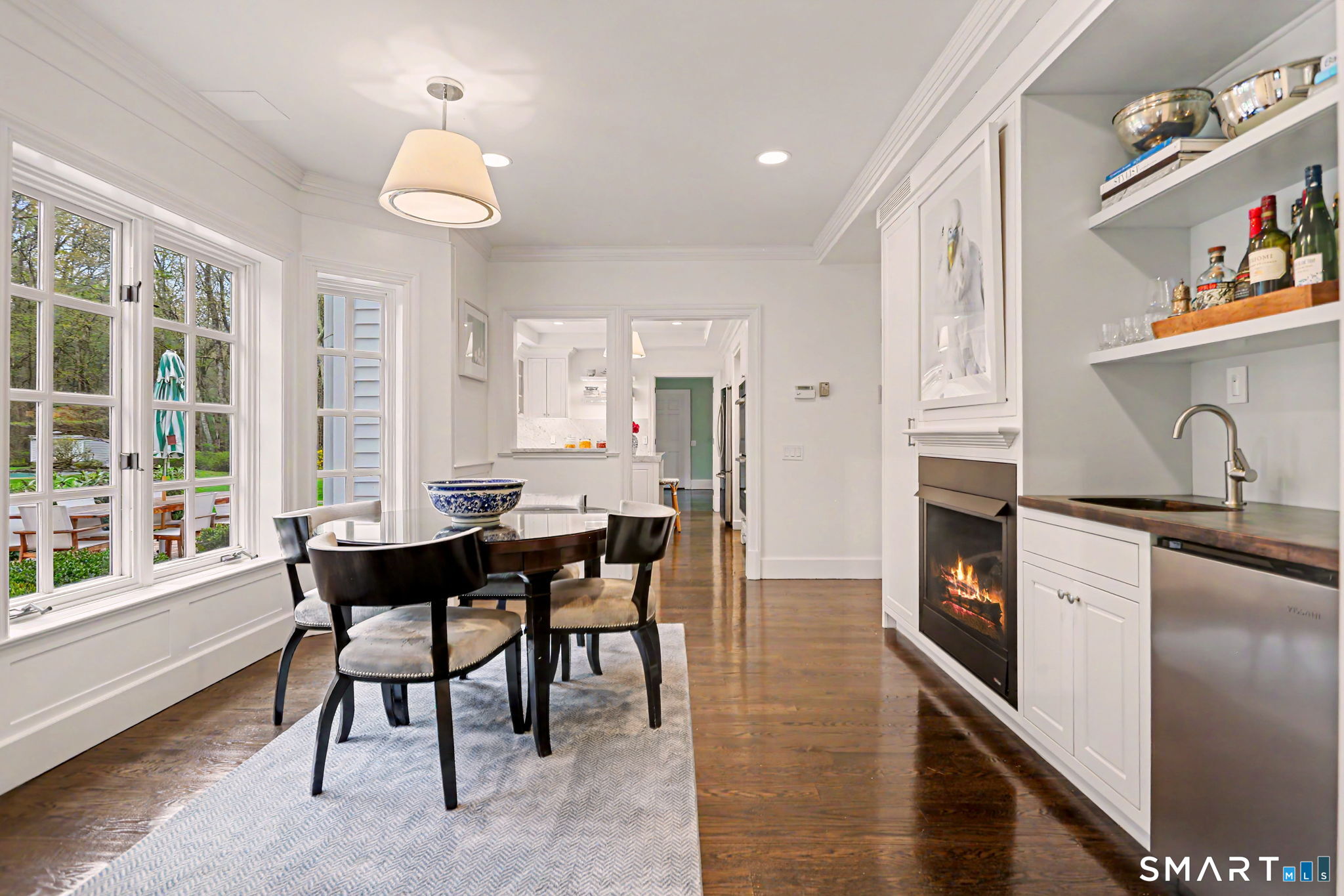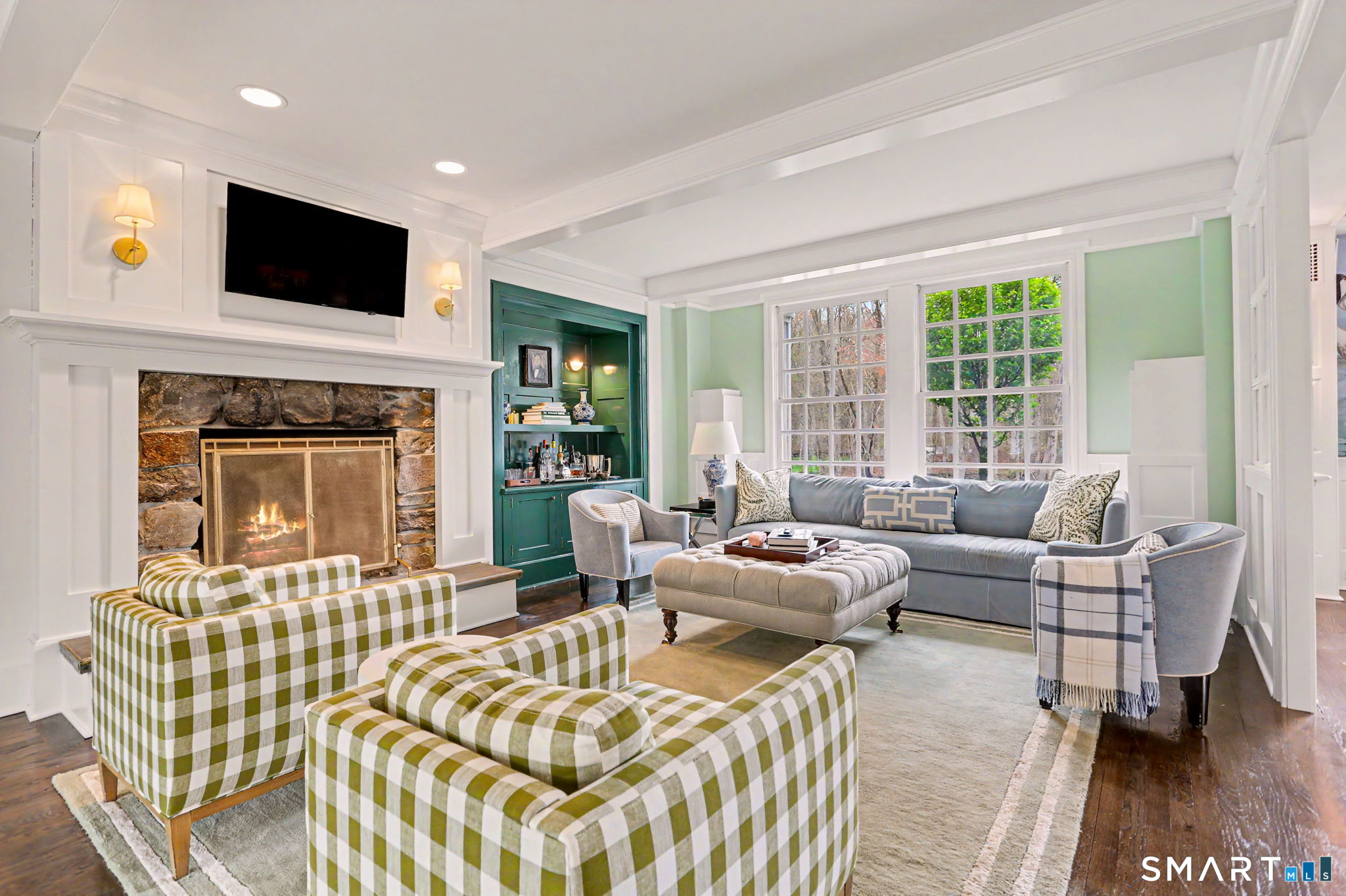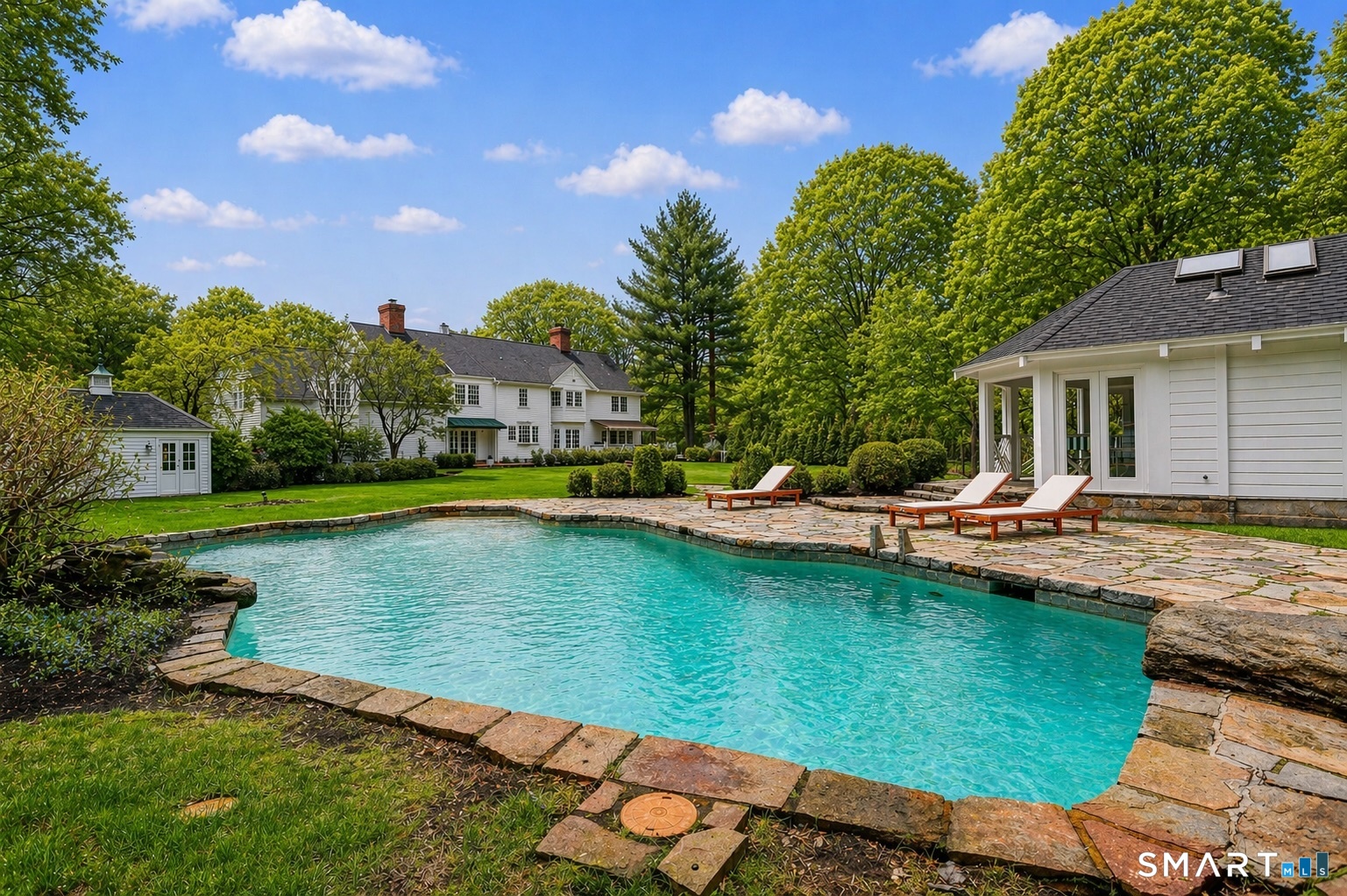Welcome to 66 Gate Stone Lane, a quintessential Connecticut estate in the heart of historic Greenfield Hill. A gated entrance introduces this private 3.8-acre property, ideally positioned at the end of a quiet cul-de-sac among other distinguished homes. A gracious stone path leads to a double-height foyer, setting the tone for the home's refined architectural details and thoughtfully updated interiors. The formal living room features a fireplace, custom built-ins, and French doors opening to an outdoor dining area. A wood-paneled library with parquet floors offers serene views of the garden pond, while the elegant dining room flows seamlessly into a warm and inviting family room with fireplace and direct access to the patio. The home has been extensively and thoughtfully renovated throughout, including a completely redesigned chef's kitchen featuring custom cabinetry, high-end finishes, and the addition of a striking fireplace-creating a true heart-of-the-home gathering space. New hardwood floors run throughout, complemented by updated powder rooms and a state-of-the-art water filtration system. Upstairs, the expansive primary suite has been fully reimagined, offering a luxurious bedroom retreat with built-ins and window seat, along with a spa-caliber bath finished to the highest standard. Three additional guest bedrooms and a versatile additional room with Palladian windows-ideal for office or play-complete the second level.