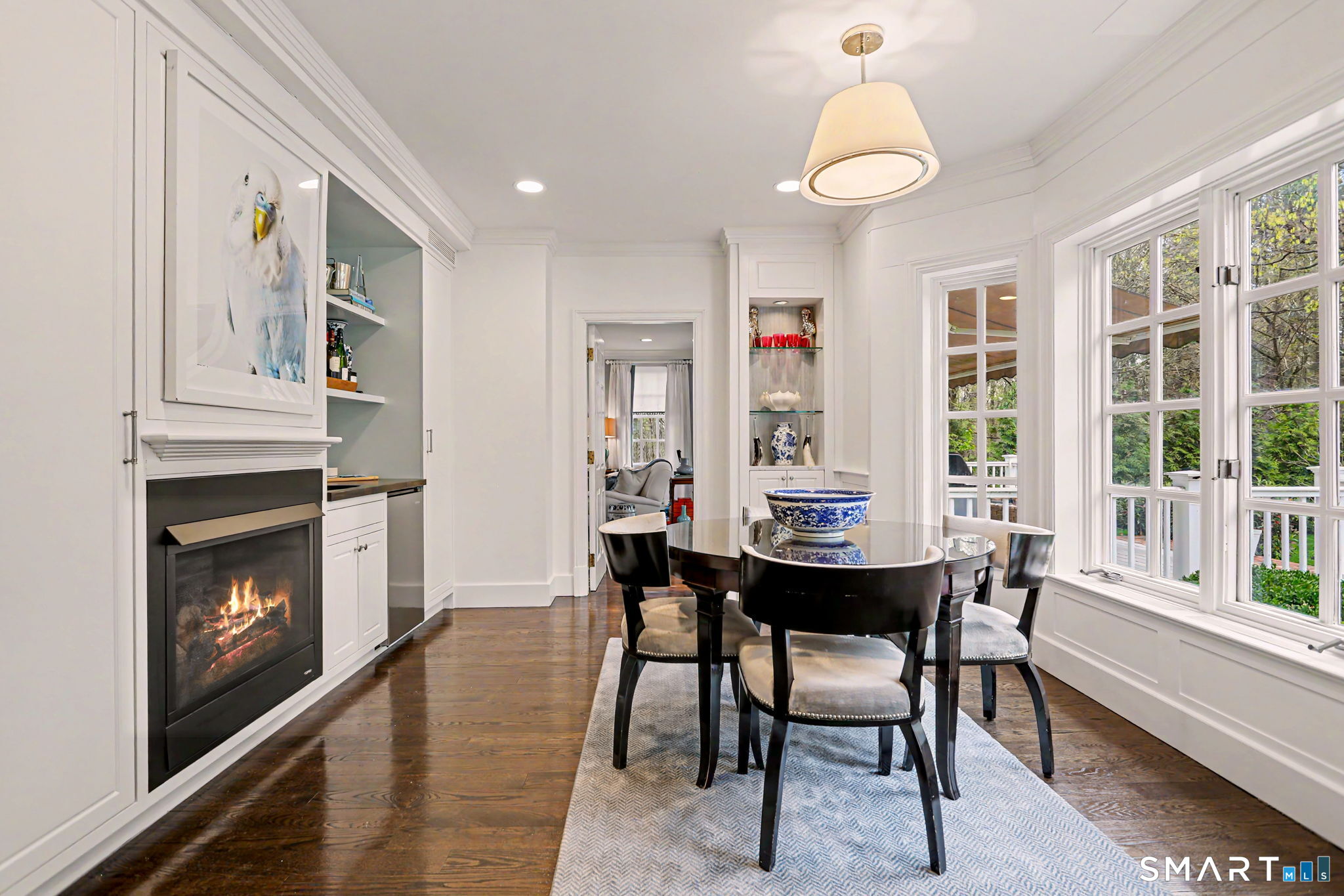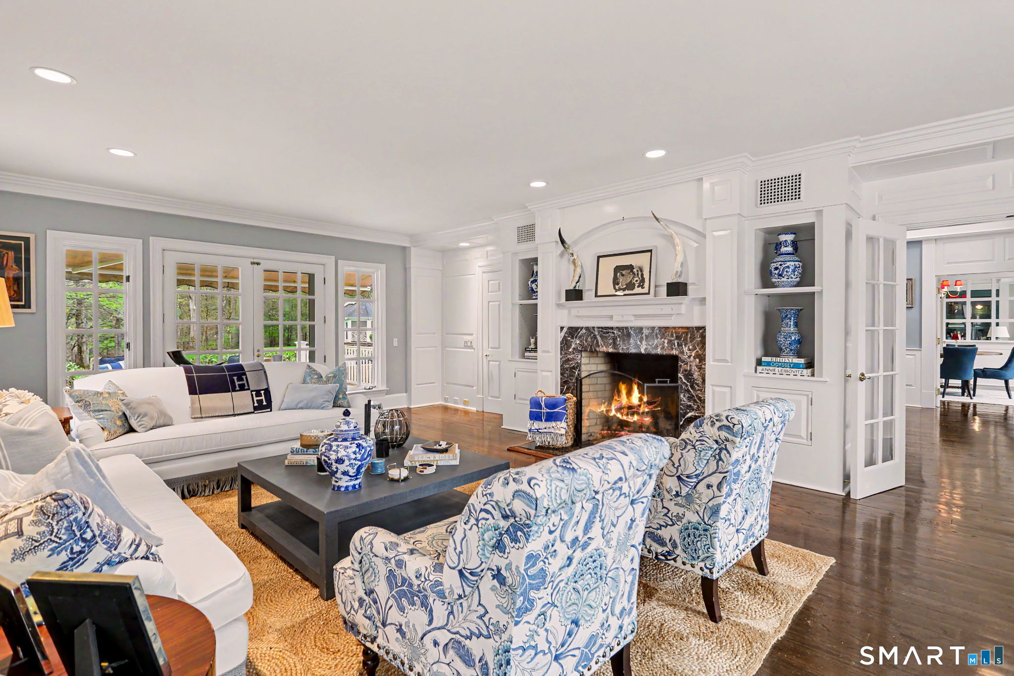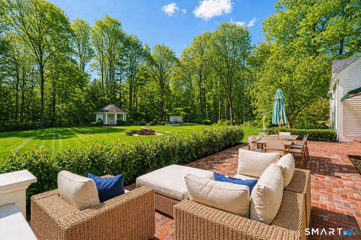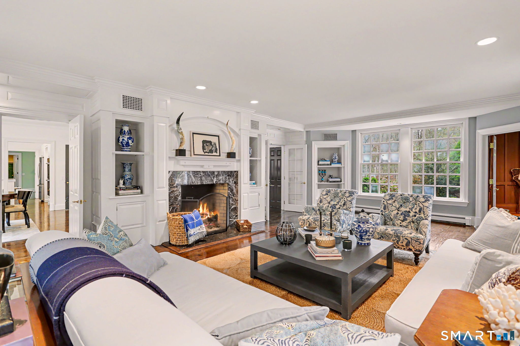 Welcome to 66 Gate Stone Lane, a quintessential Connecticut estate in the heart of historic Greenfield Hill. A gated entrance introduces this private 3.8-acre property, ideally positioned at the end of a quiet cul-de-sac among other distinguished homes. A gracious stone path leads to a double-height foyer, setting the tone for the home's refined architectural details and thoughtfully updated interiors. The formal living room features a fireplace, custom built-ins, and French doors opening to an outdoor dining area. A wood-paneled library with parquet floors offers serene views of the garden pond, while the elegant dining room flows seamlessly into a warm and inviting family room with fireplace and direct access to the patio. The home has been extensively and thoughtfully renovated throughout, including a completely redesigned chef's kitchen featuring custom cabinetry, high-end finishes, and the addition of a striking fireplace-creating a true heart-of-the-home gathering space. New hardwood floors run throughout, complemented by updated powder rooms and a state-of-the-art water filtration system. Upstairs, the expansive primary suite has been fully reimagined, offering a luxurious bedroom retreat with built-ins and window seat, along with a spa-caliber bath finished to the highest standard. Three additional guest bedrooms and a versatile additional room with Palladian windows-ideal for office or play-complete the second level.
