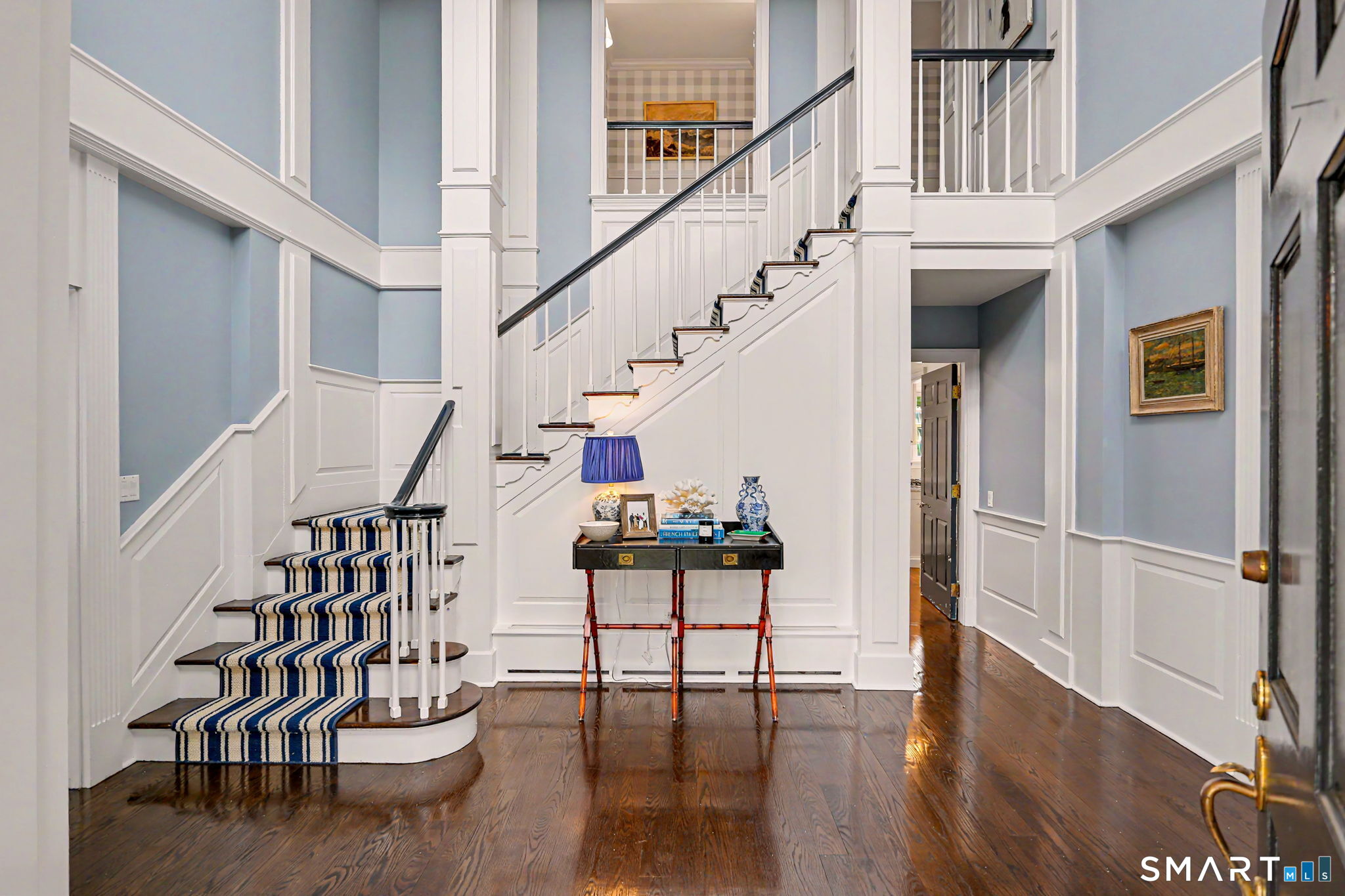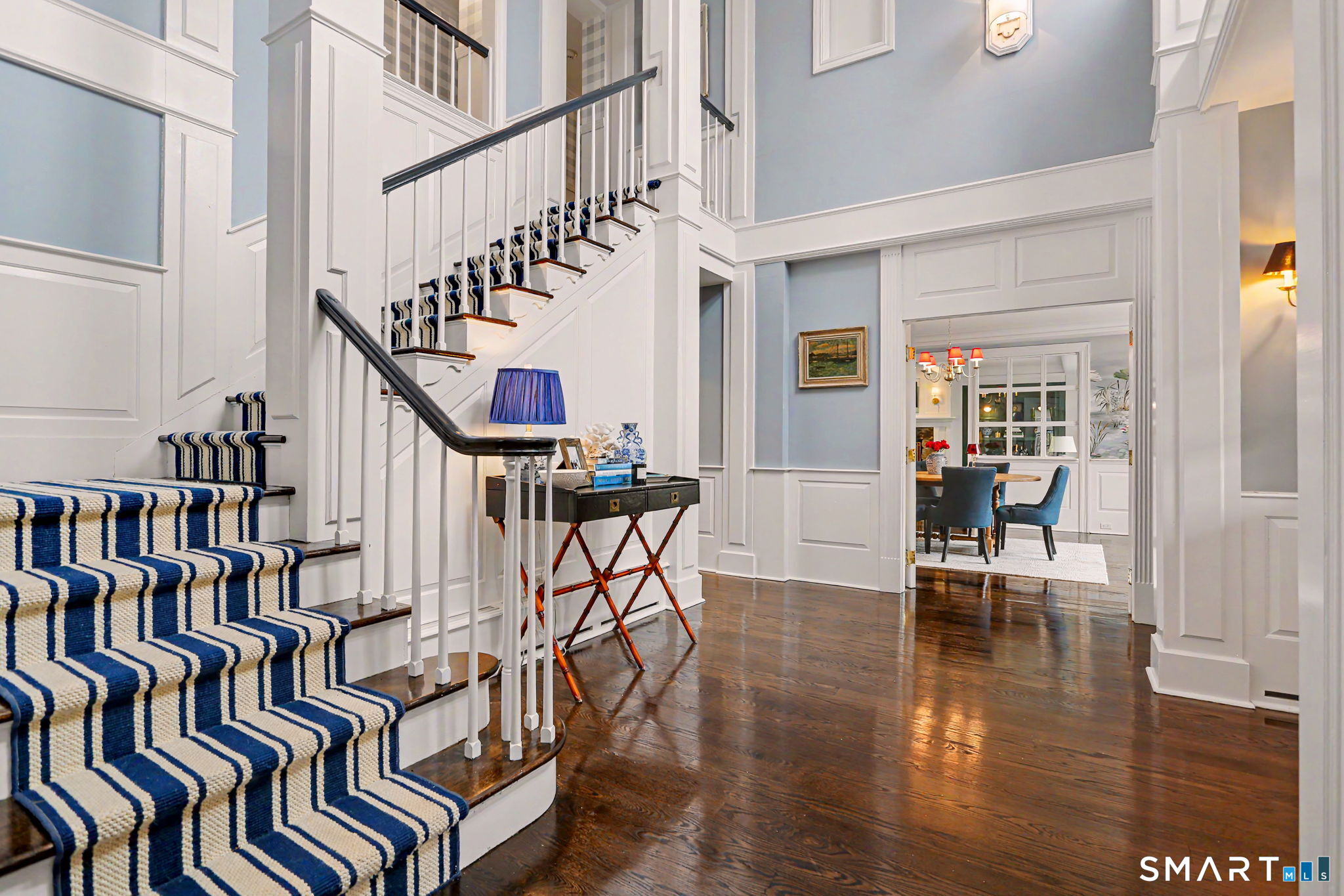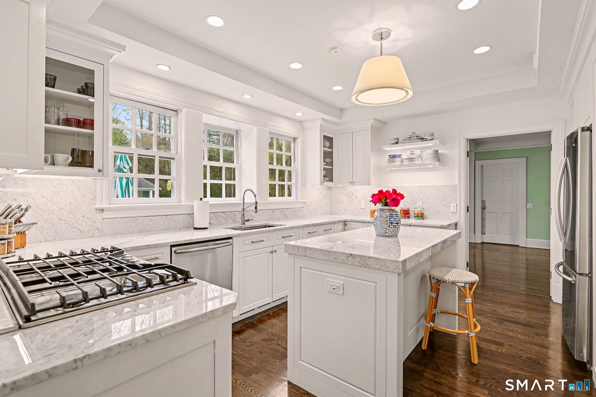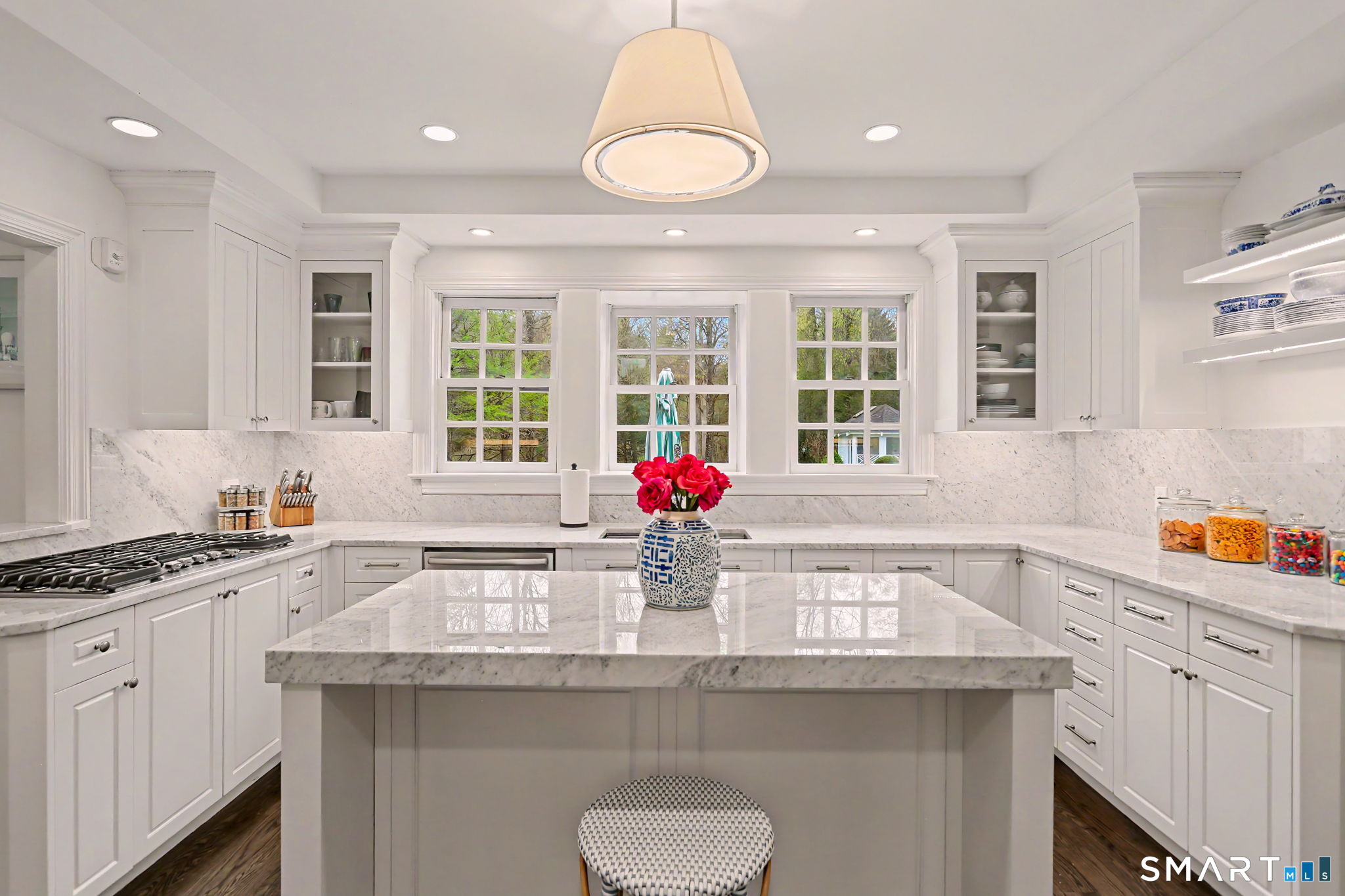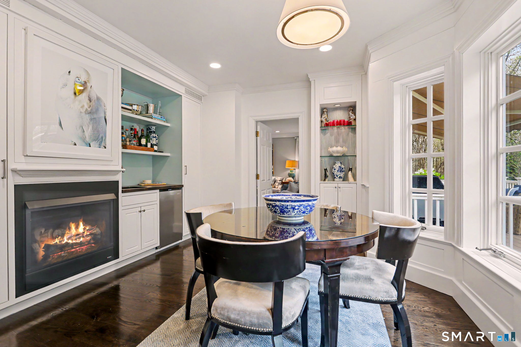 Welcome to 66 Gate Stone Lane, a quintessential Connecticut estate in the heart of historic Greenfield Hill. A gated entrance introduces this private 3.8-acre property, ideally positioned at the end of a quiet cul-de-sac among other distinguished homes. A gracious stone path leads to a double-height foyer, setting the tone for the home's refined architectural details and thoughtfully updated interiors. The formal living room features a fireplace, custom built-ins, and French doors opening to an outdoor dining area. A wood-paneled library with parquet floors offers serene views of the garden pond, while the elegant dining room flows seamlessly into a warm and inviting family room with fireplace and direct access to the patio. The home has been extensively and thoughtfully renovated throughout, including a completely redesigned chef's kitchen featuring custom cabinetry, high-end finishes, and the addition of a striking fireplace-creating a true heart-of-the-home gathering space. New hardwood floors run throughout, complemented by updated powder rooms and a state-of-the-art water filtration system. Upstairs, the expansive primary suite has been fully reimagined, offering a luxurious bedroom retreat with built-ins and window seat, along with a spa-caliber bath finished to the highest standard. Three additional guest bedrooms and a versatile additional room with Palladian windows-ideal for office or play-complete the second level.