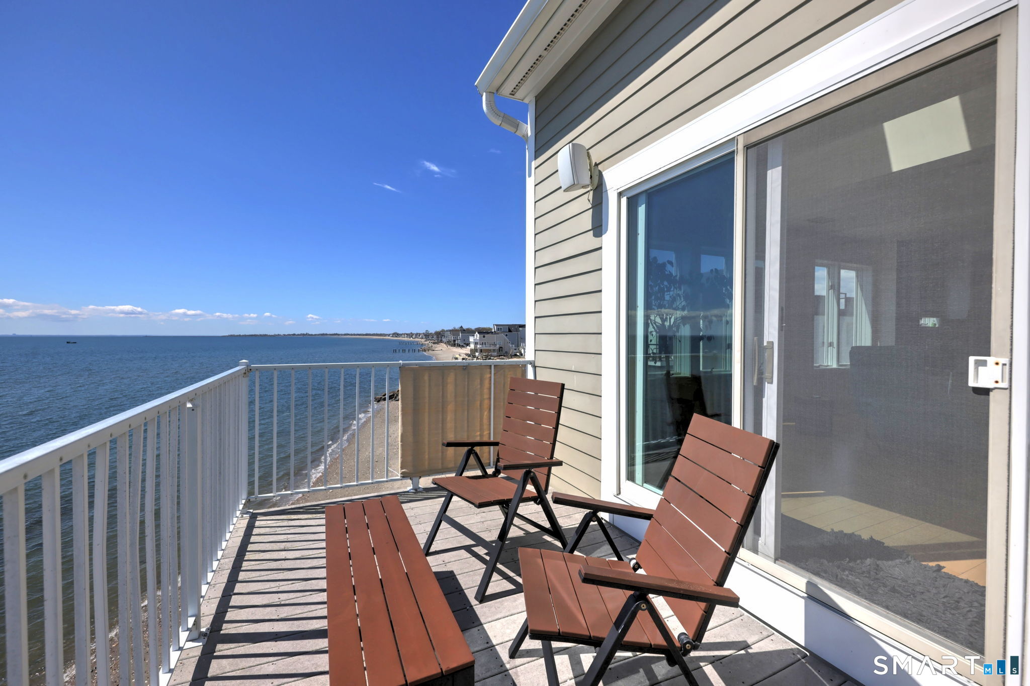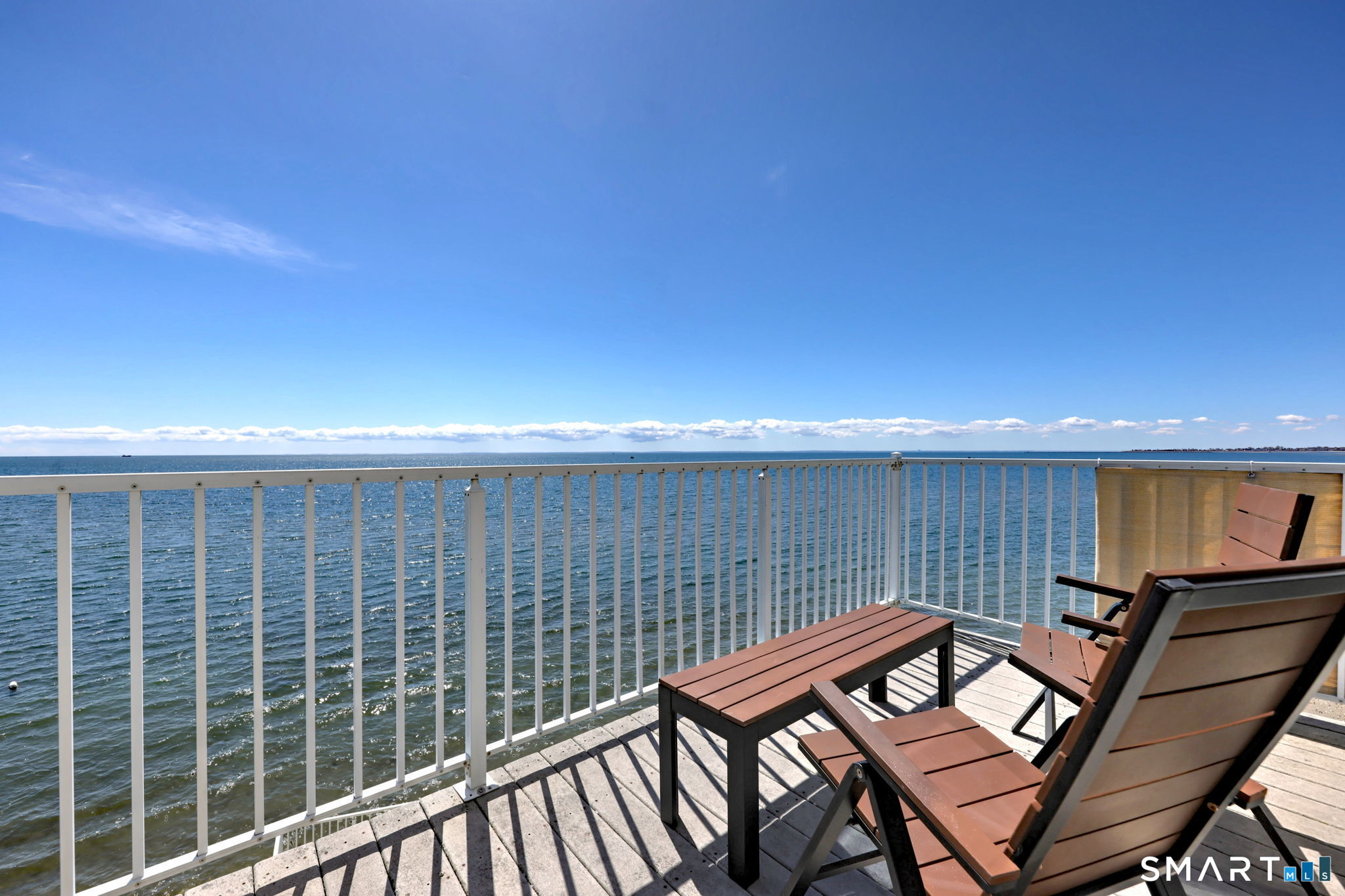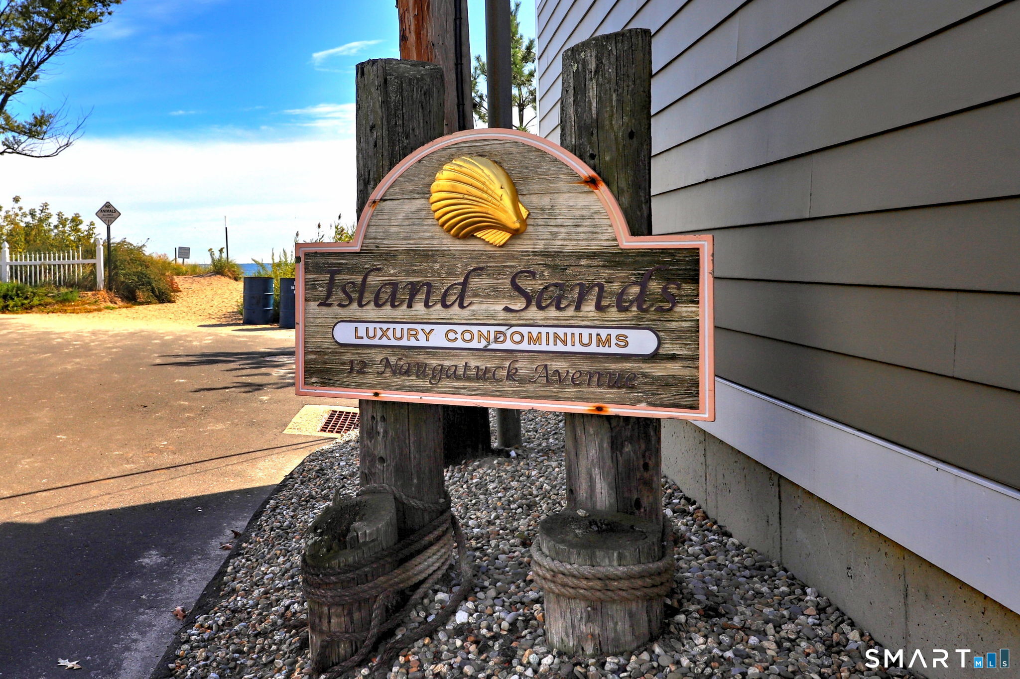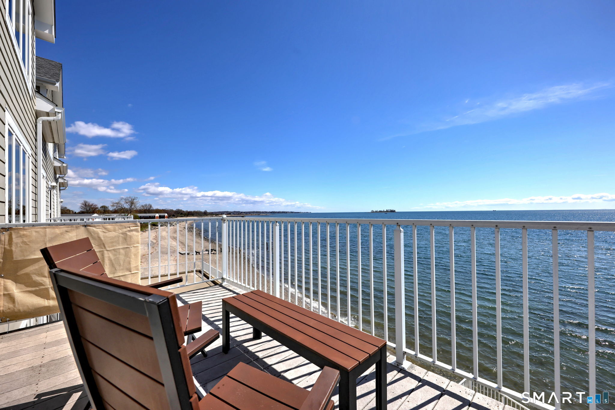 **DIRECT WATERFRONT CONDO - Private sandy beach and expansive waterside patio.** This perfectly positioned penthouse end unit offers sweeping, unobstructed views of Long Island Sound and Charles Island. The main level features a bright, open-concept living room with stunning water views, hardwood floors, custom built-ins, and direct access to the waterside balcony. The eat-in kitchen includes granite countertops, high-end appliances, abundant cabinetry, and a picturesque window over the sink framing the water. It flows seamlessly into the dining area, which also enjoys beautiful shoreline views. A full bath completes the main level. Upstairs, the luxurious primary suite captures breathtaking water views and includes a generous walk-in closet with floor-to-ceiling built-ins. The beautifully updated spa-like bath features a glass-enclosed shower, whirlpool tub, double vanity, tile flooring, and serene, unobstructed water views. A spacious home office is located just off the primary suite, also offering its own water view. With ample room for a futon or daybed, this flexible space can easily serve as a guest room. Island Sands Condominiums are ideally situated in the heart of the sought-after Walnut Beach neighborhood-a vibrant coastal community where you can stroll miles of sandy shoreline and enjoy nearby shops, cafes, and an ice cream parlor.