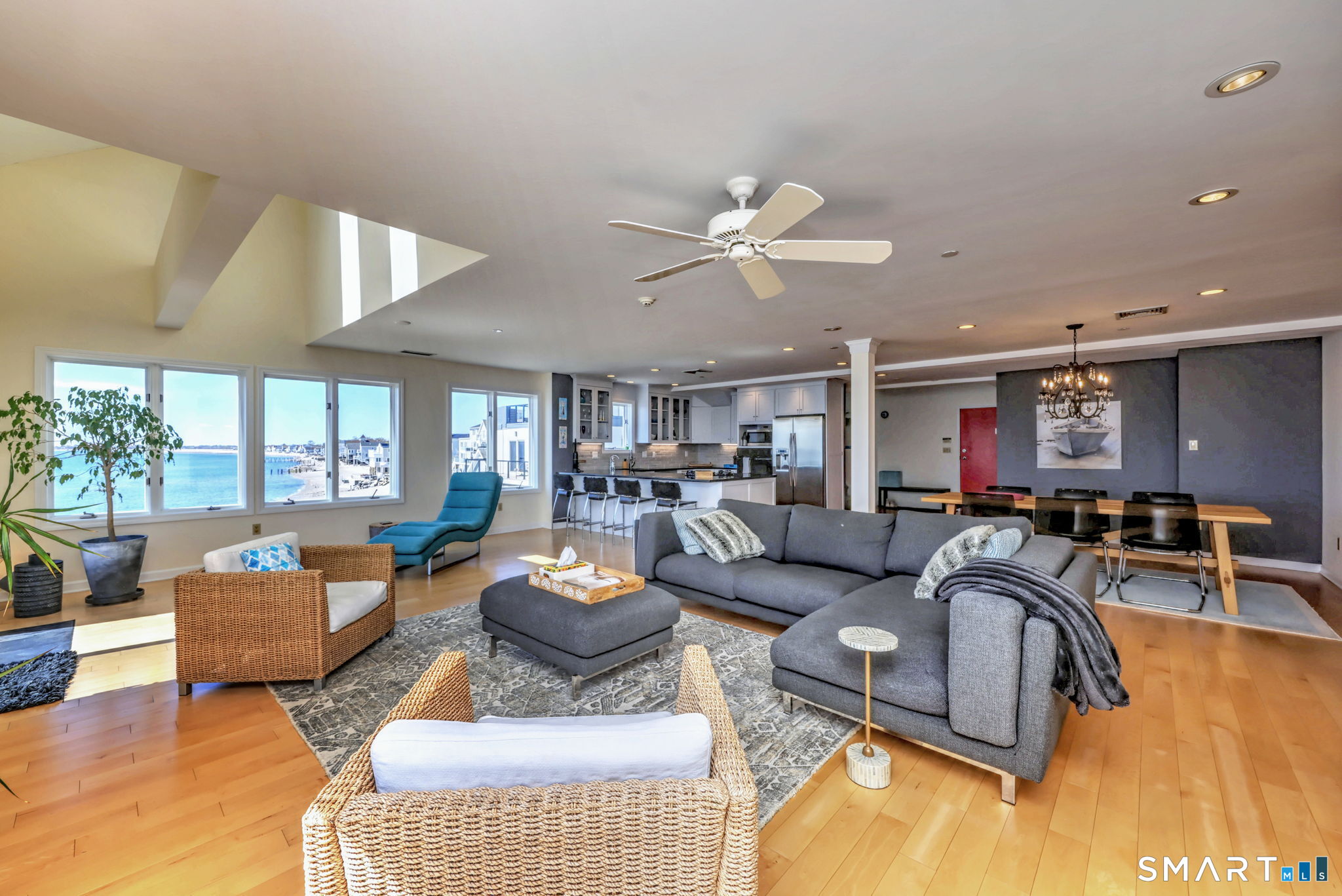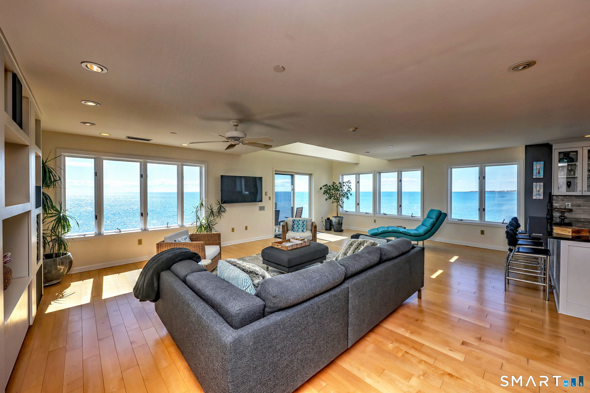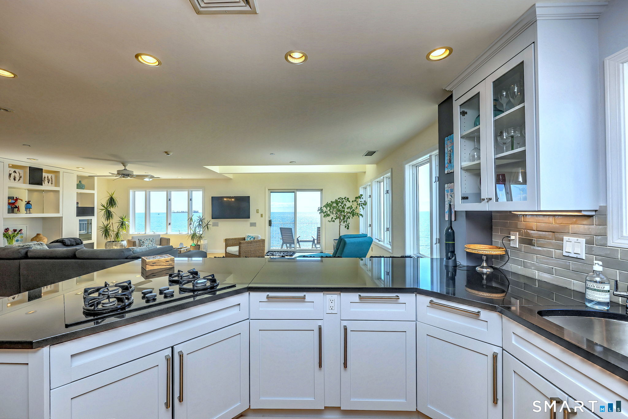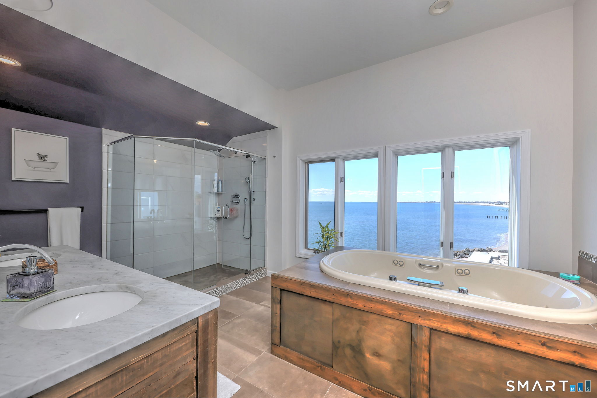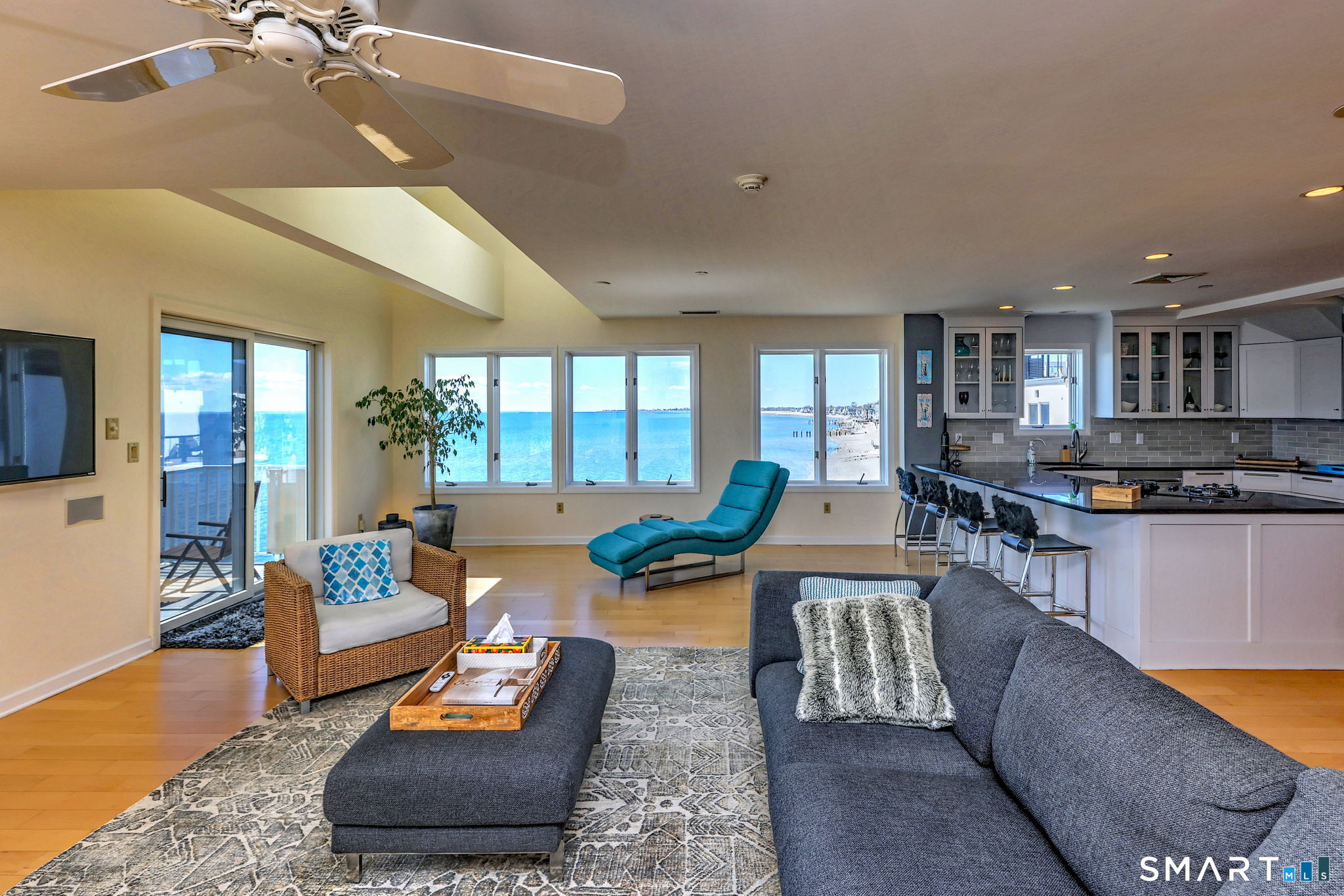 **DIRECT WATERFRONT CONDO - Private sandy beach and expansive waterside patio.** This perfectly positioned penthouse end unit offers sweeping, unobstructed views of Long Island Sound and Charles Island. The main level features a bright, open-concept living room with stunning water views, hardwood floors, custom built-ins, and direct access to the waterside balcony. The eat-in kitchen includes granite countertops, high-end appliances, abundant cabinetry, and a picturesque window over the sink framing the water. It flows seamlessly into the dining area, which also enjoys beautiful shoreline views. A full bath completes the main level. Upstairs, the luxurious primary suite captures breathtaking water views and includes a generous walk-in closet with floor-to-ceiling built-ins. The beautifully updated spa-like bath features a glass-enclosed shower, whirlpool tub, double vanity, tile flooring, and serene, unobstructed water views. A spacious home office is located just off the primary suite, also offering its own water view. With ample room for a futon or daybed, this flexible space can easily serve as a guest room. Island Sands Condominiums are ideally situated in the heart of the sought-after Walnut Beach neighborhood-a vibrant coastal community where you can stroll miles of sandy shoreline and enjoy nearby shops, cafes, and an ice cream parlor.