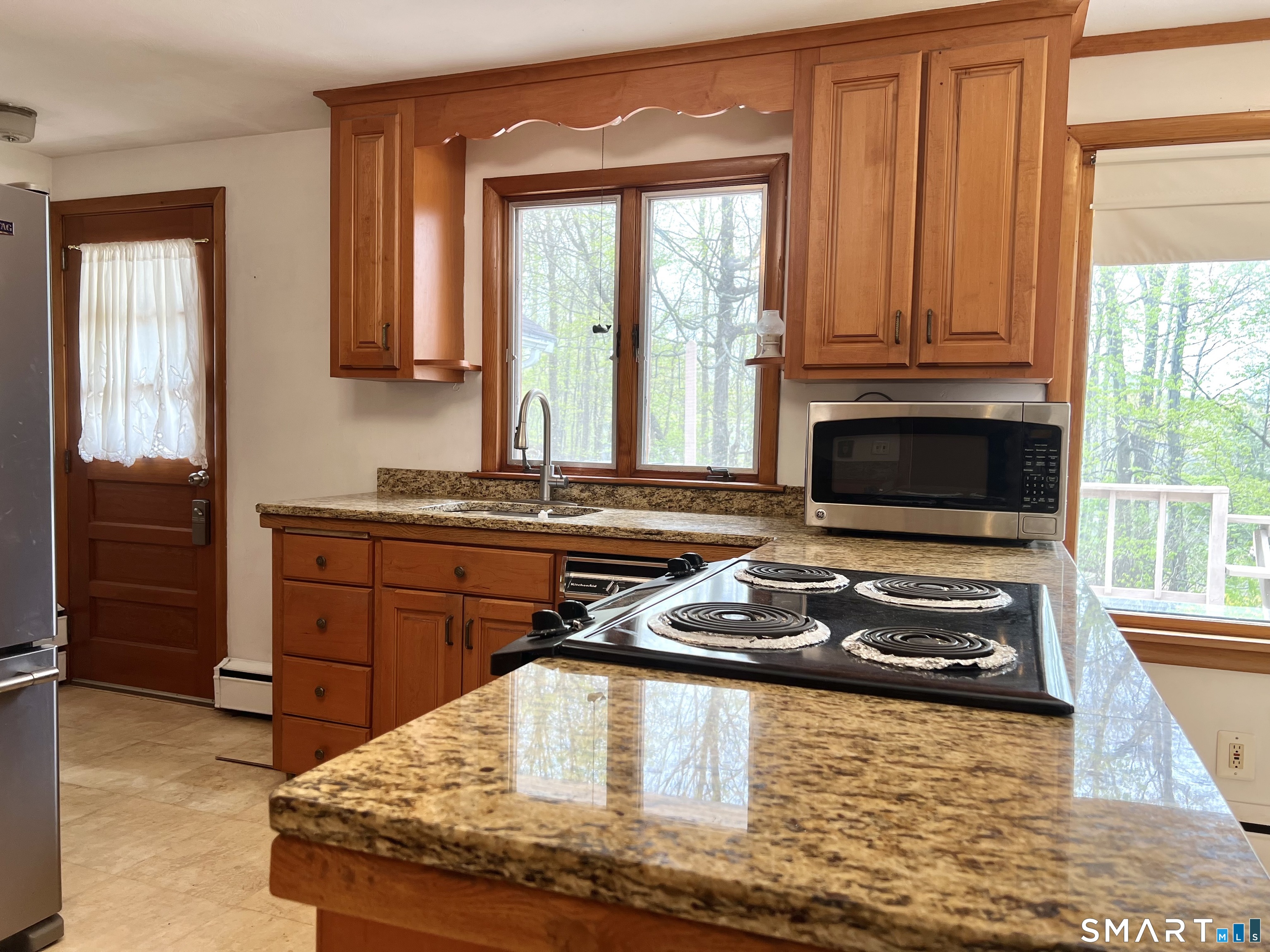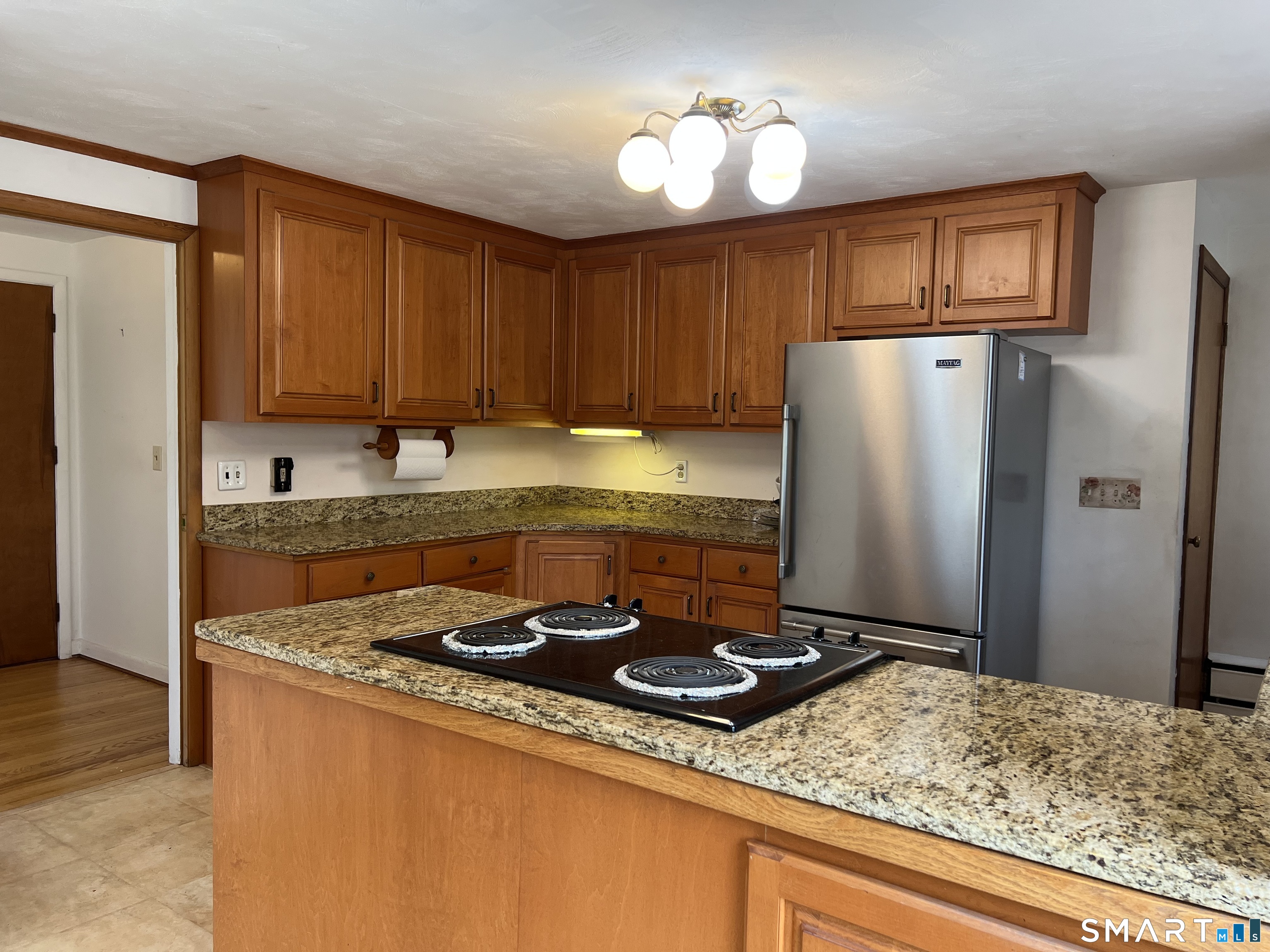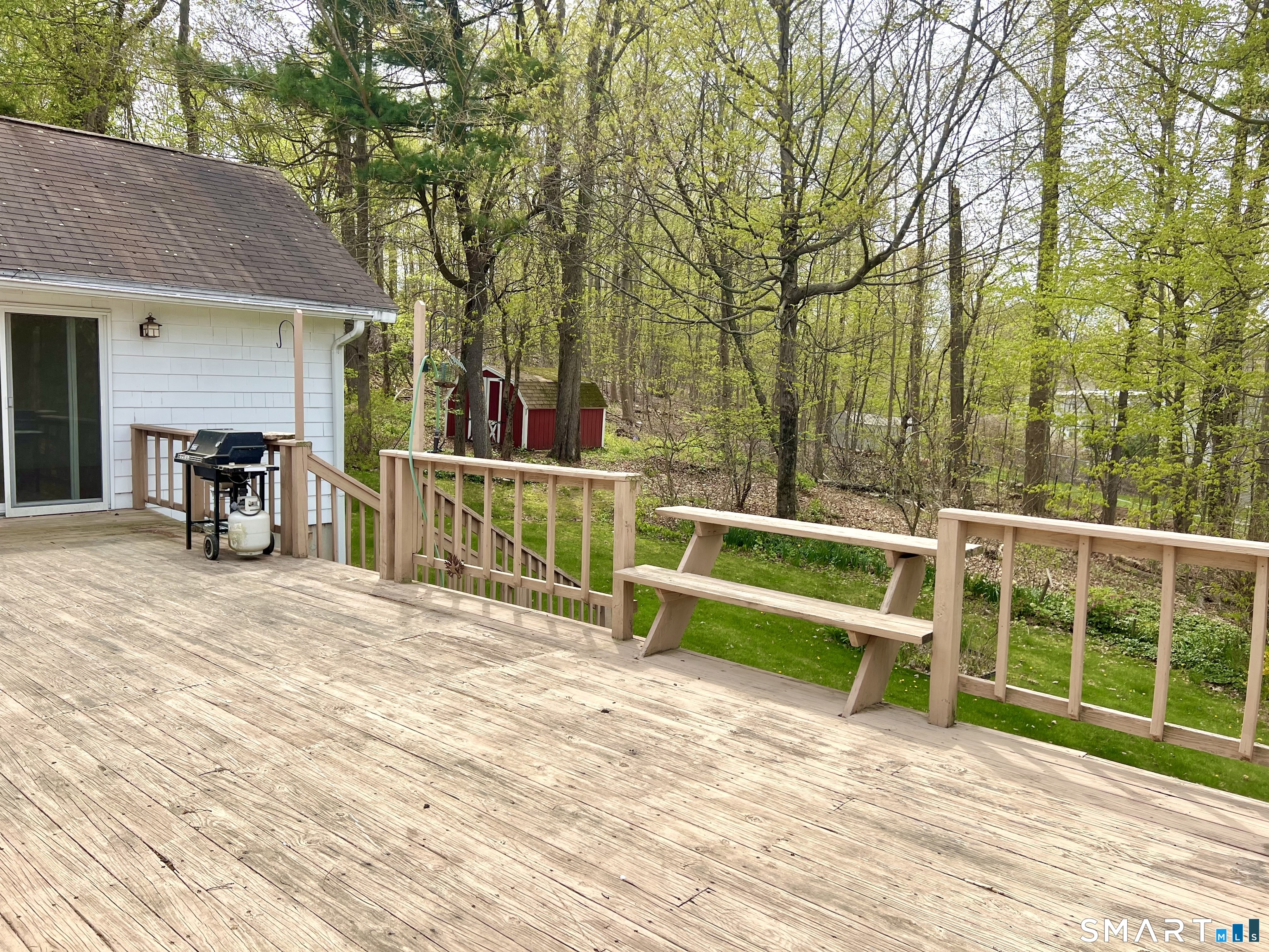 Lovely L-shaped ranch in a highly desirable neighborhood featuring a master addition ensuite with a spacious bedroom, vaulted ceilings, walk-in closet with pocket door, full bath with jacuzzi tub and stand-up shower, and sliders to a deck that overlooks flowering trees and excellent neighborhood views. The home offers a generous living room with fireplace, formal dining room with chandelier, and big picture windows that flood the space with light and showcase the scenery from all angles. The eat-in kitchen includes granite counters, generous amount of oak cabinets, a pantry, a picture window, and a convenient door to the deck. Two additional bedrooms on the main level, a second full bath with tub and separate shower, and hardwood floors flow throughout with tile in the bathrooms; a walk-in cedar closet on the main level is a delightful surprise. The lower level can easily be converted into an in-law apartment and currently features a family/rec room, a large room with French doors and laminate floors suitable for a bedroom, media room, or second family room, another room with a wood stove and private exterior access, a half bath, laundry, and garage access. updated mechanical, are all Sited on a corner lot with a nice yard and perennial gardens, this home awaits a few personal touches to make it simply amazing. The Home is being sold "In As Is Condition", come and see why you will want this house to be your Home Sweet Home.