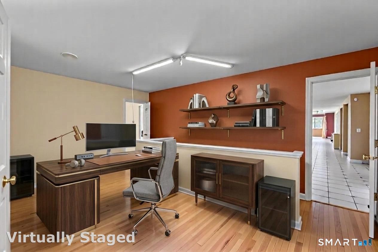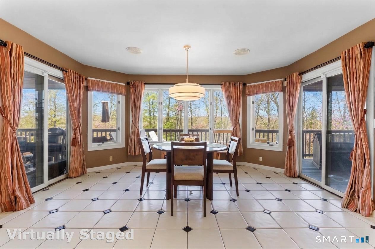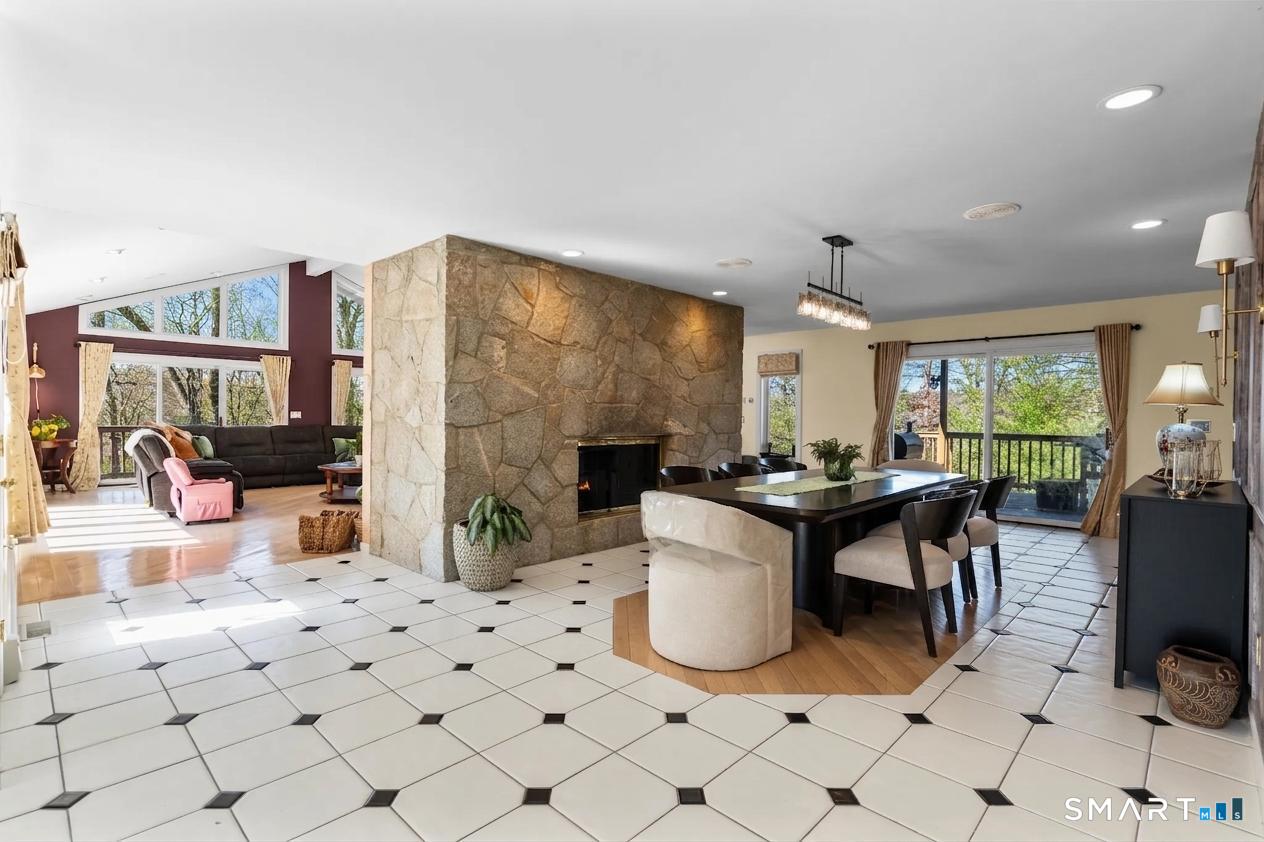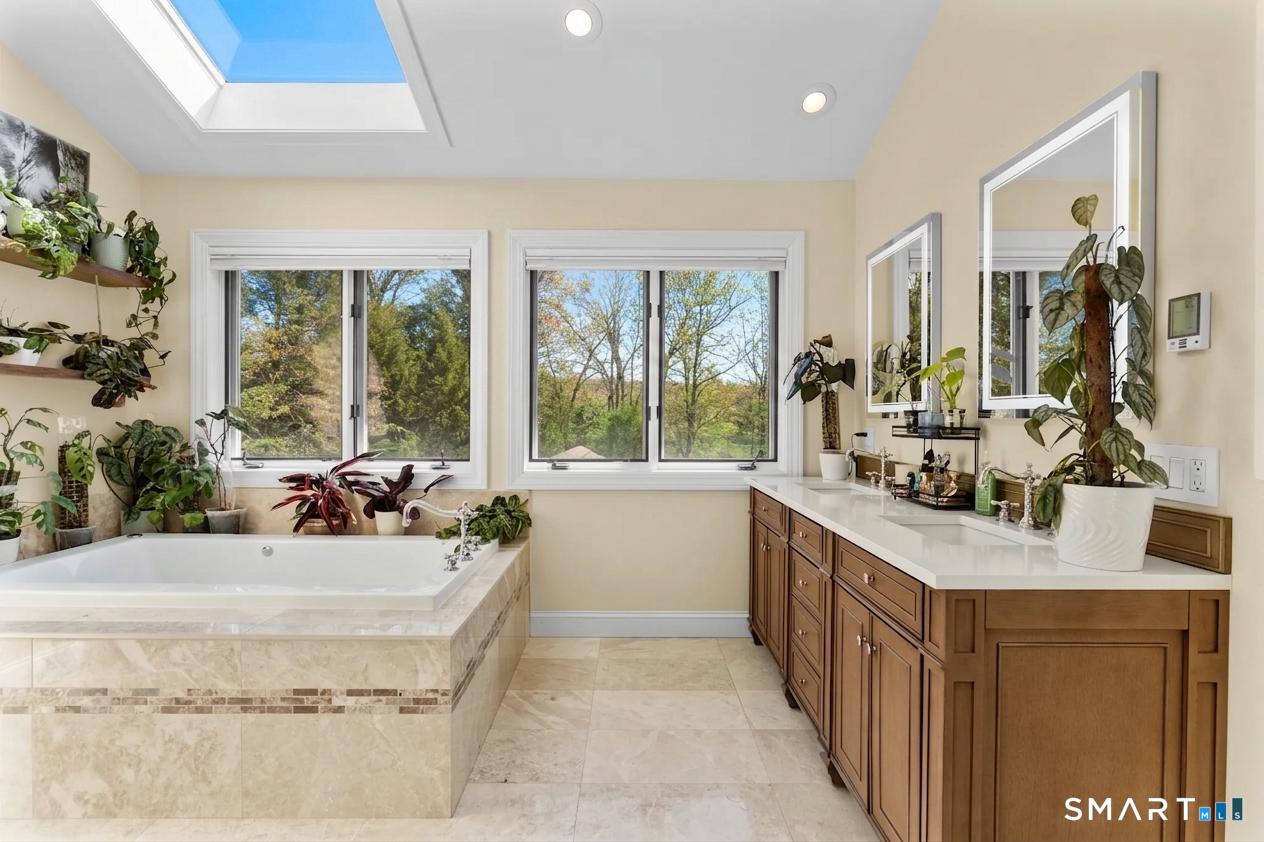 Tucked away at the top of a private Monroe cul-de-sac, this one-of-a-kind custom contemporary is the definition of elevated living. From the moment you arrive, the lighted driveway, lush landscaping, and striking architectural design, featuring chalet-style windows, stone accents, and multiple balconies, set a tone of privacy, prestige, and escape. Step inside and experience soaring vaulted ceilings, dramatic natural light, and a seamless open layout designed to impress. The show-stopping great room flows effortlessly into a dining space anchored by a floor-to-ceiling stone fireplace and access to a raised cedar deck, perfect for unforgettable entertaining or quiet luxury evenings. The updated eat-in kitchen, along with a main-level bedroom, full bath, and additional living space, offers both style and flexibility. Upstairs, retreat to a stunning primary suite with vaulted ceilings, a walk-in closet, private balcony, and a spa-inspired marble bath featuring radiant heated floors, an oversized shower, jetted tub, and dual vanity. Additional bedrooms are spacious and thoughtfully designed, complemented by an updated bath and convenient second-floor laundry. The finished lower level completes the lifestyle with a wet bar, fireplace, full bath, and custom wine cellar, ideal for hosting, relaxing, and enjoying every moment at home. All of this, just minutes from Monroe's green, golf course, shopping, and dining, yet perfectly tucked away in your own private setting.