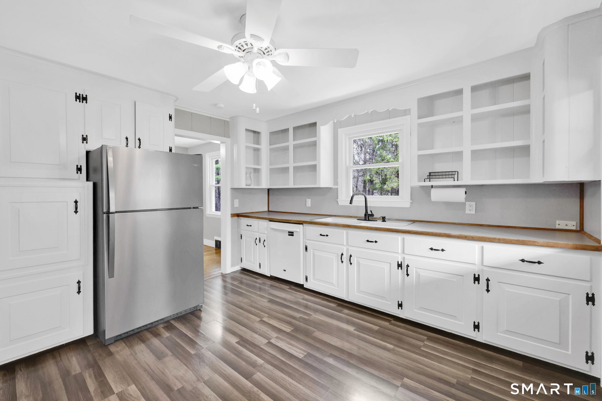 MOVE-IN READY CONDITION for this charming ranch style home set far back from the road on large 1.12 acre lot in the heart of South Windsor. Pride of ownership abounds with extensive, gleaming hardwood floors throughout most of the home. Spacious sun-filled living room with fireplace. White kitchen with stainless steel appliances. 2/3 bedroom, 1 bath home. Two generous-sized bedrooms plus FULLY REMODELED BATHROOM. Dining room with closet could be used as potential 3rd bedroom option or office/flex space. Lower level offers finished family room with fireplace, as well as plenty of storage or expansion potential. Updated Harvey vinyl thermopane windows. Open and functional yard with storage shed. Situated in the ELI TERRY ELEMENTARY SCHOOL DISTRICT. Convenient to Rye Street Park, Topstone Golf Course, Willowbrook Driving Range, Evergreen Walk, Buckland Mall, Costco, Whole Foods, Club Studio and area highways.