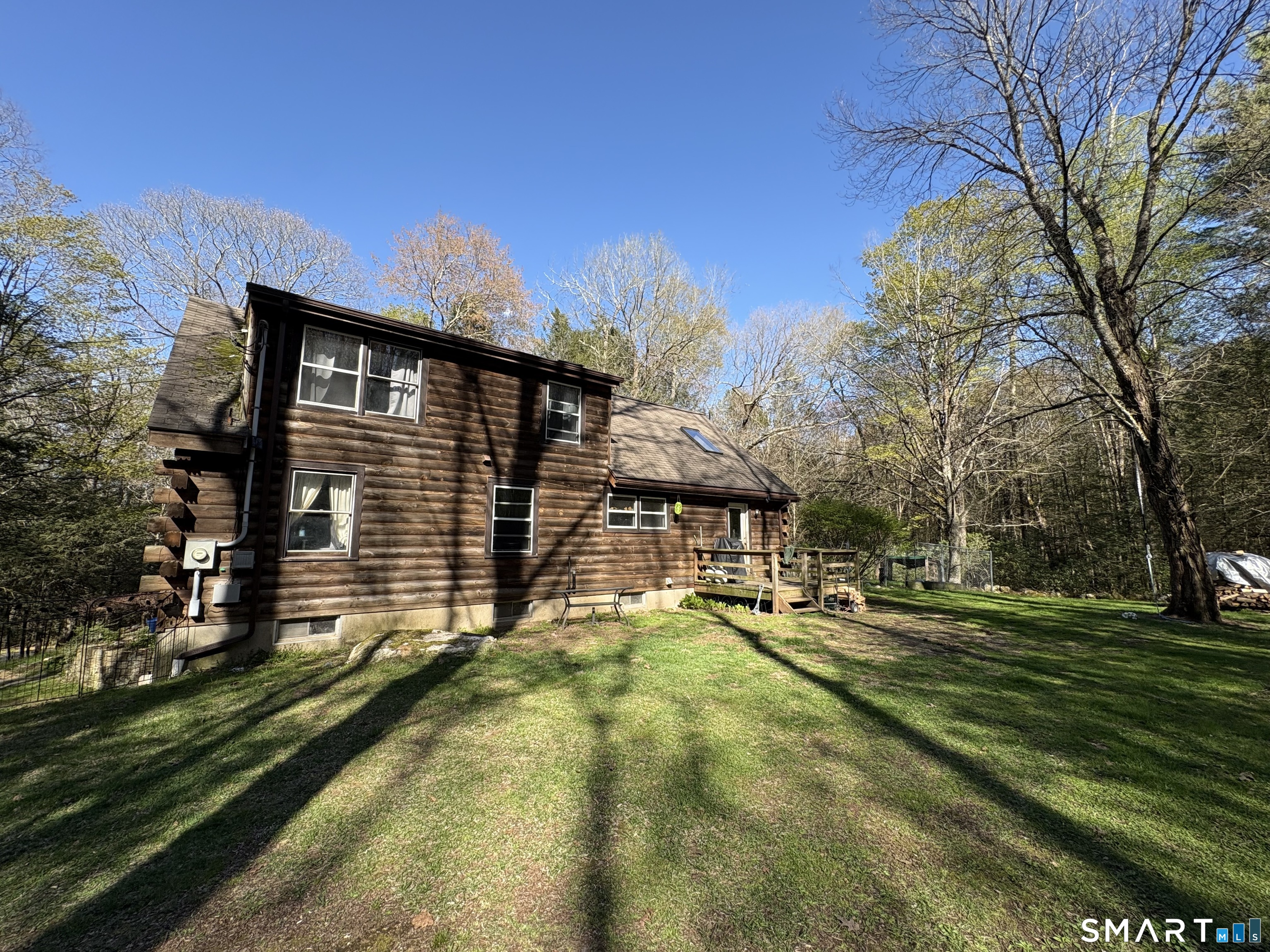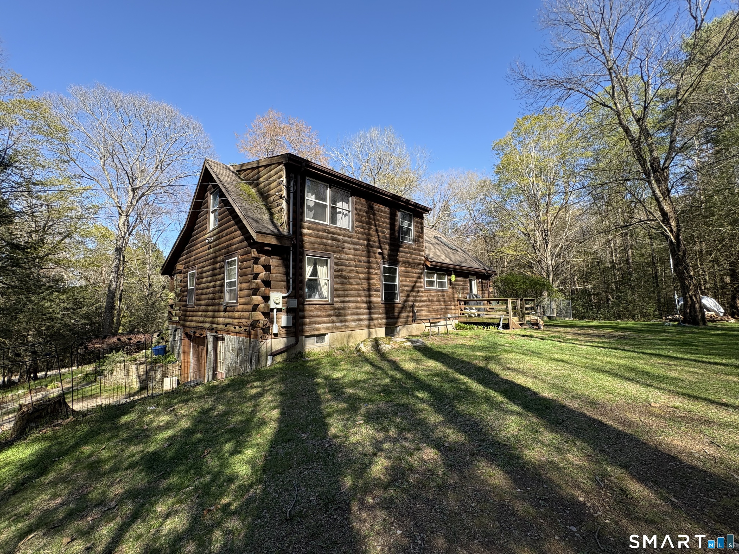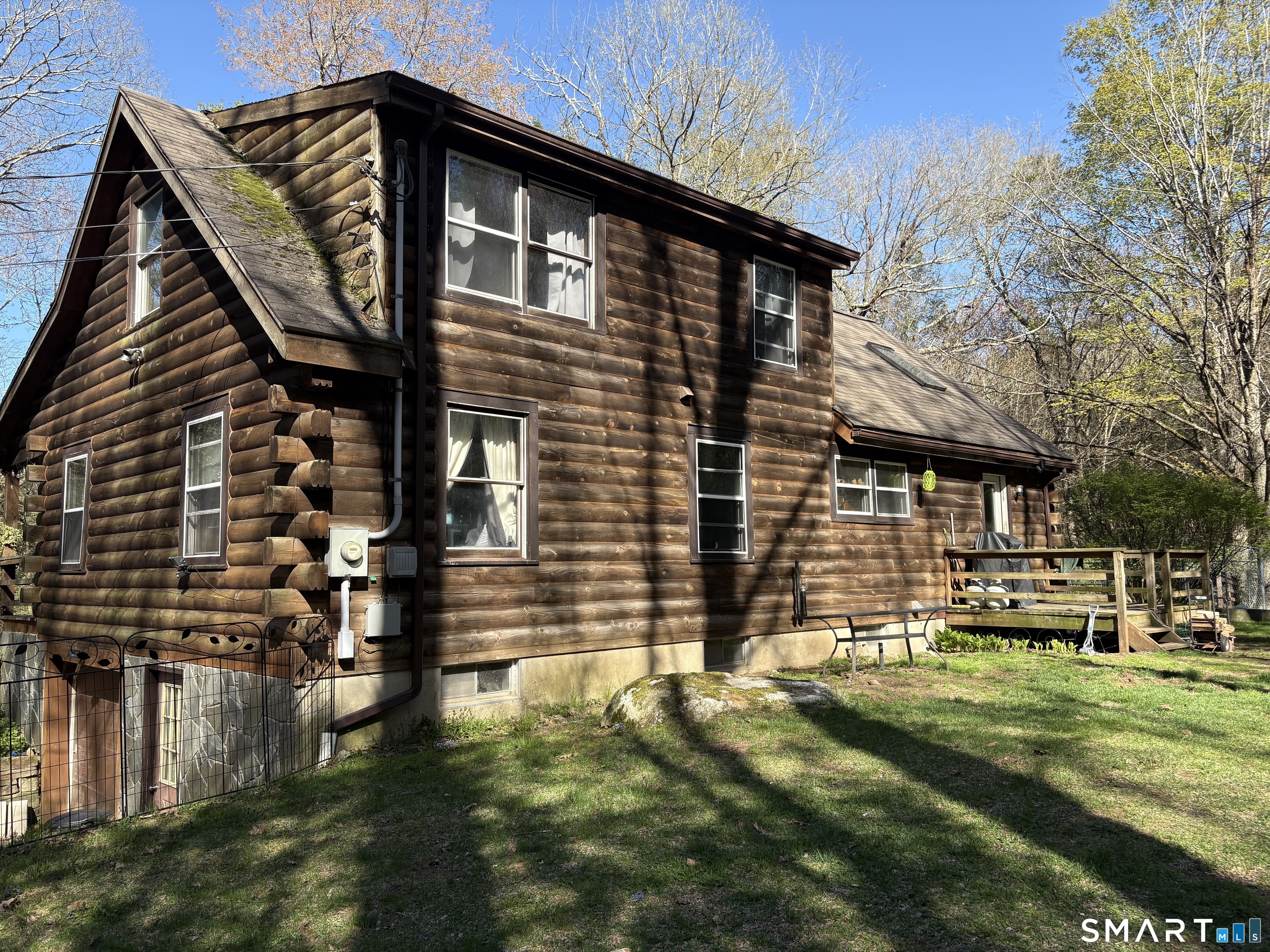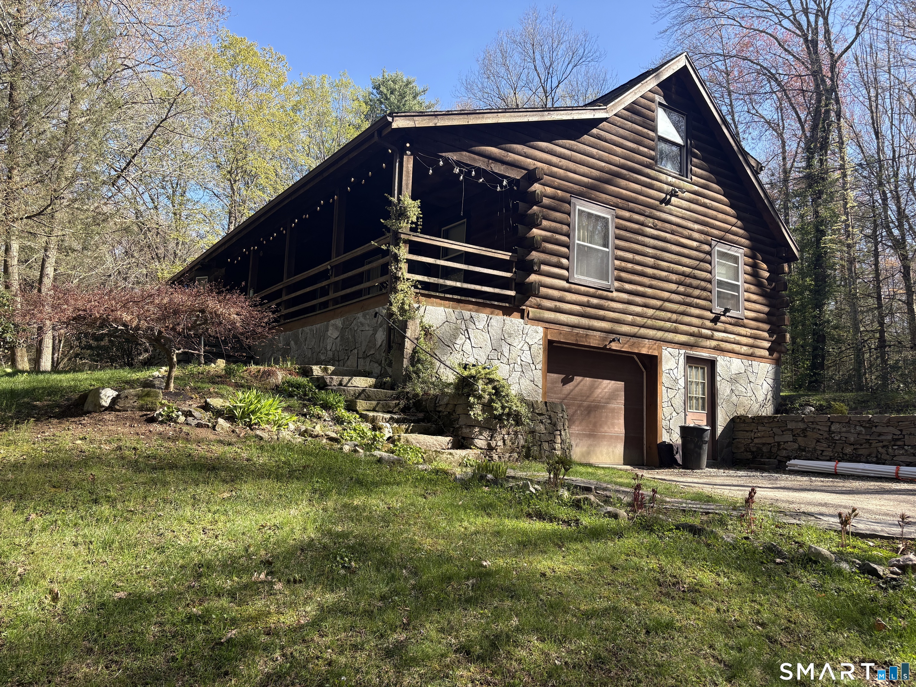 Escape to the woods in this enchanting log-style Cape nestled on 3.5 private, treed acres. Perfectly blending rustic character with modern potential, this 1985-built retreat offers a serene lifestyle in the heart of Hartland. Step inside to a dramatic living room featuring soaring cathedral ceilings and a warm, inviting atmosphere. The unique layout includes a private upper-level master suite with an open balcony overlooking the living area, providing a loft-like feel while maintaining a quiet sanctuary. The main floor offers a flexible floor plan with two additional bedrooms and a potential office space-ideal for remote work or guest accommodations. The full walk-out basement provides ample opportunity for a recreation room, workshop, or additional storage, and features a convenient under-house 1-car garage. Enjoy quiet mornings on your open front porch taking in the sights and sounds of nature. With its expansive wooded lot and peaceful setting, this home is a rare find for those seeking a true getaway without sacrificing convenience. With a little TLC, you can enjoy nature's setting at its best! Sold As-Is.