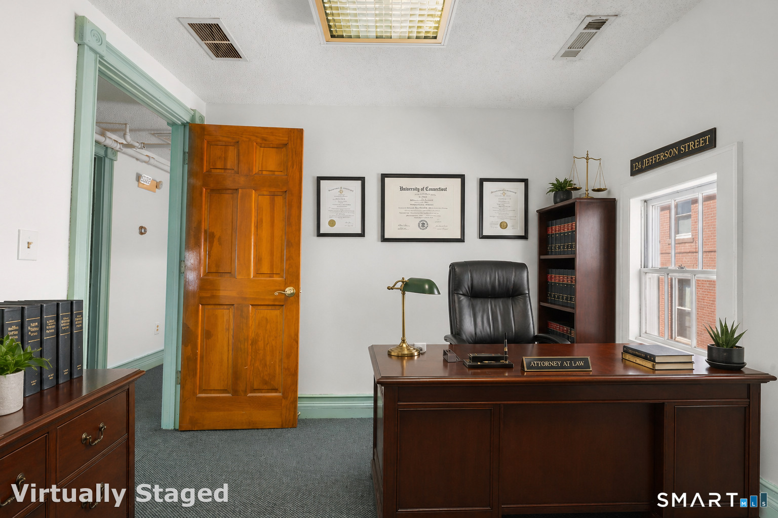 Office suites available for lease at 124 Jefferson Street in Hartford, CT, directly across from Hartford Hospital, a major medical hub generating constant daily foot traffic. Flexible lease terms available, all utilities included, with tenants responsible for Wi-Fi only. This 3,375 SF, three-story building features 3rd-floor office suites with flexible layouts, including adjoining spaces that can be combined, making it ideal for medical, wellness, legal, and professional service users. The building offers private office suites within a character-filled setting featuring natural woodwork, stained glass, and a professional layout, along with on-site parking. Located in a high-traffic corridor surrounded by medical offices, legal institutions, and government buildings-including nearby courthouses and the Capitol-this property provides strong visibility, accessibility, and a built-in client base. Offices are available from $300 to $1,000 per month, offering flexible options for startups and established businesses alike, making this a rare opportunity to secure affordable space in one of Hartford's most consistently active locations.