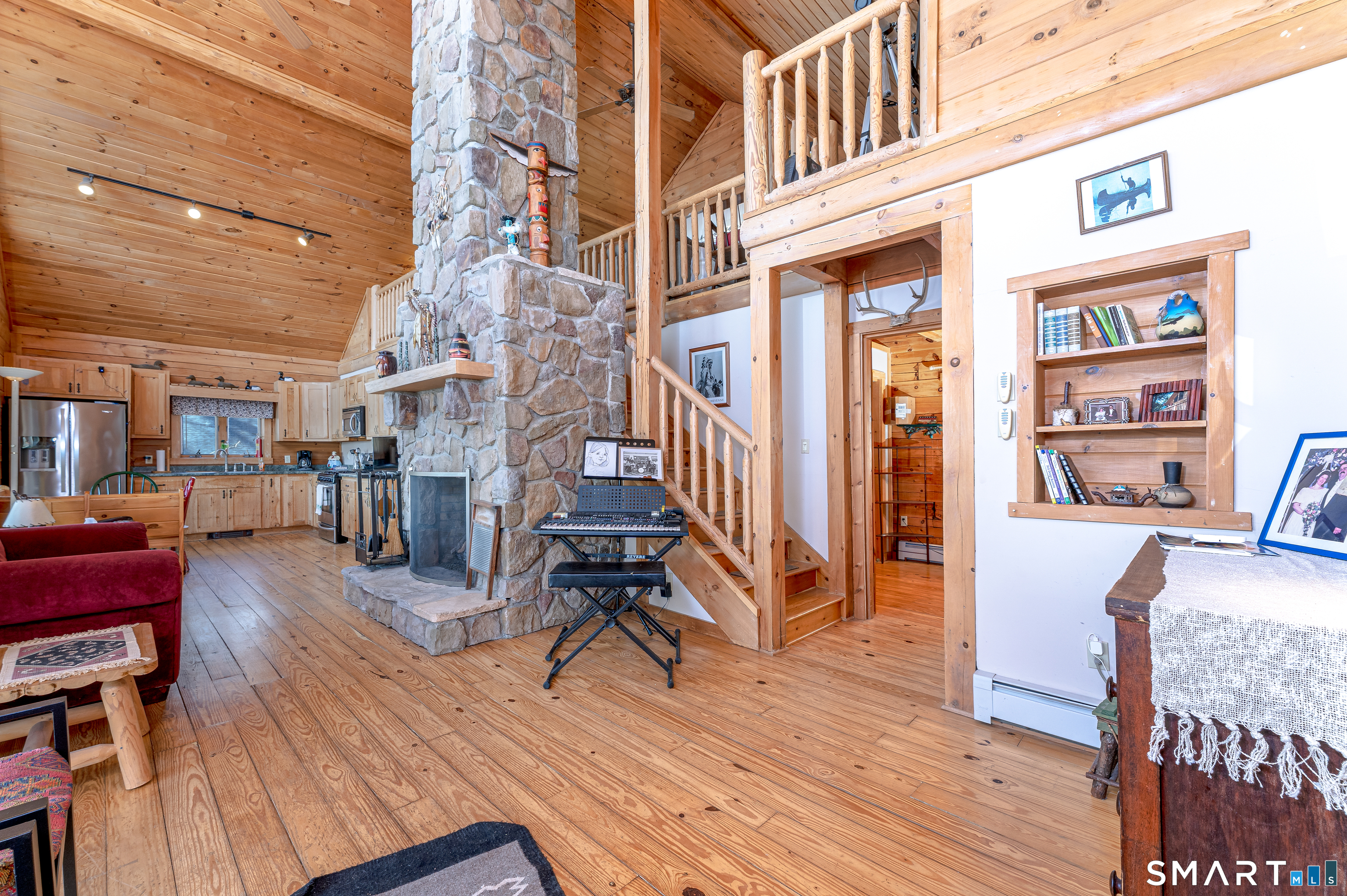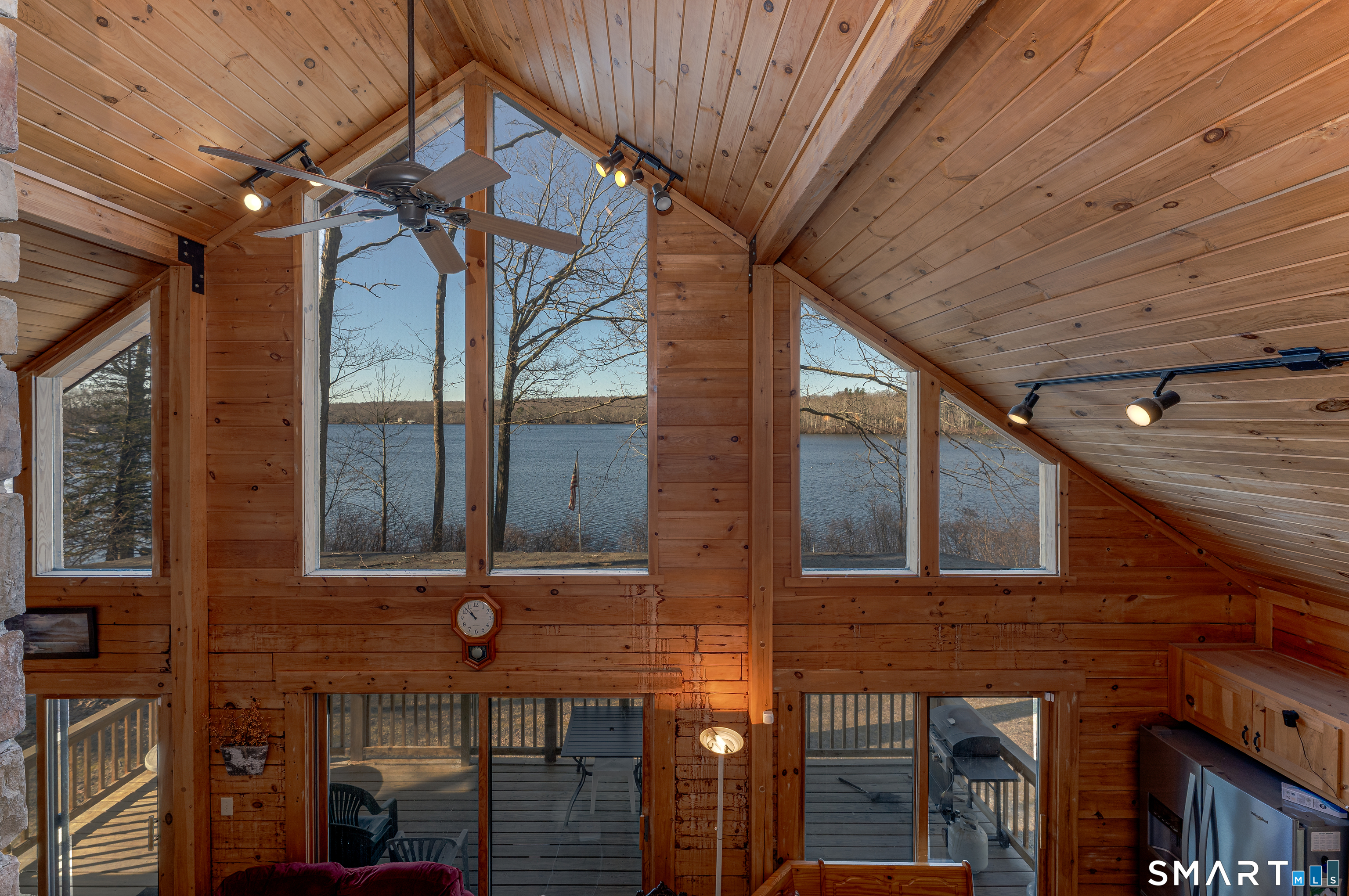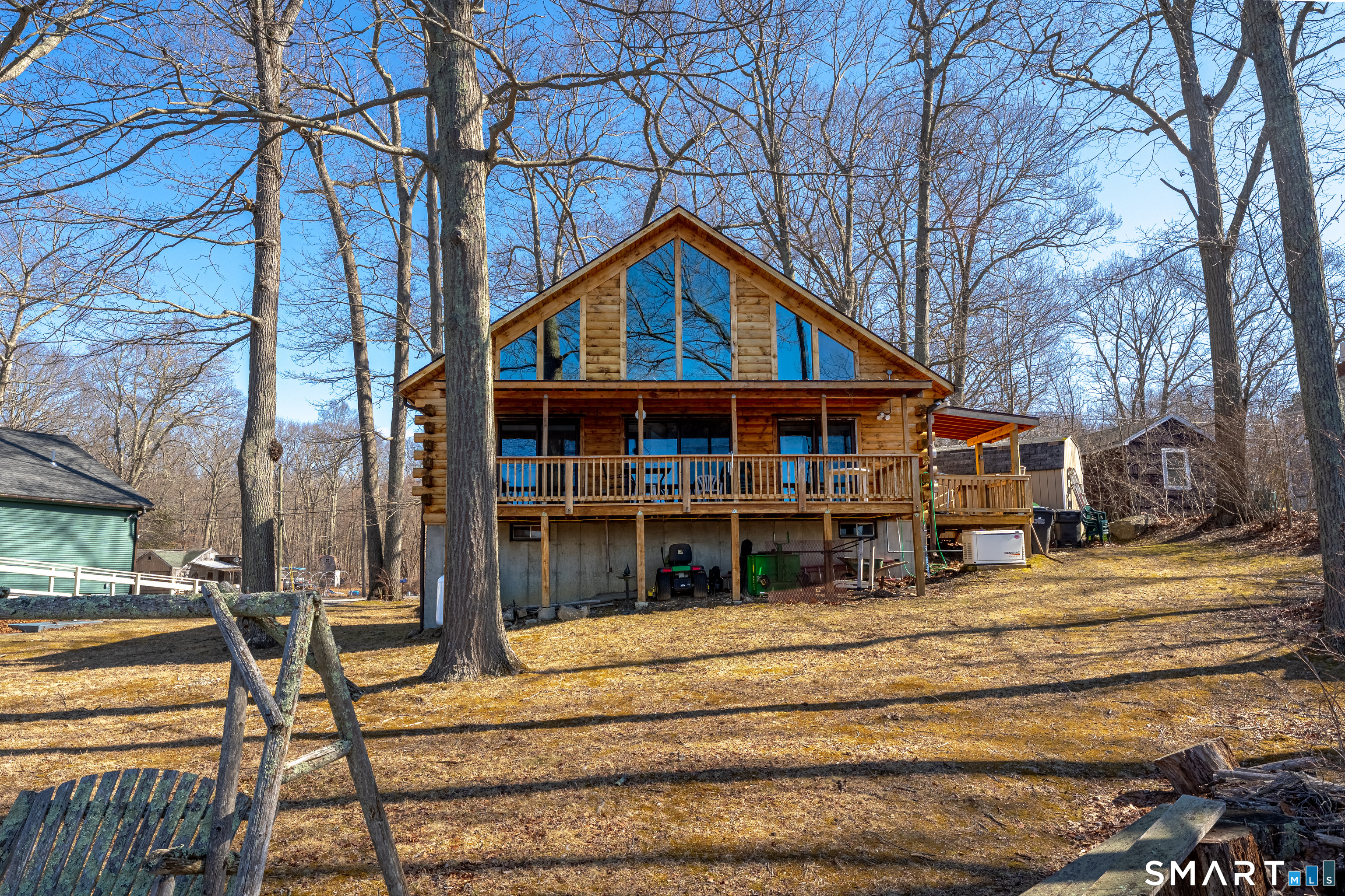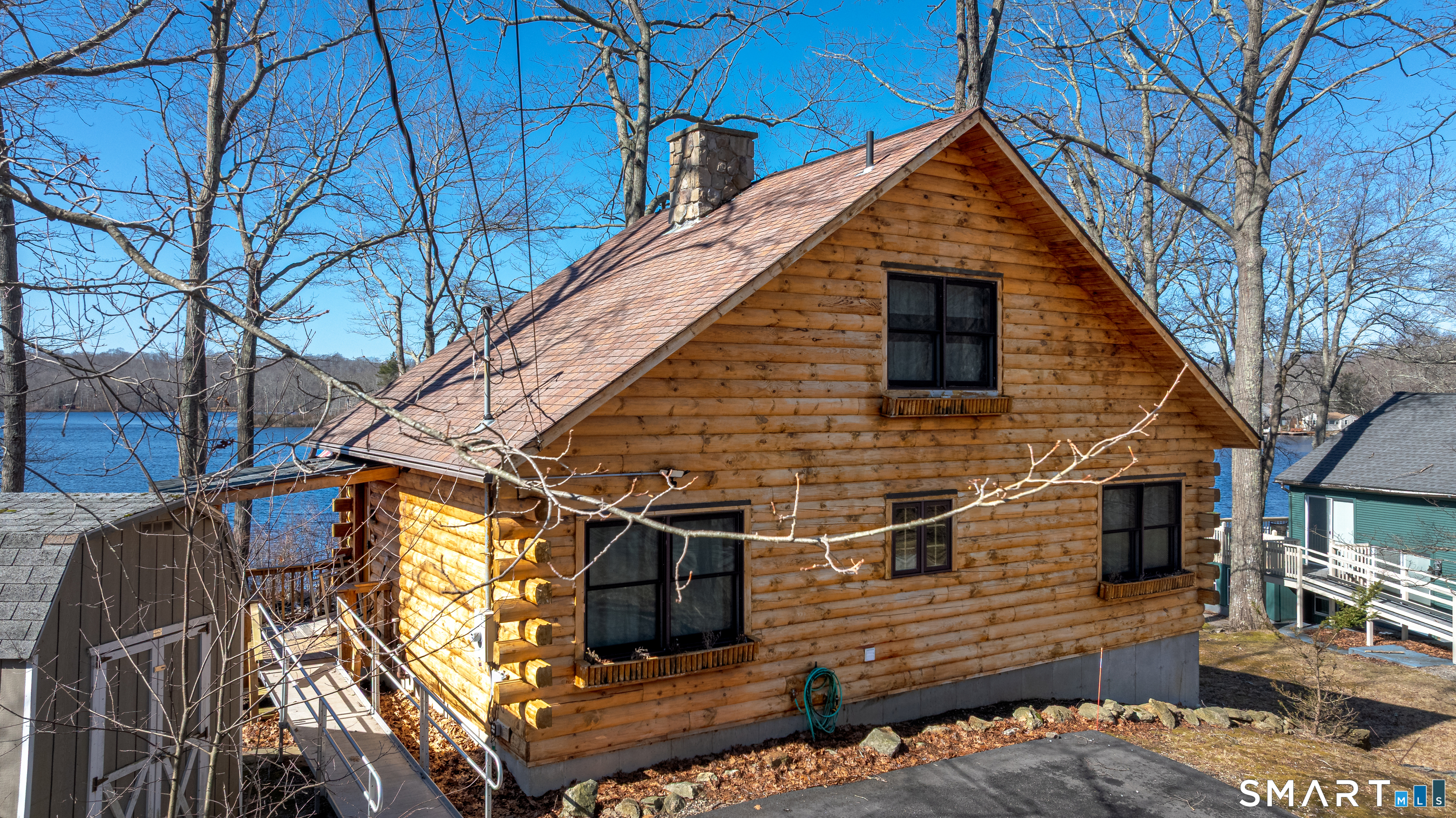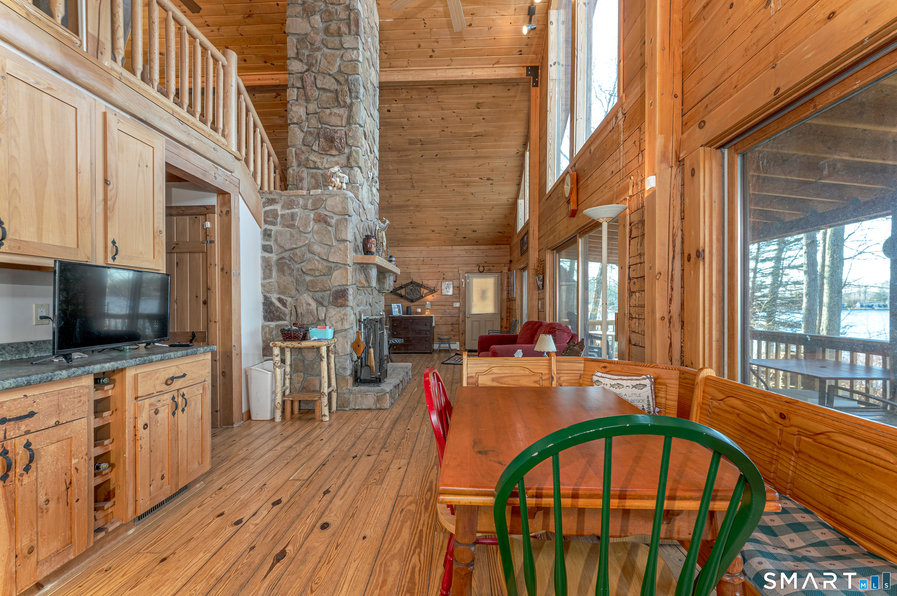 Welcome to your own private lakeside retreat, where rustic charm meets breathtaking waterfront living in this beautifully crafted log cabin set directly on the lake. From the moment you arrive, the warm natural wood exterior and serene setting create an inviting escape that feels like a year round vacation. Inside, soaring cathedral ceilings and stunning two story windows in the living room flood the space with natural light while perfectly framing picturesque water views. The open concept layout features rich hardwood floors and a striking stone fireplace that anchors the space with cozy character. The kitchen offers stainless steel appliances and sliders leading out to a covered deck, making indoor outdoor living seamless and ideal for entertaining or simply soaking in the peaceful surroundings. The loft above provides a versatile space perfect for a potential third bedroom or additional living area. The lower level expands your living space with a workshop and a full home office featuring walkout access to the lake. Enjoy your morning coffee or unwind in the evening on the expansive covered deck overlooking the water, surrounded by nature and tranquility. Additional highlights include central air, a removable wheelchair ramp at the front of the home, and a Generac whole house generator for added peace of mind. With direct lake access, this is a rare opportunity to own a true waterfront getaway that blends charm, comfort, and lifestyle in one exceptional property.